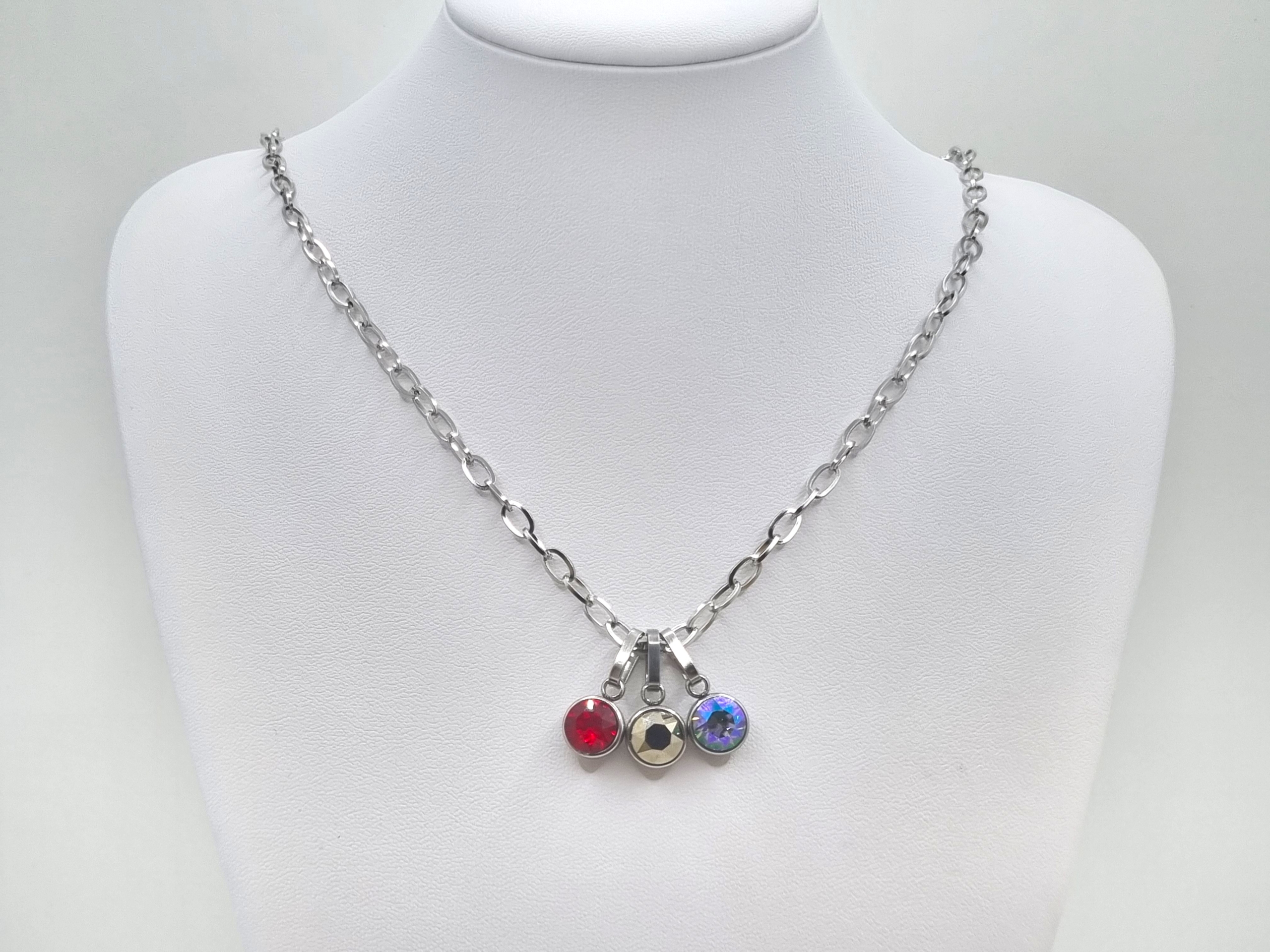 Verleihe deinem Look einen Hauch von Eleganz mit dieser hochwertigen Edelstahl-Gliederkette, die durch ihre drei auswechselbaren Chaton-Anhänger überzeugt. Du erhältst die Anhänger in den faszinierenden Farben Light Siam, Paradise Shine und Jet Hematit, die jedem Outfit das gewisse Etwas verleihen.