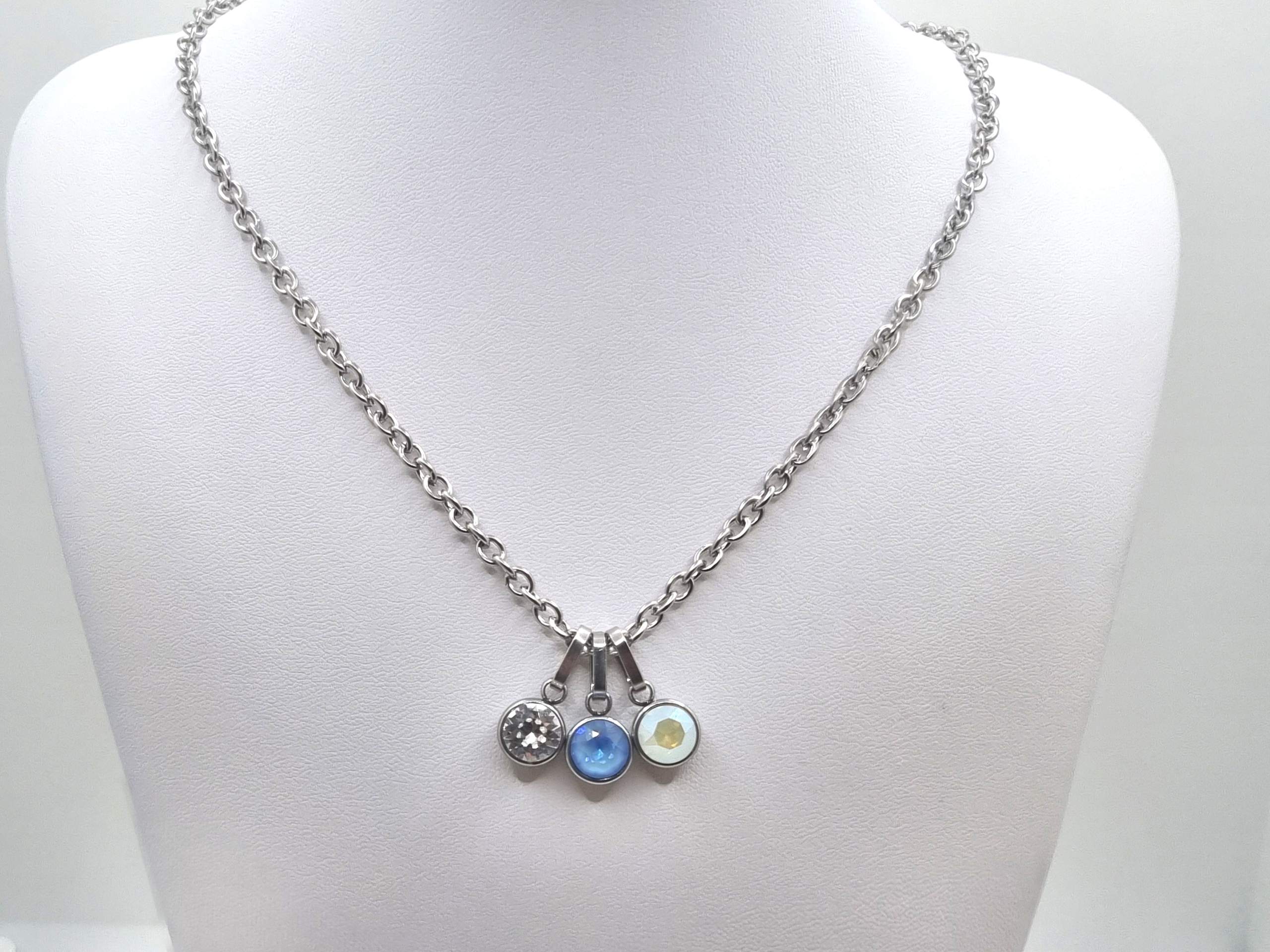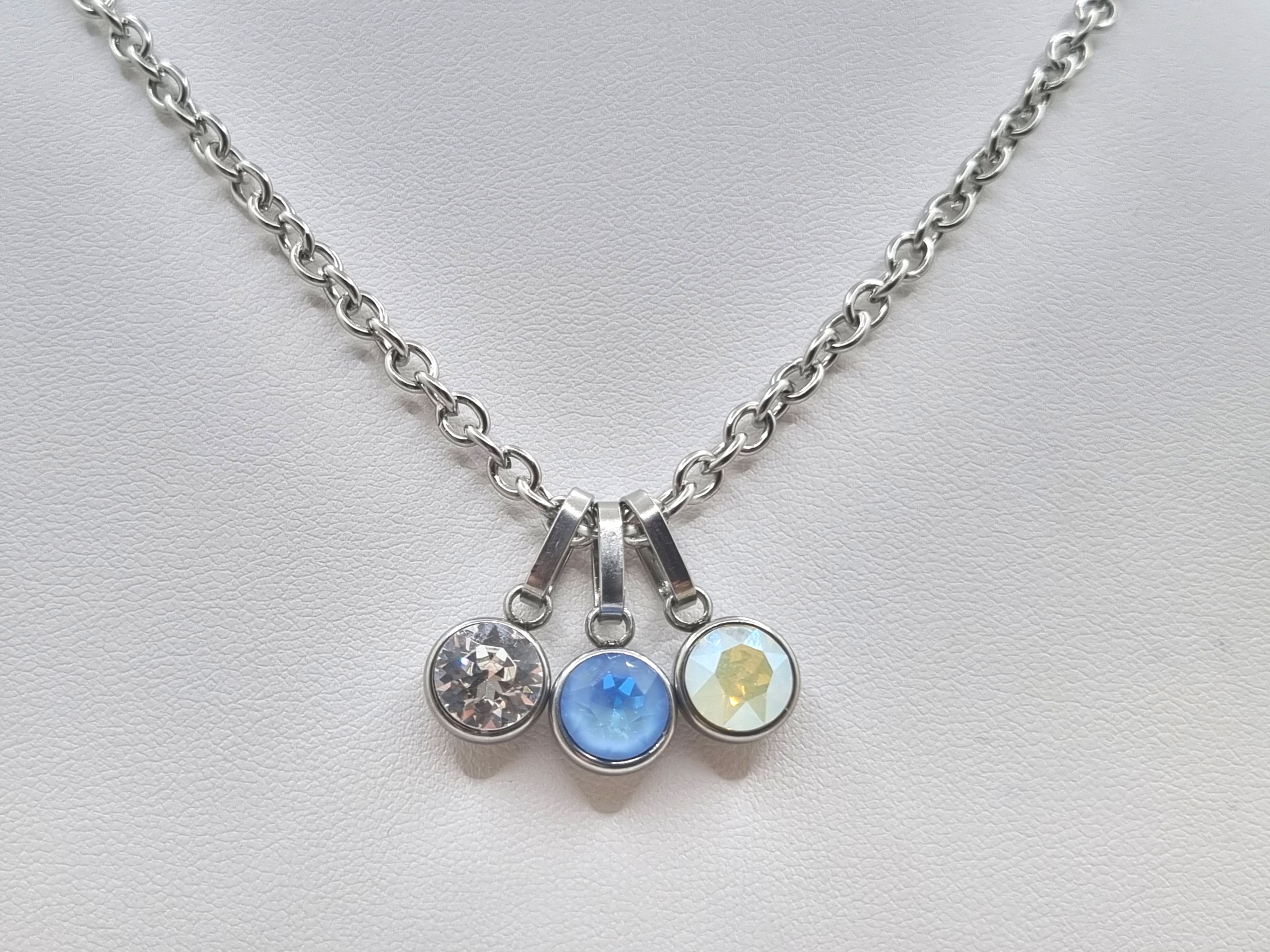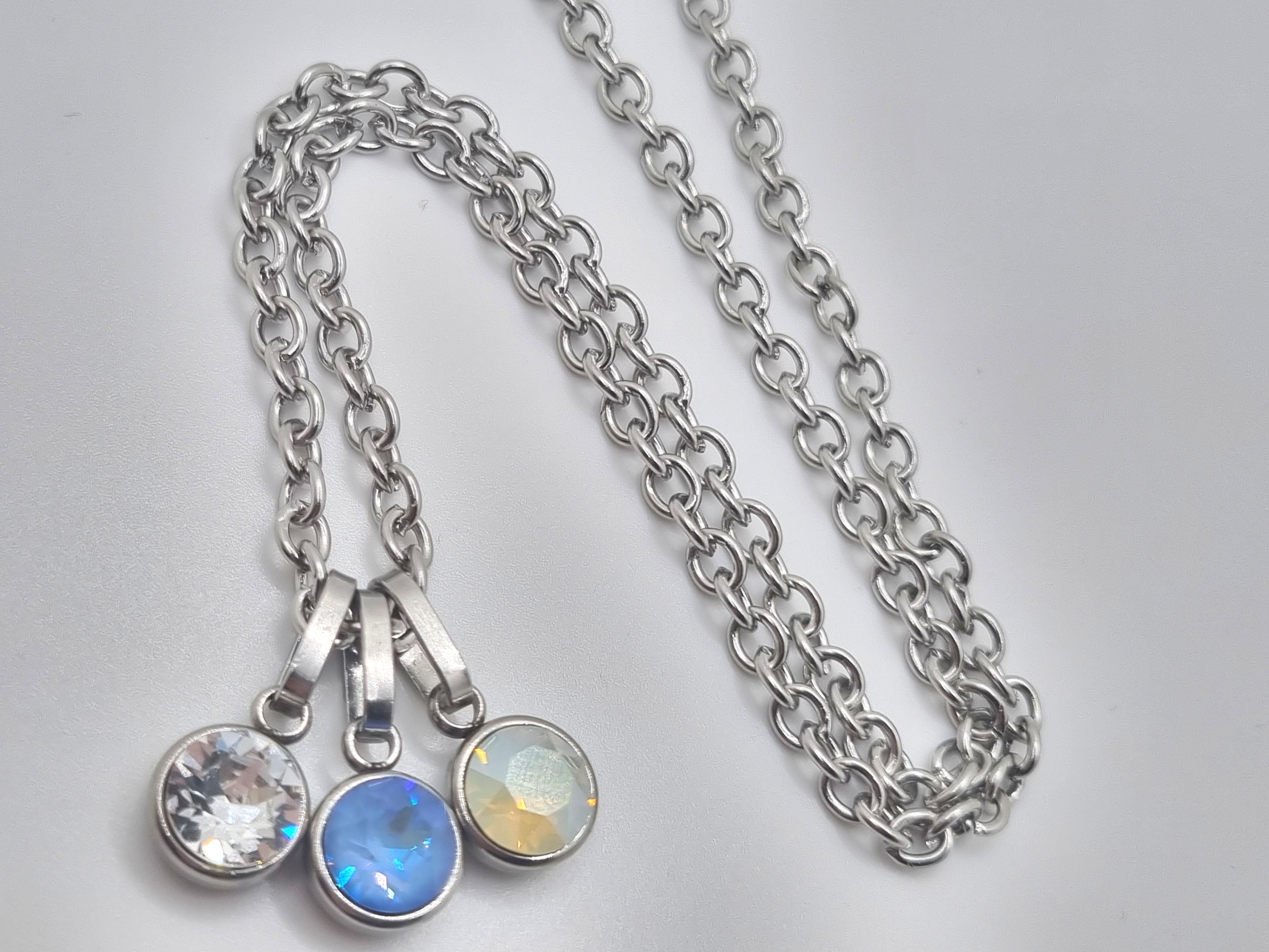 Entdecke die elegante Edelstahlkette mit 3 unterschiedlichen Chaton Anhänger! Diese hochwertige Kette ist aus robustem Edelstahl gefertigt und wird durch glamouröse 8mm großen Chaton-Anhänger in den Farben Ocean DeLite, Crystal und White Opal Moonlight veredelt. Das schlichte, aber dennoch auffällige Design macht sie zum perfekten Accessoire für jeden Anlass.