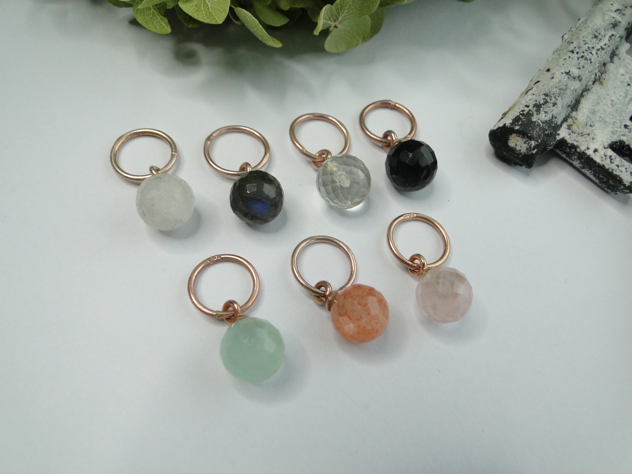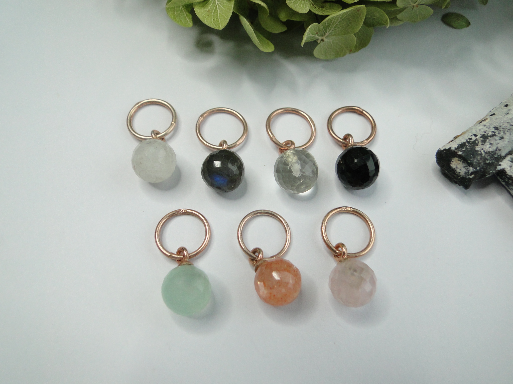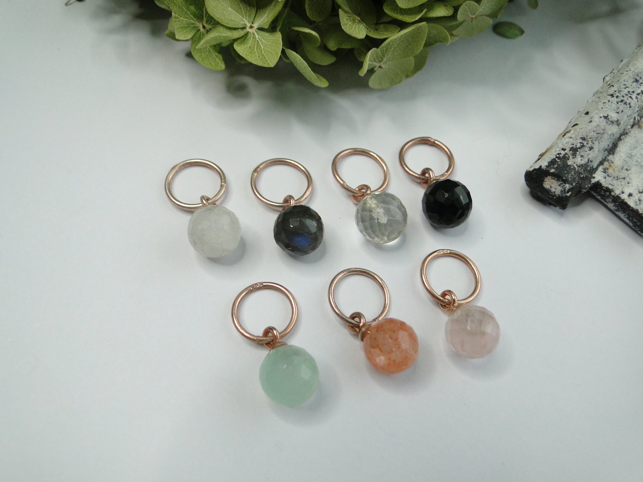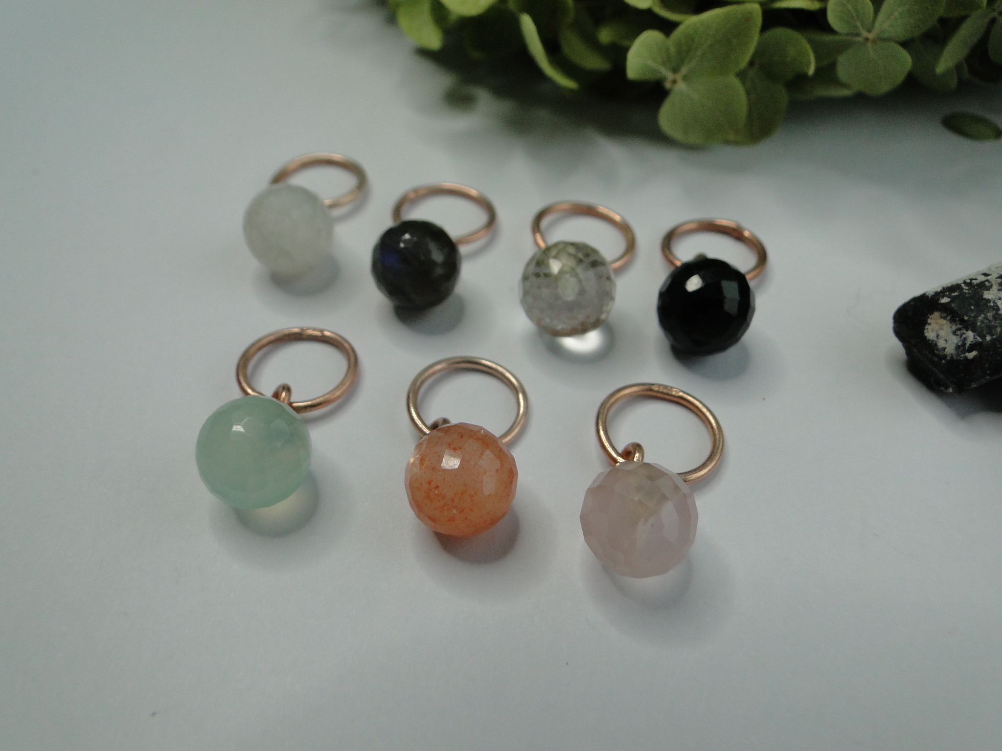 Regenbogen-Mondstein     Labradorit     grüner Amethyst    Onyx schwarz    Chalcedon mint    Sonnenstein orange    Rosenquarz
