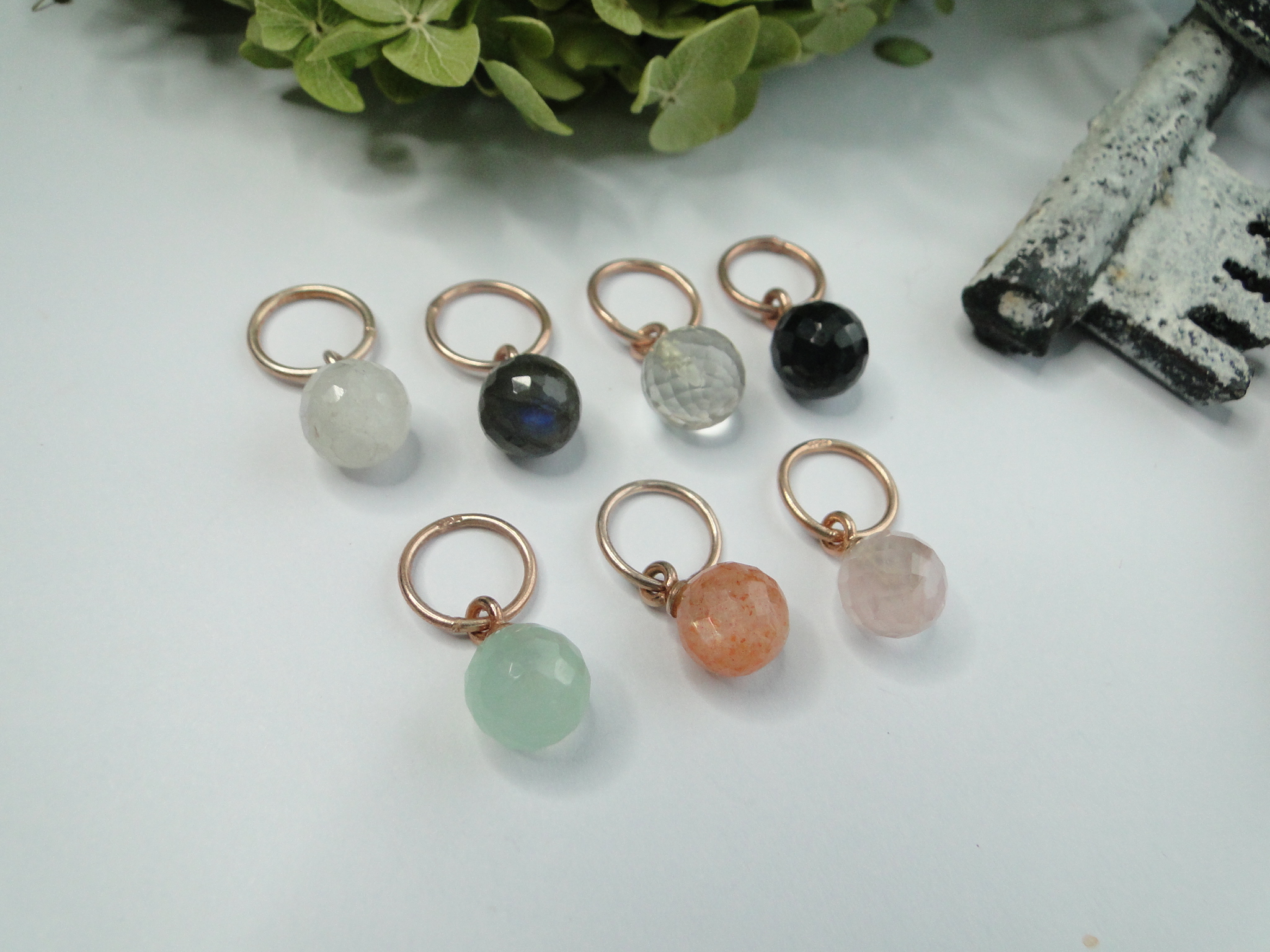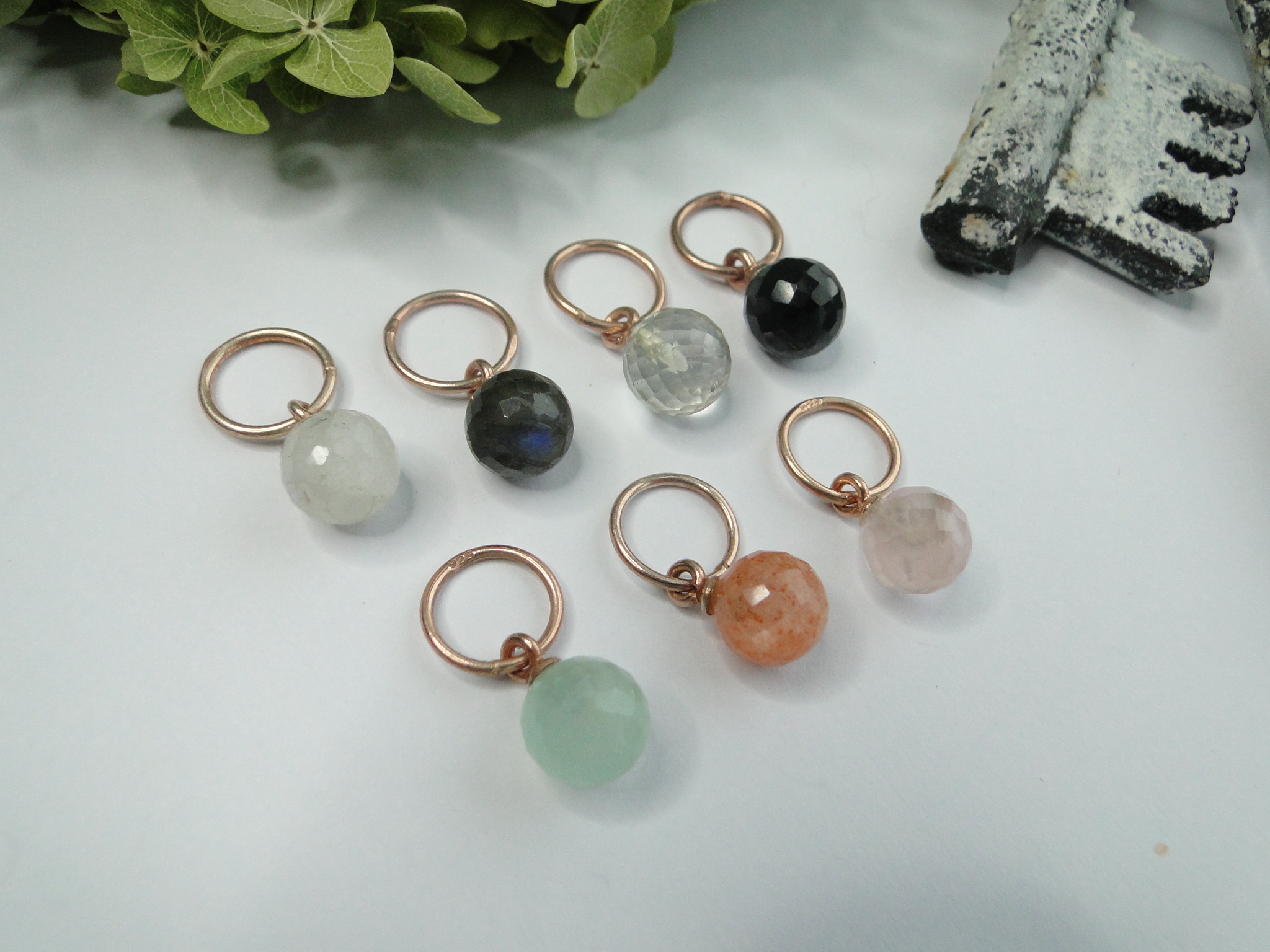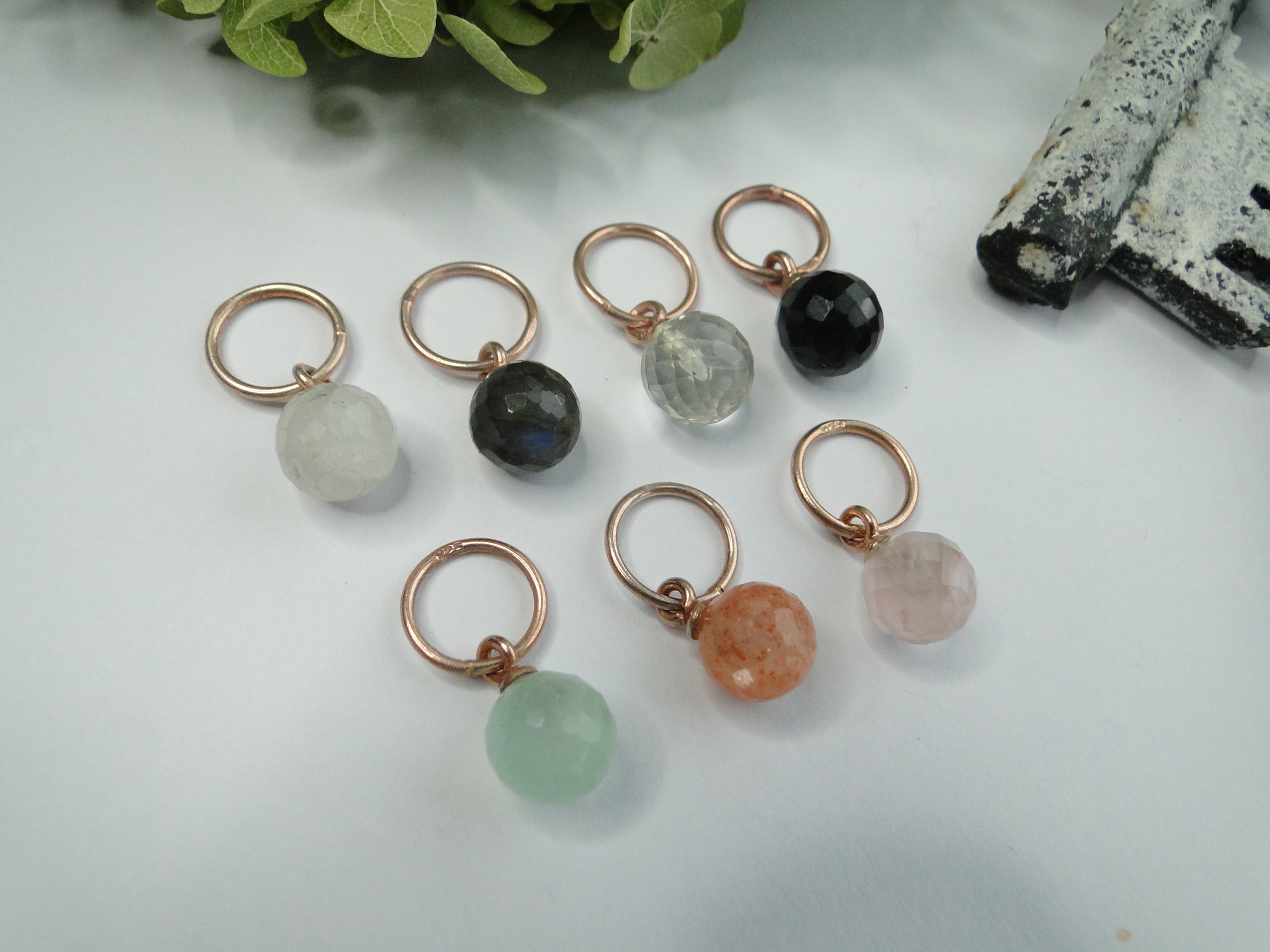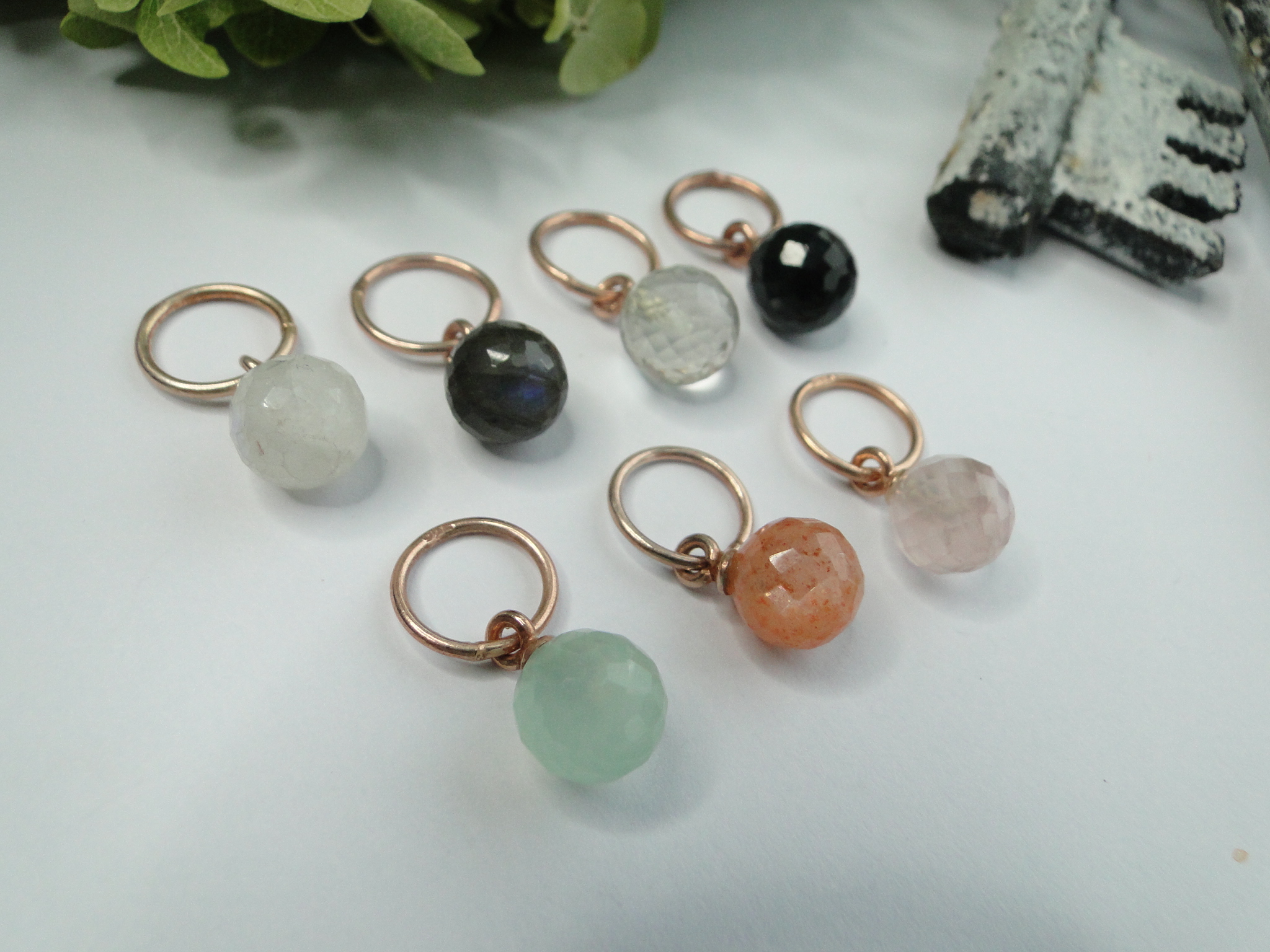 Regenbogen-Mondstein     Labradorit     grüner Amethyst    Onyx schwarz    Chalcedon mint    Sonnenstein orange    Rosenquarz