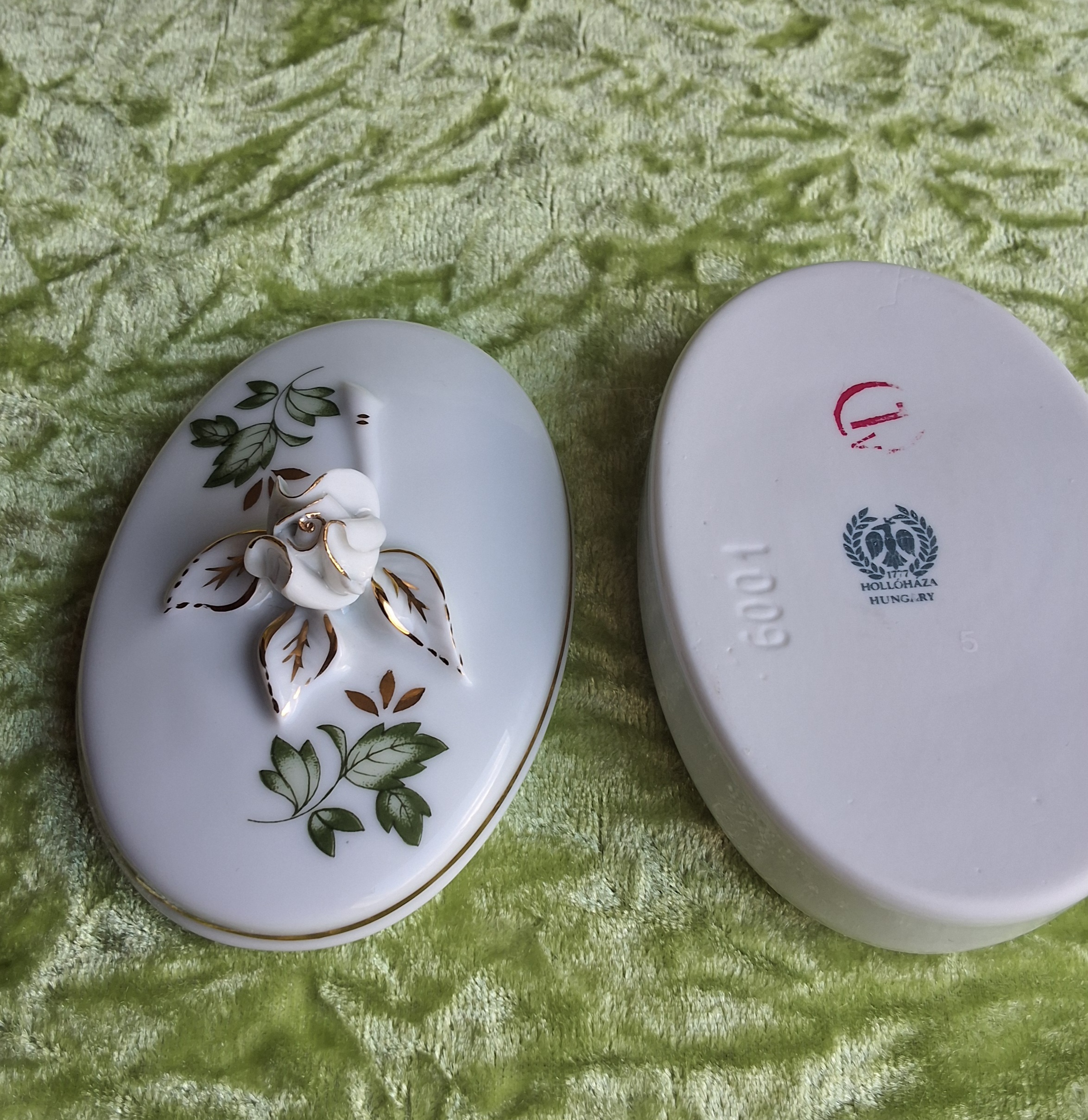 Das formschöne Döschen aus Hartporzellan, zeichnet sich durch feine handwerkliche Details aus: Das aufgesetzte, plastidche Rosendekor, die handbemalten grünen Blätter und die von Hand aufgebrachten Goldakzente, machen es zu einem typischen Hollohaza-Stück. Der Goldrand und die Vergoldungen bestehen aus 21- karätigem Gold, das von Hand aufgetragen wird.
