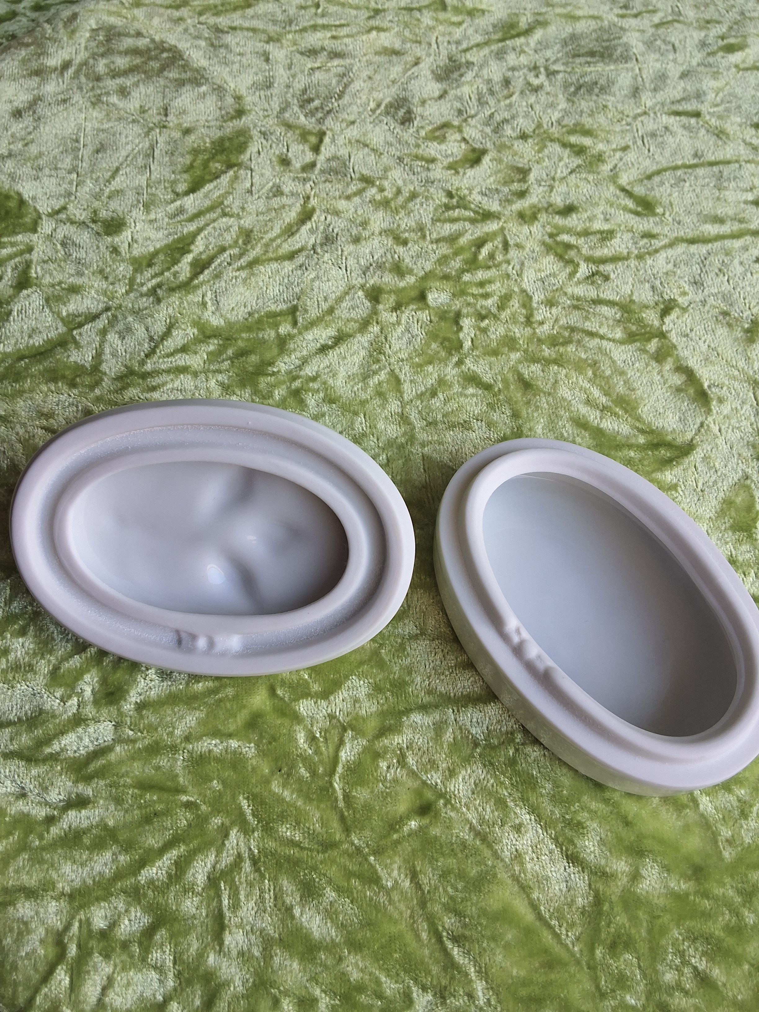 Maße des Ovals: Länge 9 cm. Breite 6 cm. Höhe mit Rose: 4 cm.