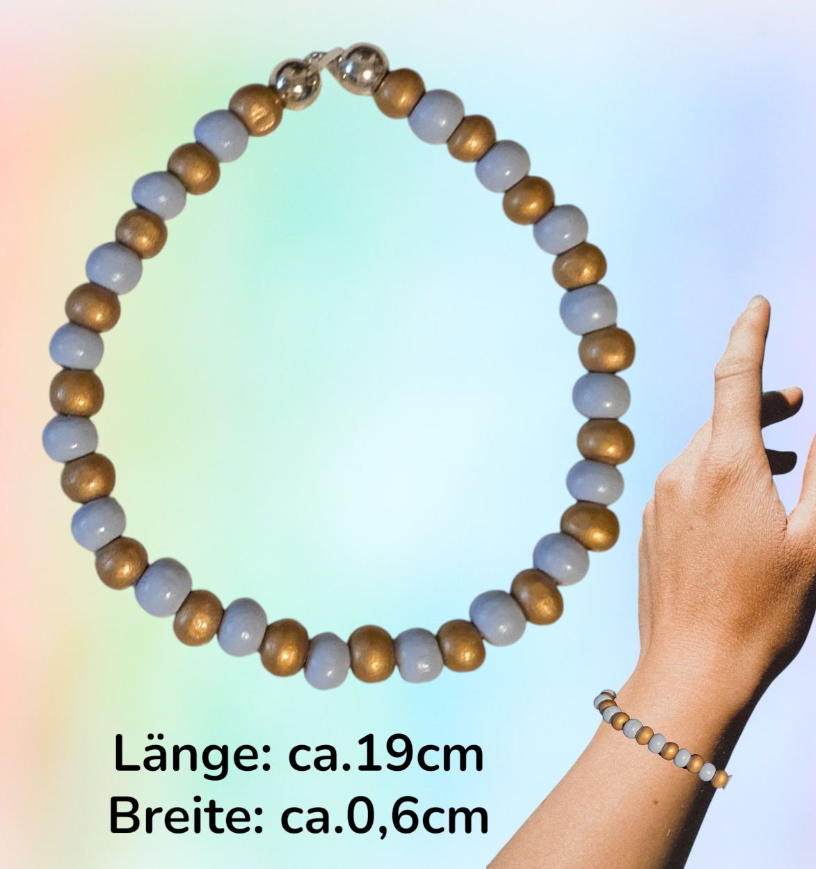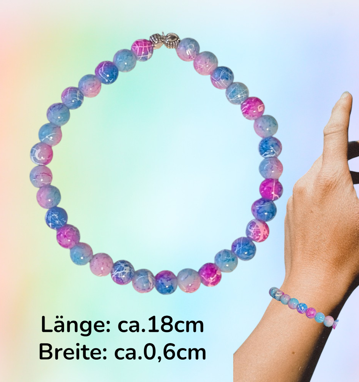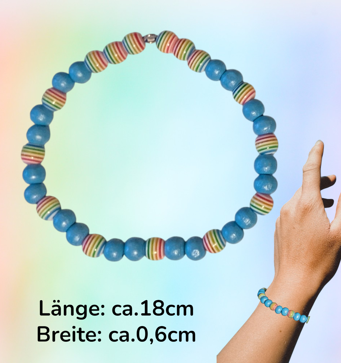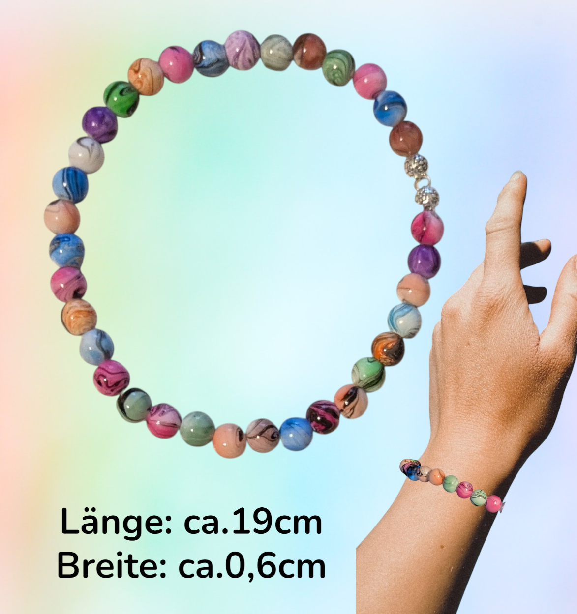 Die Farben und die Reihenfolge der bunten Armbänder können variieren. Sanft an- und ausziehen.