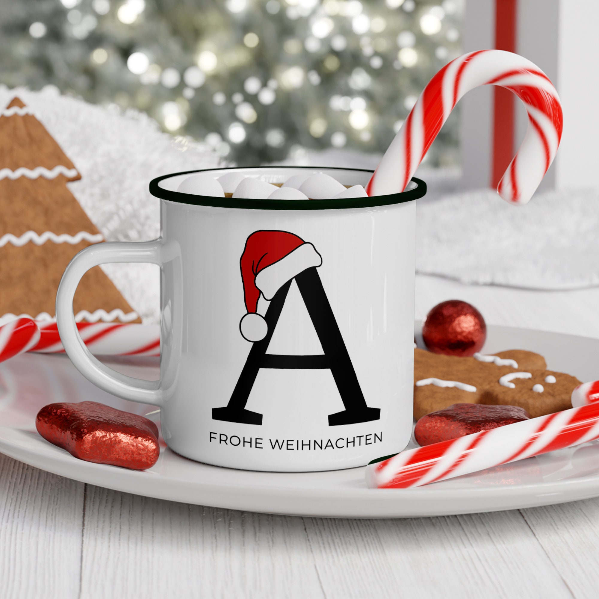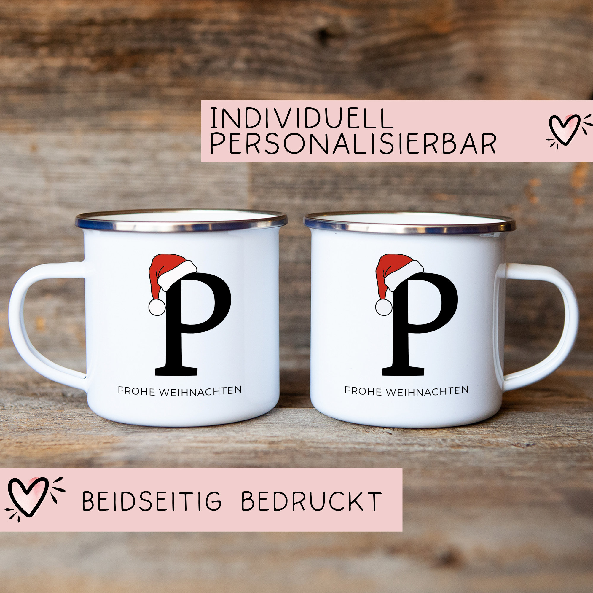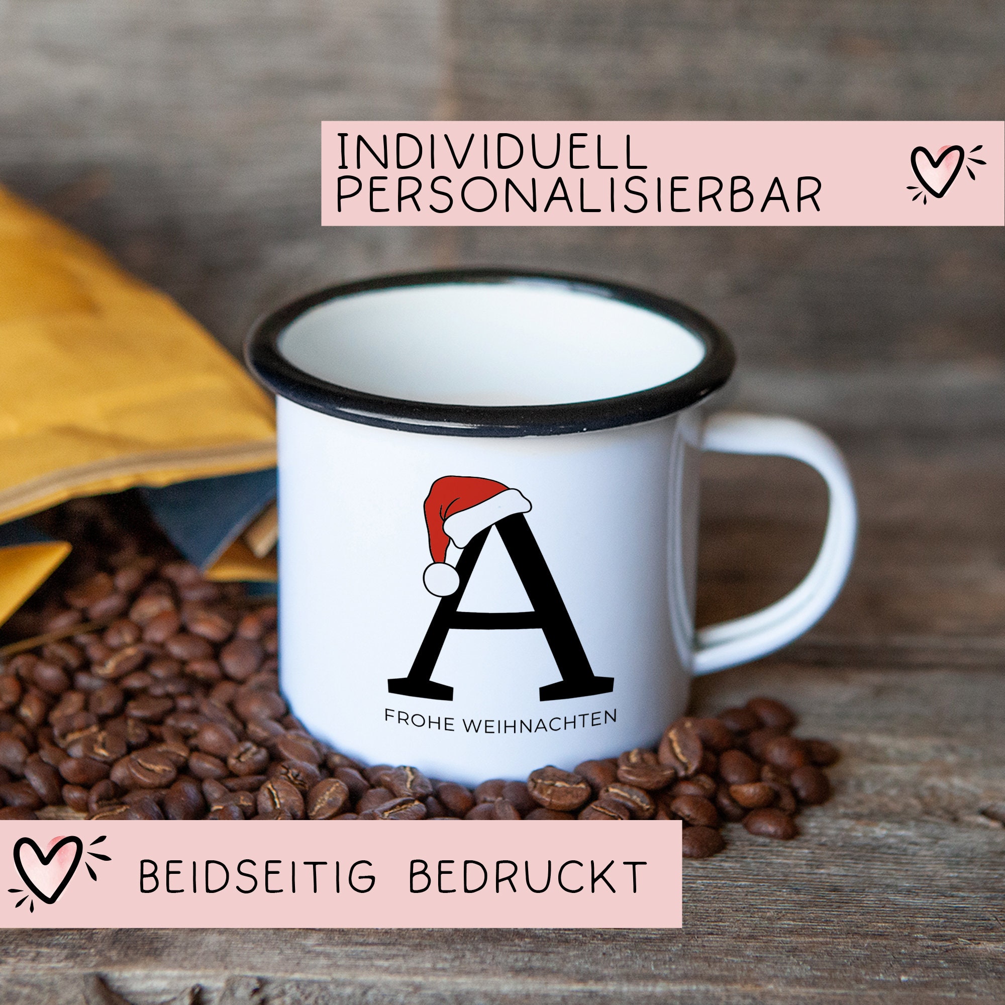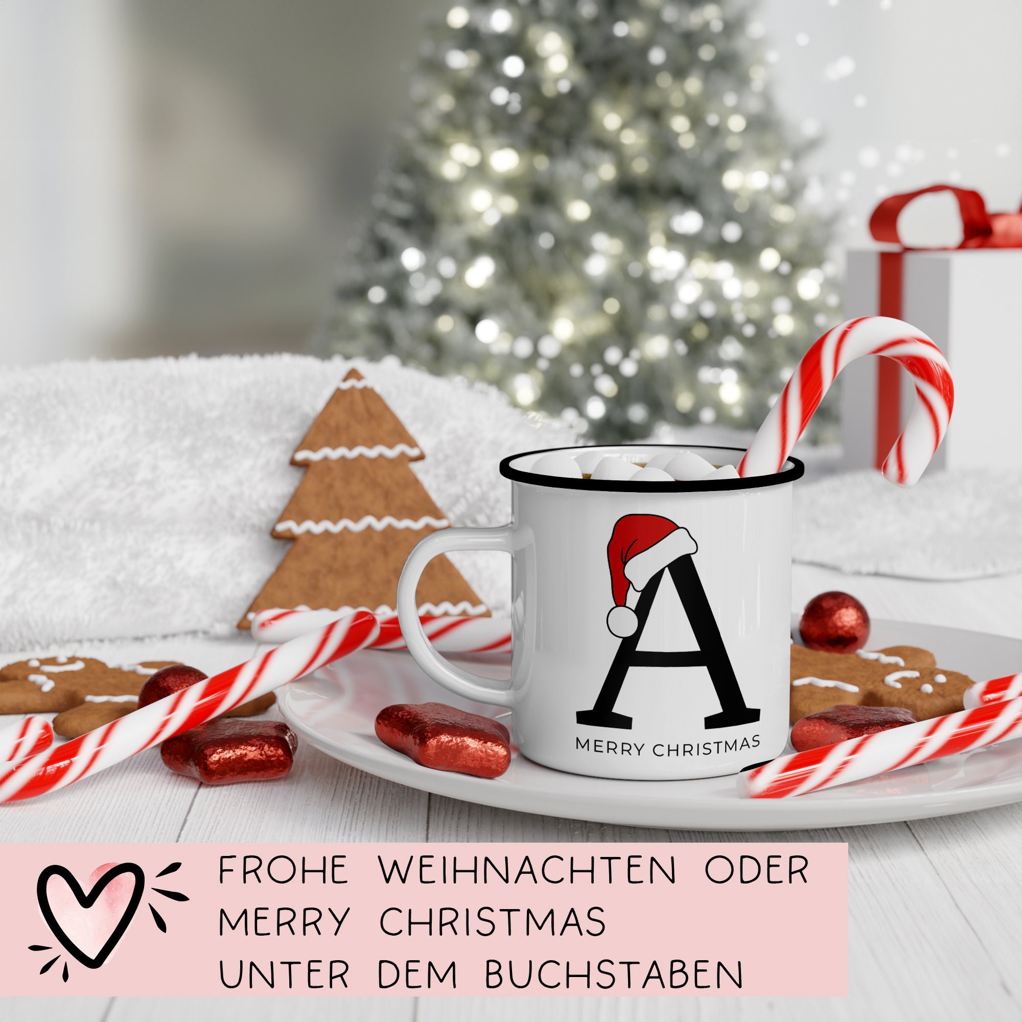 Emaille Tasse Weihnachten Personalisiert - Frohe Weihnachten - Merry Christmas - mit Anfangsbuchstabe und Wunschnamen - Nikolaus - Monogramm