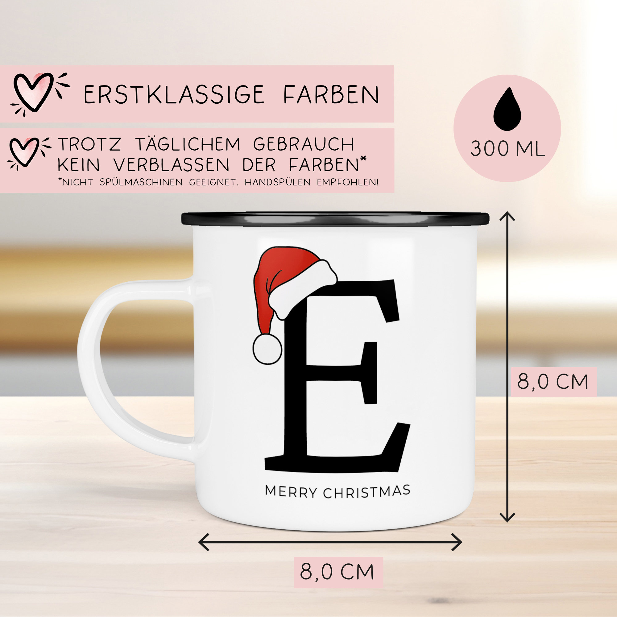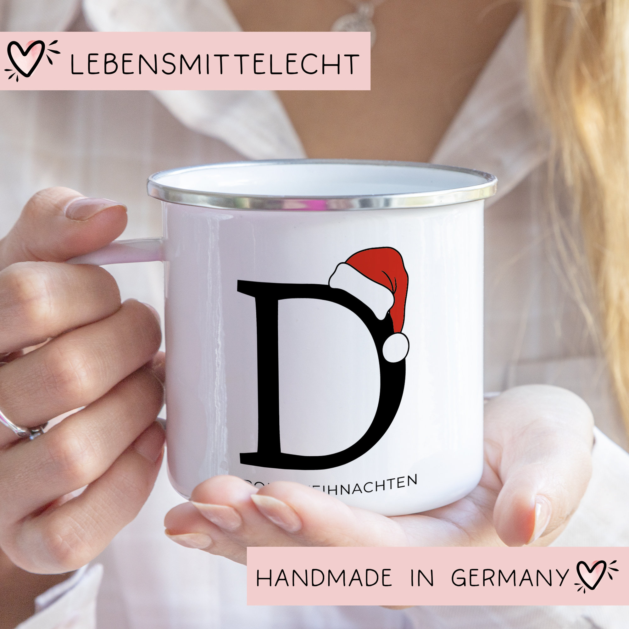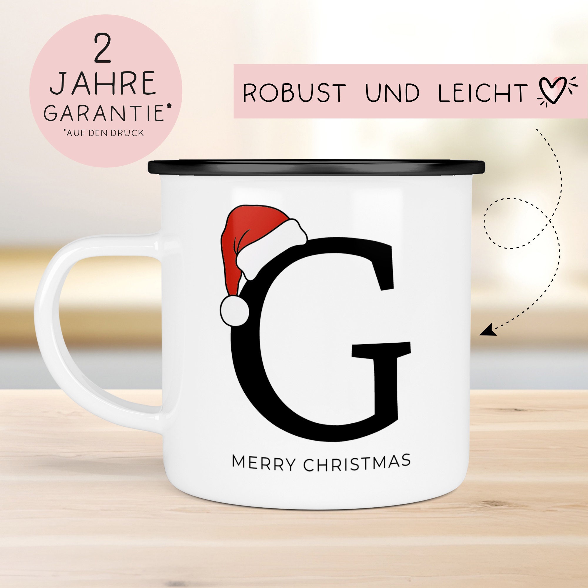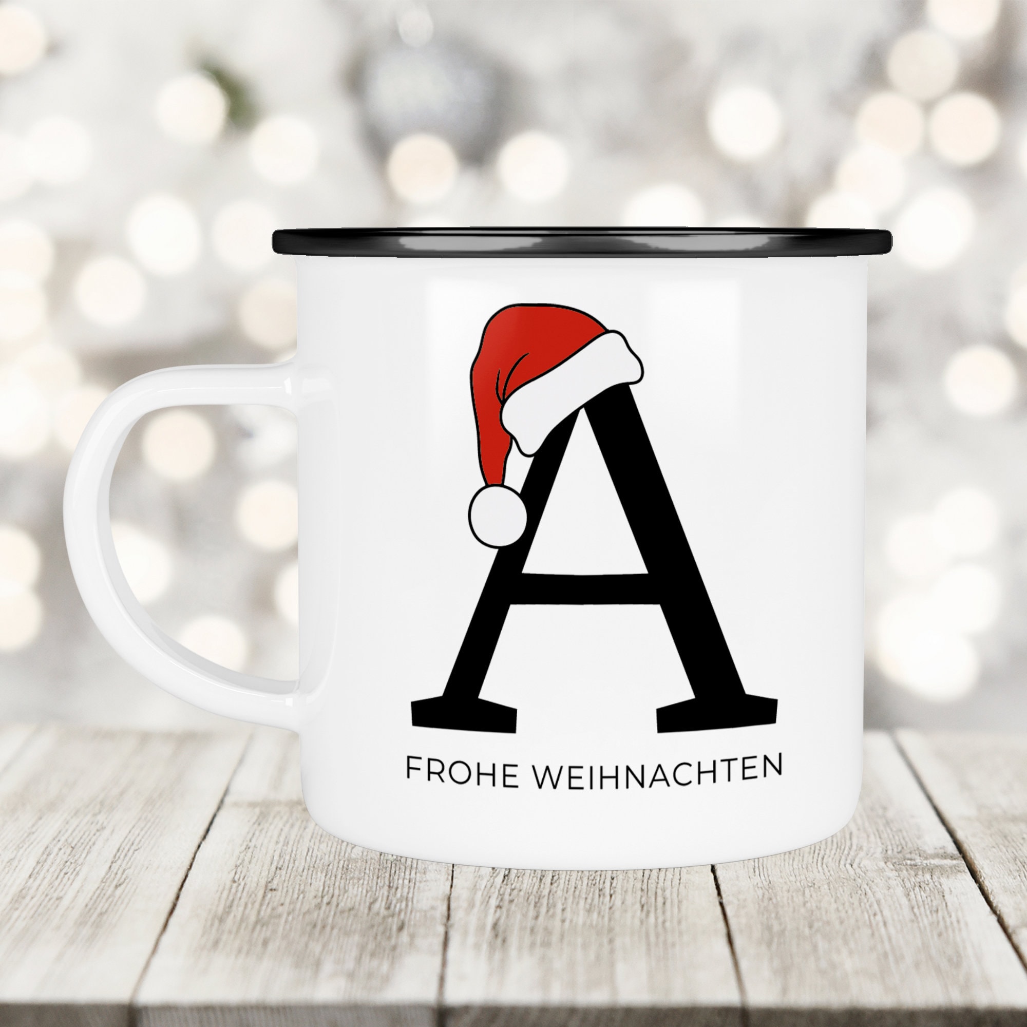 Emaille Tasse Weihnachten Personalisiert - Frohe Weihnachten - Merry Christmas - mit Anfangsbuchstabe und Wunschnamen - Nikolaus - Monogramm