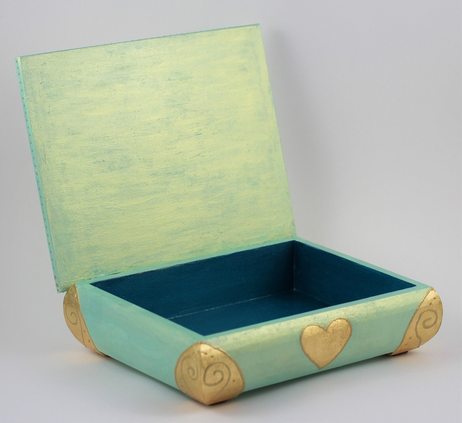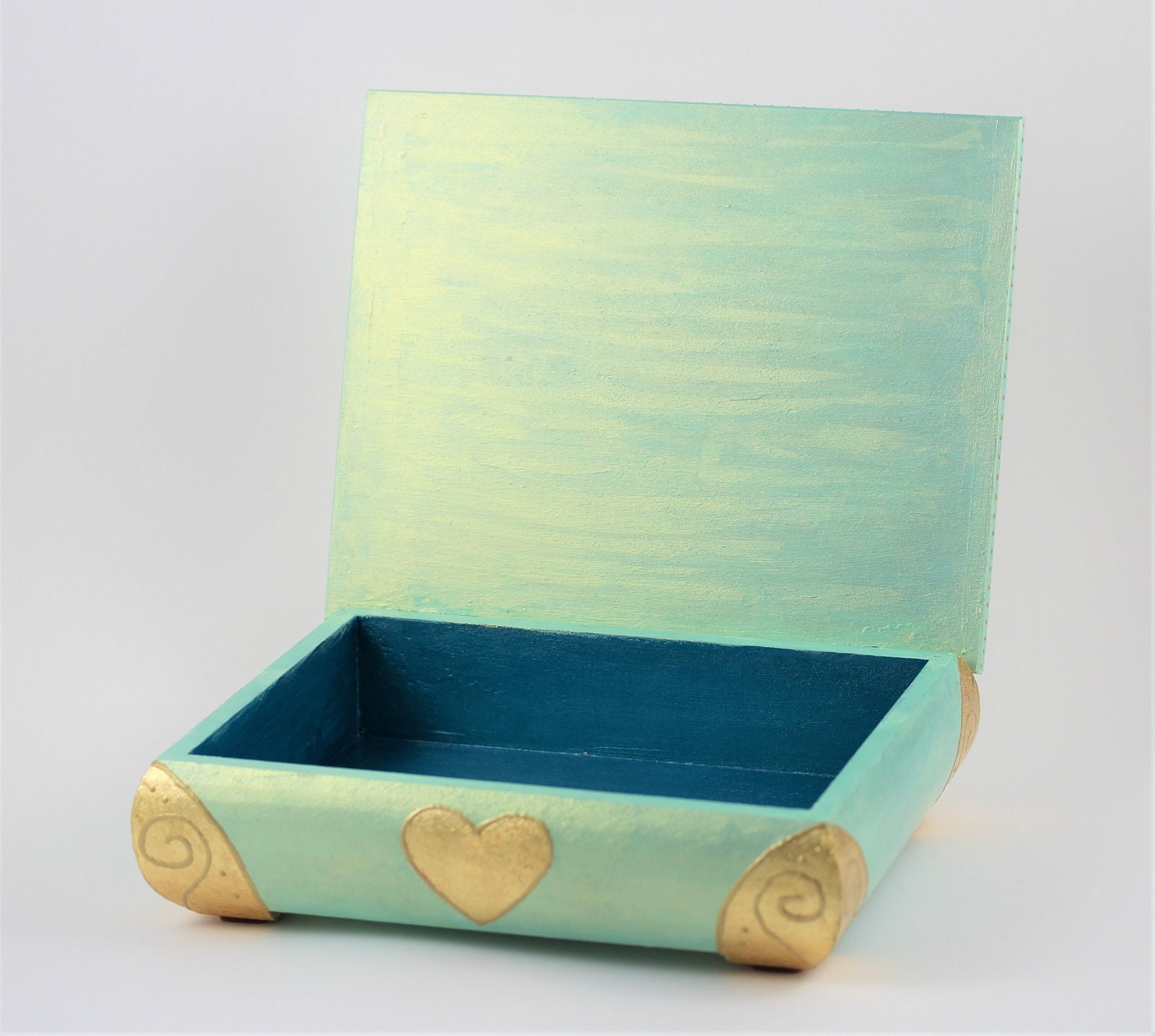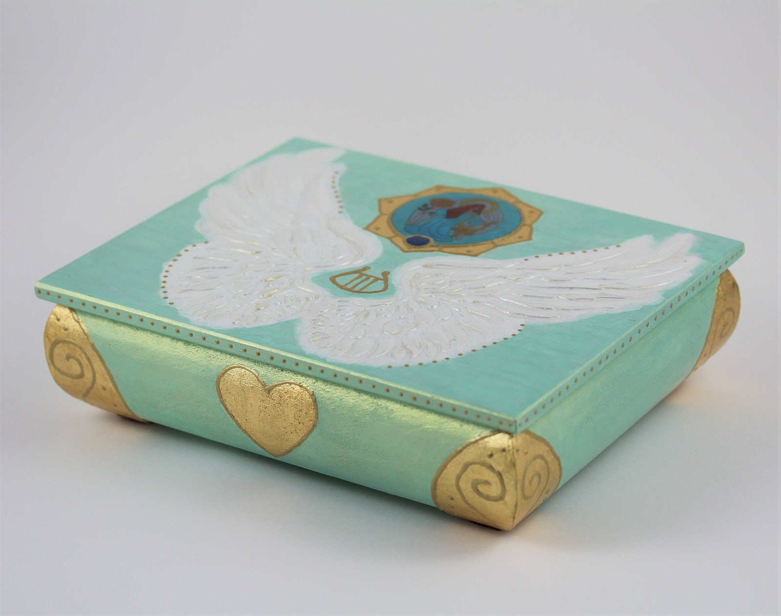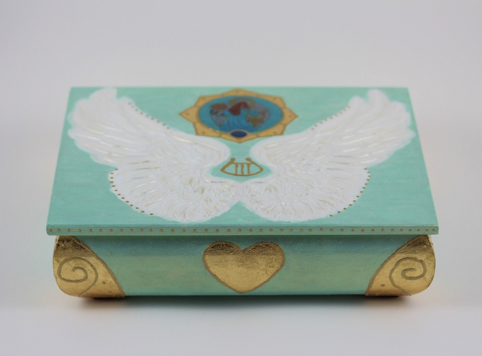 Das bildschöne Motiv des Erzengels Sandalphon ziert dieses edle Schmuckkästchen in schimmerndem Mint Grün mit wertvoller Blattmetallvergoldung.