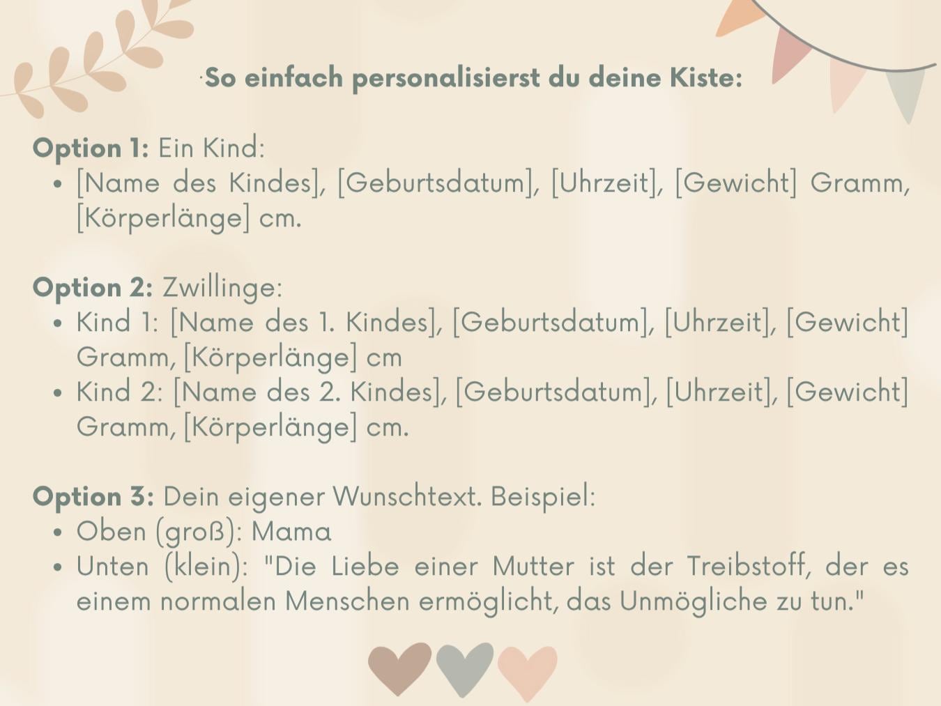 ✍️ Deine Wunsch-Personalisierung: Wir machen deine Box zum Unikat! Wähle aus drei flexiblen Optionen: