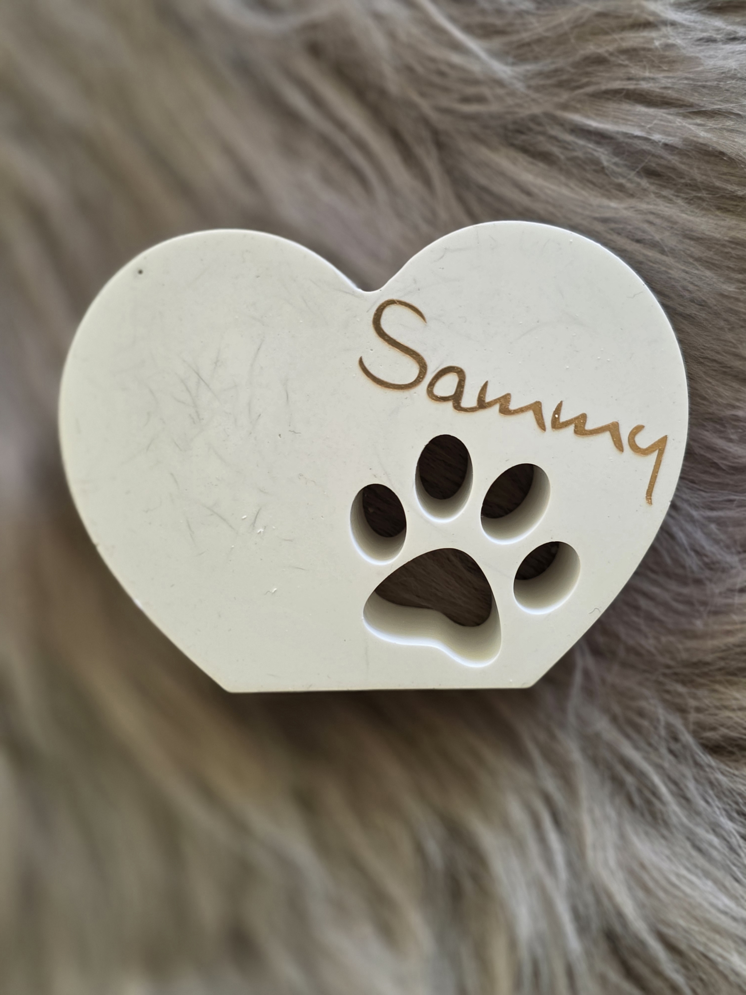 In die Form können Haare von Ihrem Tier mit eingegossen werden. Dafür bitte auf eigene Kosten saubere und trockene Tierhaare Ihres Lieblings an unsere Adresse schicken ( lieber ein paar mehr als zu wenig ). Bitte in einen kleinen Zipperbeutel oder ähnliches verpacken.