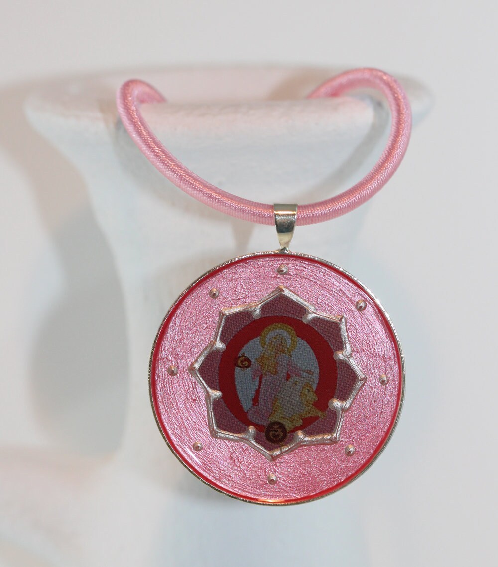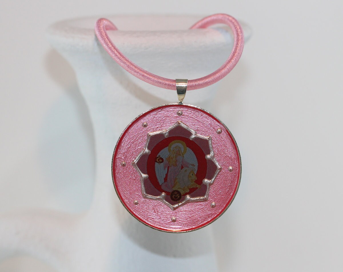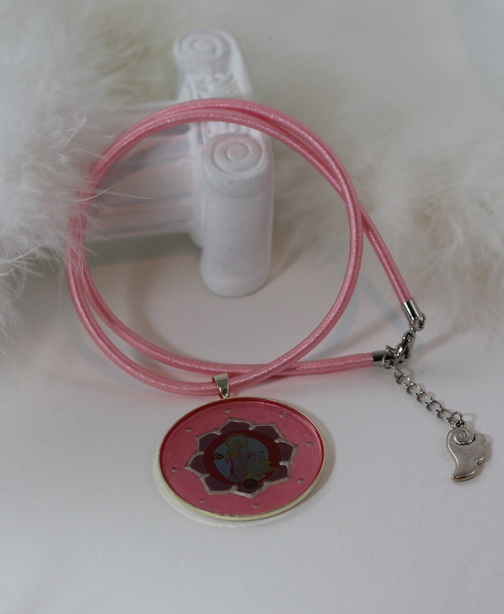 Das ausdruckvolle Motiv des Erzengels Ariel in einer Lotusblume auf schimmerndem Hintergrund ist von Hand eingegossen in einen dekorativen runden Anhänger an einer edlen Seidenkordel.