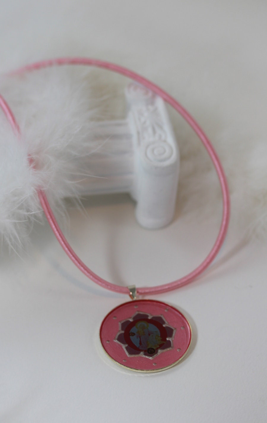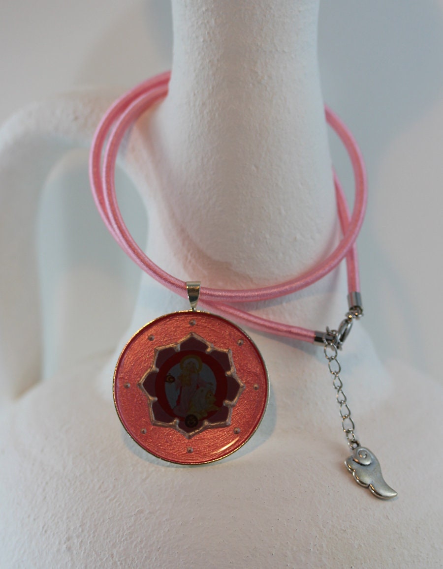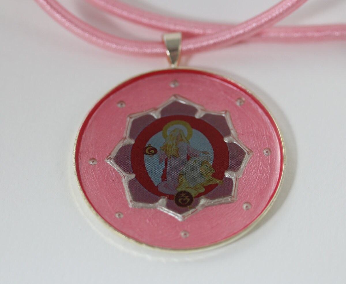 Das ausdruckvolle Motiv des Erzengels Ariel in einer Lotusblume auf schimmerndem Hintergrund ist von Hand eingegossen in einen dekorativen runden Anhänger an einer edlen Seidenkordel.