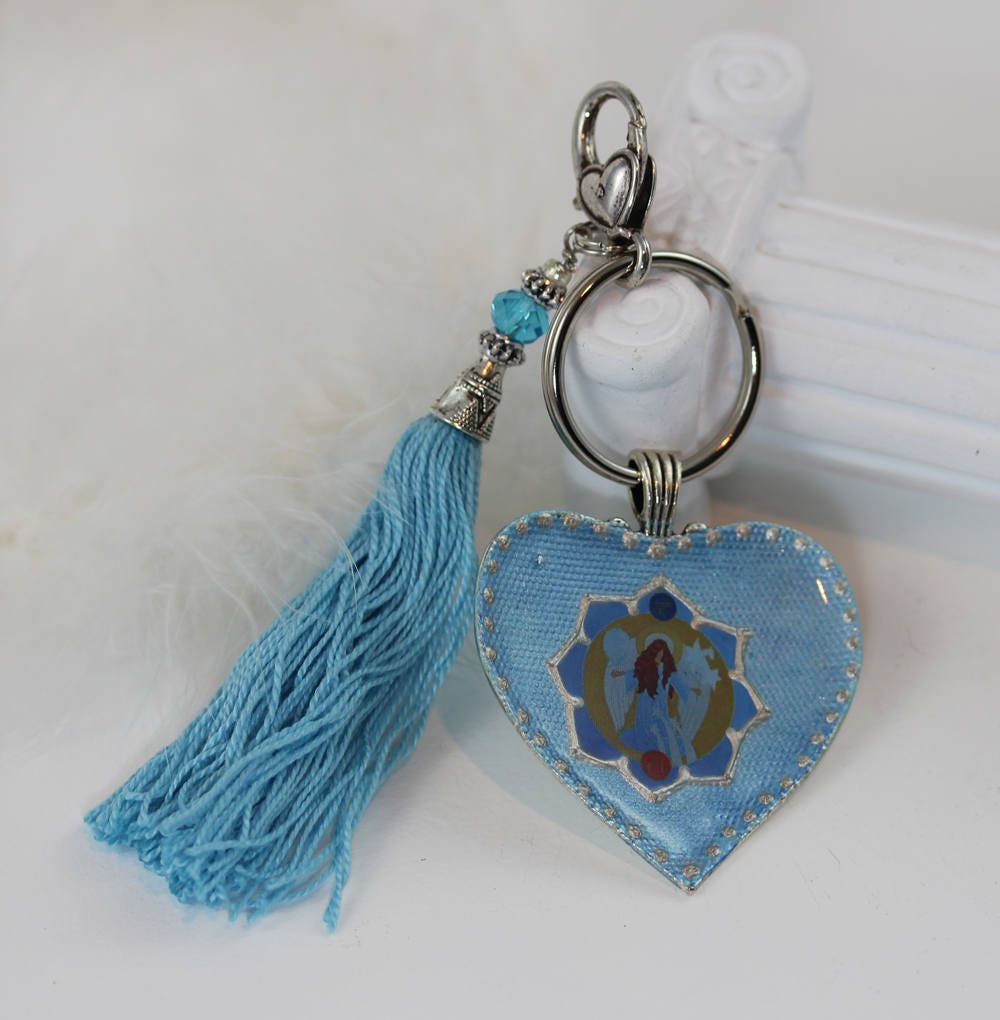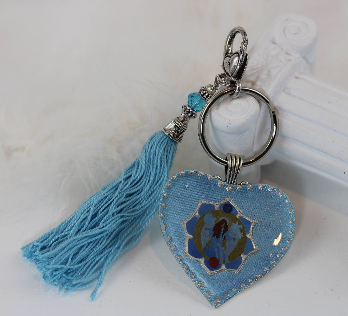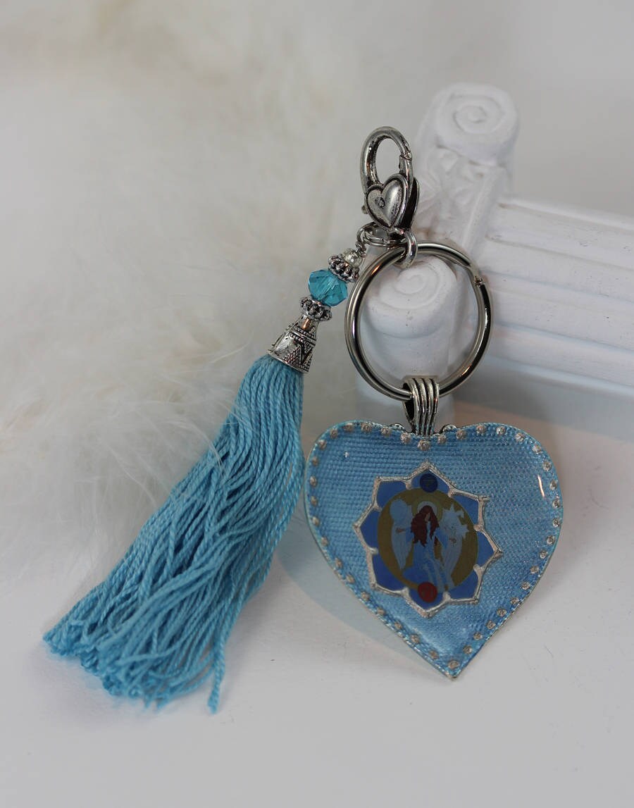 Das Herz is 5 x 5 cm gross, die Quaste etwa 10 cm lang. Die Materialien sind silberfarbenes Metall, Künstlerfarben, Engelmotiv unter Kunstharz, Baumwollgarn und Glasperle.