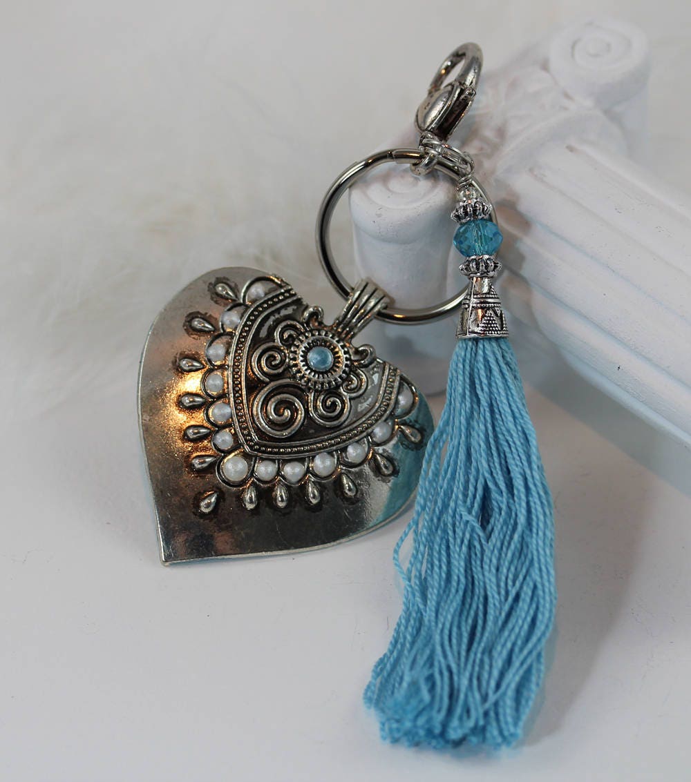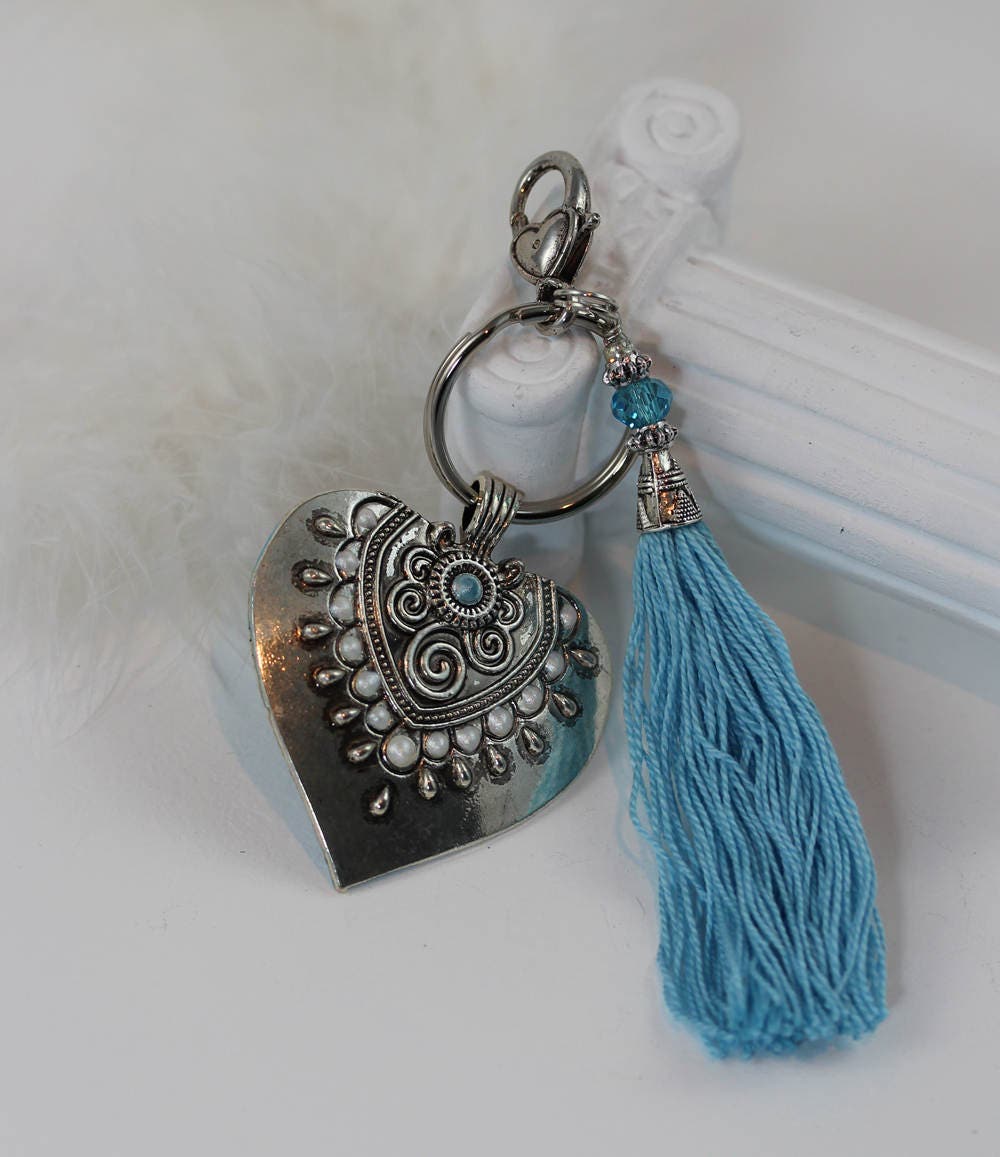 Liebevoll in ein handdekoriertes silbernes Herz eingearbeitet ist das schöne Engelmotiv meiner Designserie Angeloudia, und als besonderes i-Tüpfelchen und farbenfroher Hingucker ist dieses schöne Accessoire noch mit einer farblich passenden handgefertigten Quaste mit funkelnder Glasperle geschmückt.