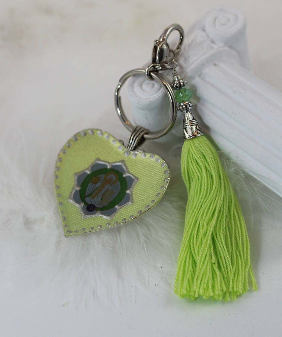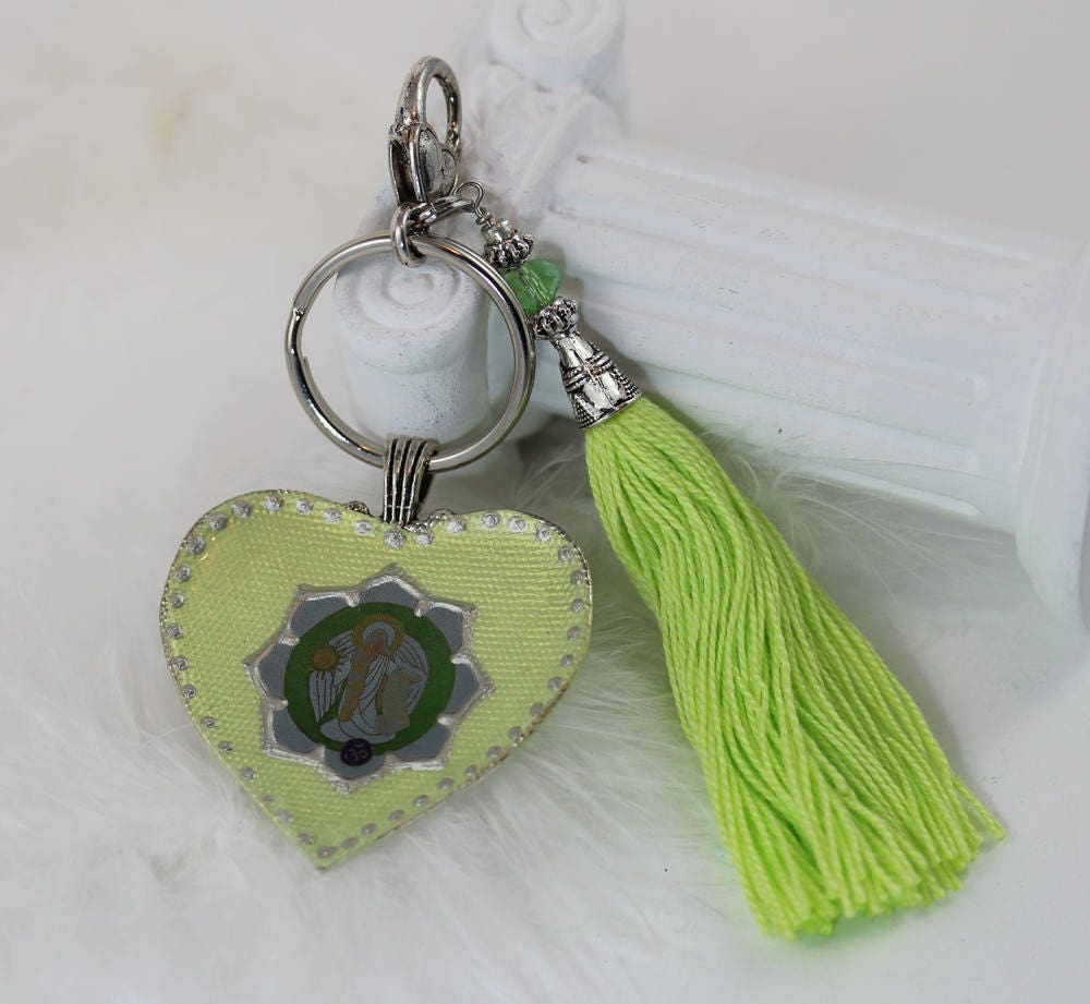 Das Herz is 5 x 5 cm gross, die Quaste etwa 10 cm lang. Die Materialien sind silberfarbenes Metall, Künstlerfarben, Engelmotiv unter Kunstharz, Baumwollgarn und Glasperle.
