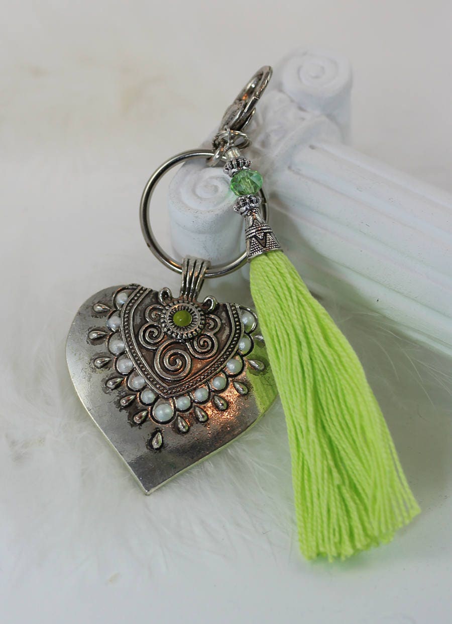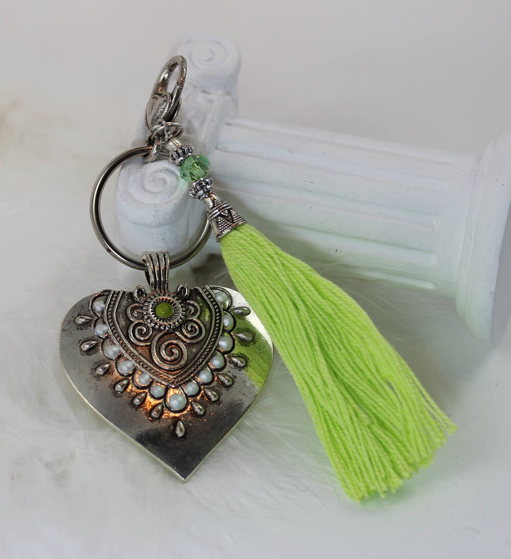 Liebevoll in ein handdekoriertes silbernes Herz eingearbeitet ist das schöne Engelmotiv meiner Designserie Angeloudia, und als besonderes i-Tüpfelchen und farbenfroher Hingucker ist dieses schöne Accessoire noch mit einer farblich passenden handgefertigten Quaste mit funkelnder Glasperle geschmückt.