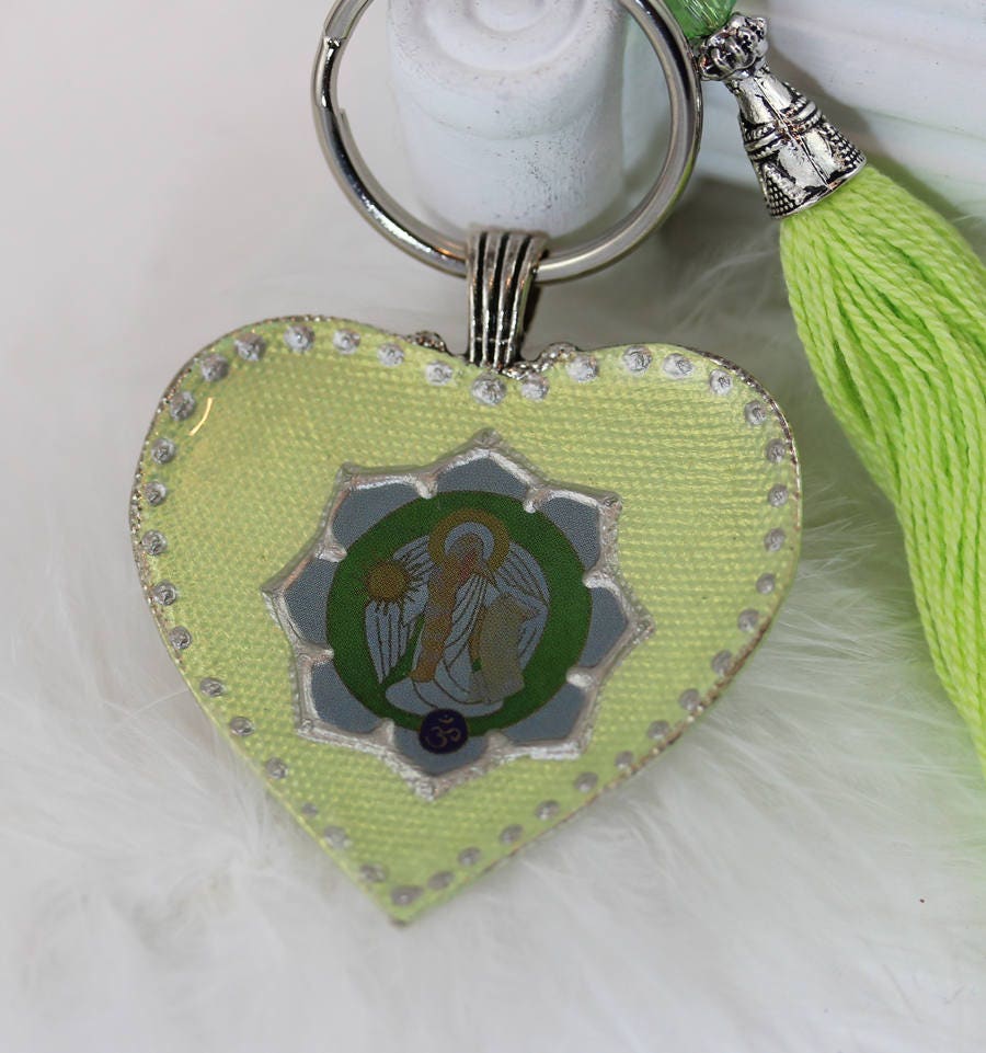 Dies hier ist der Erzengel Metatron, der Engel für Weisheit und Zeit, auf hellgrün schimmerndem Hintergrund mit hellgrüner Quaste und Funkelperle.