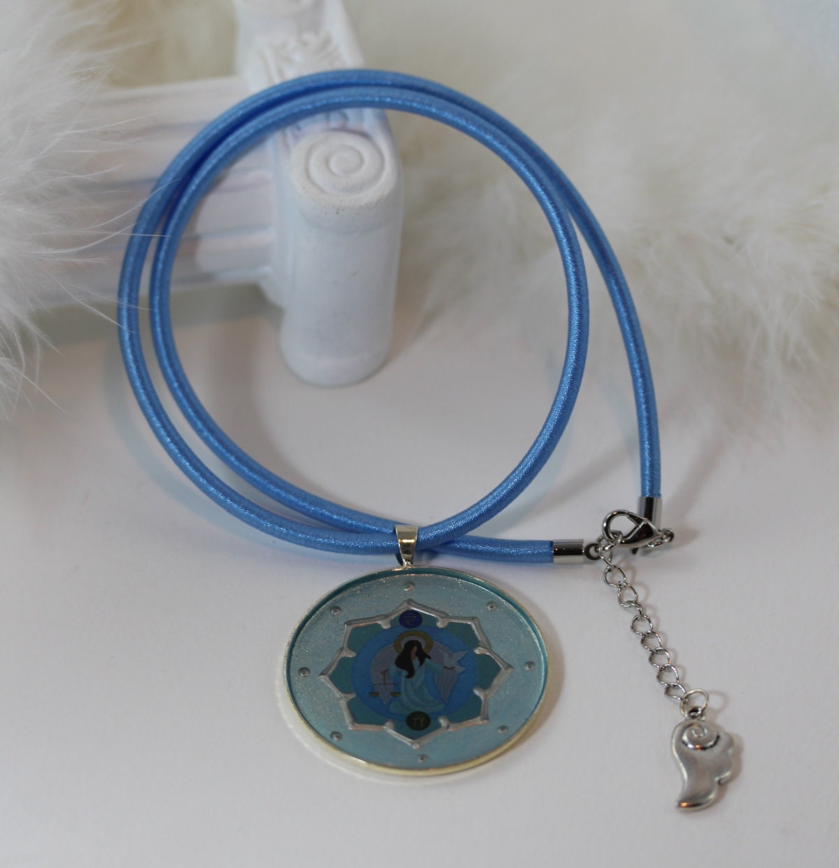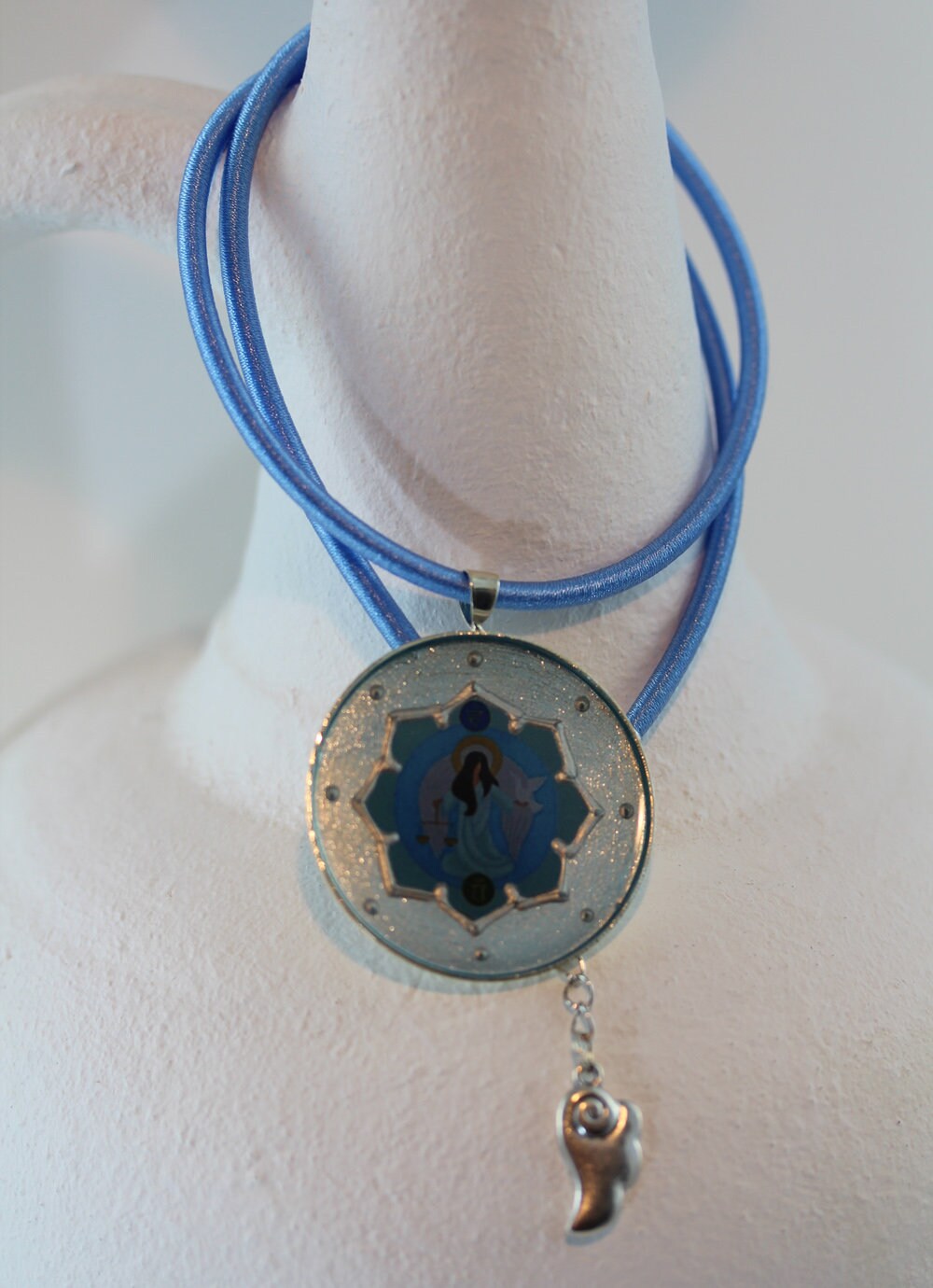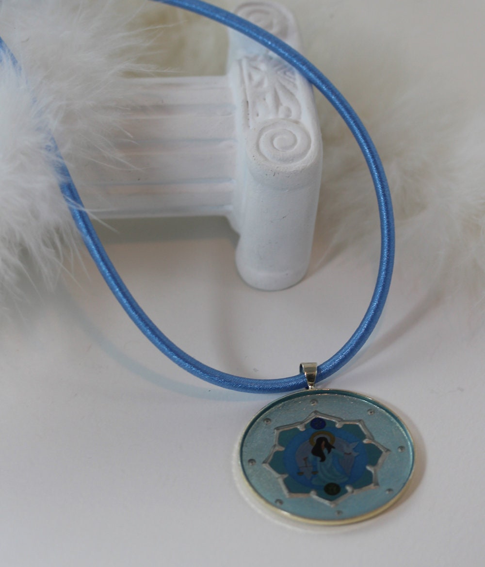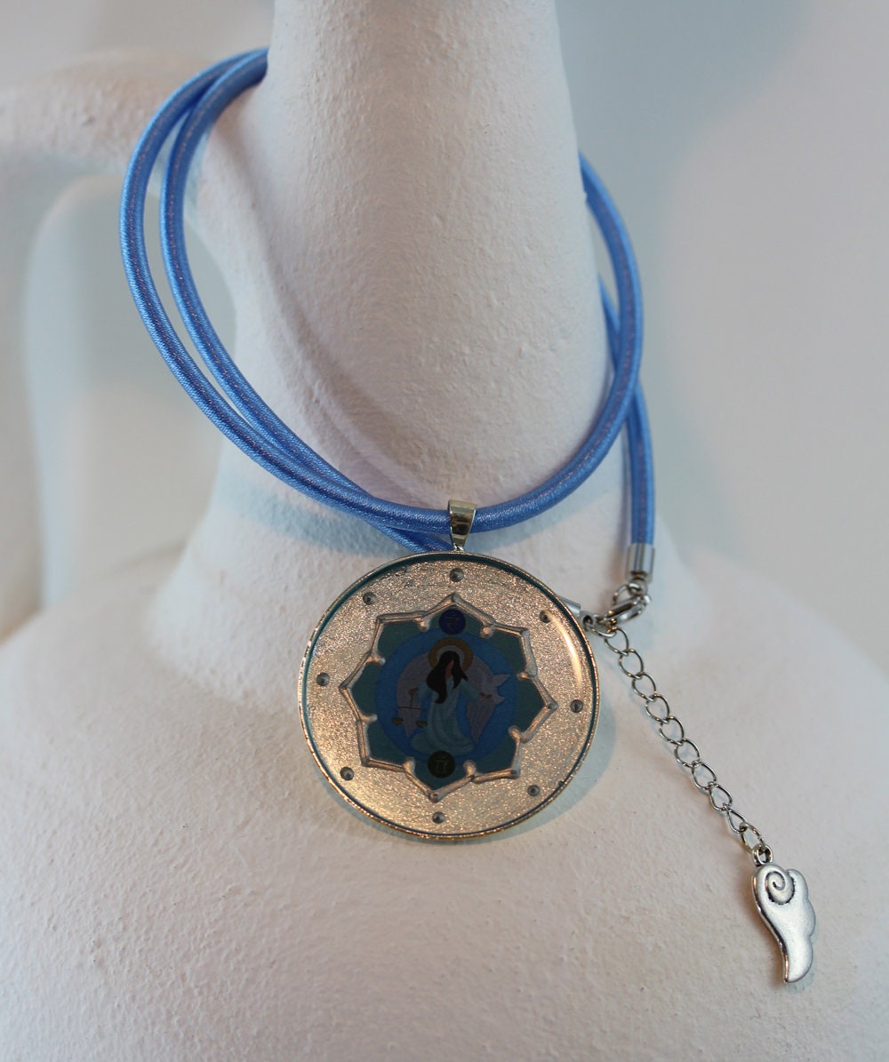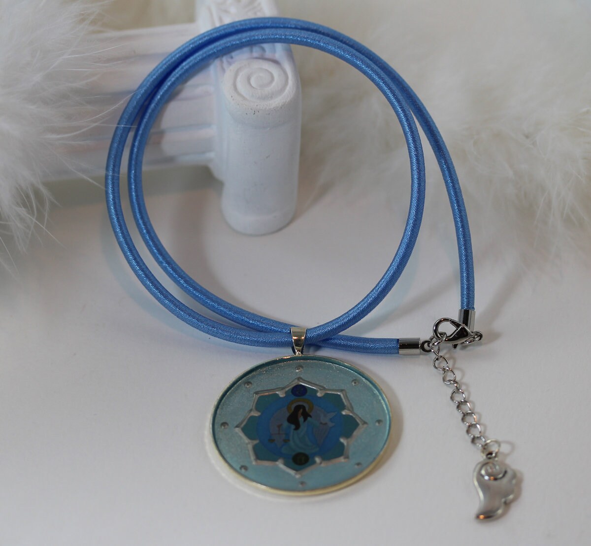 Die Materialien sind versilbertes Metall, Künstlerfarben, Kunstharzguß, Seidenkordel. Der Anhänger hat einen Durchmesser von 40mm, die Seidenkordel ist 48 cm lang, ist verlängerbar mit einem kleinen Kettchen mit einem charmantem kleinen Flügelchen.