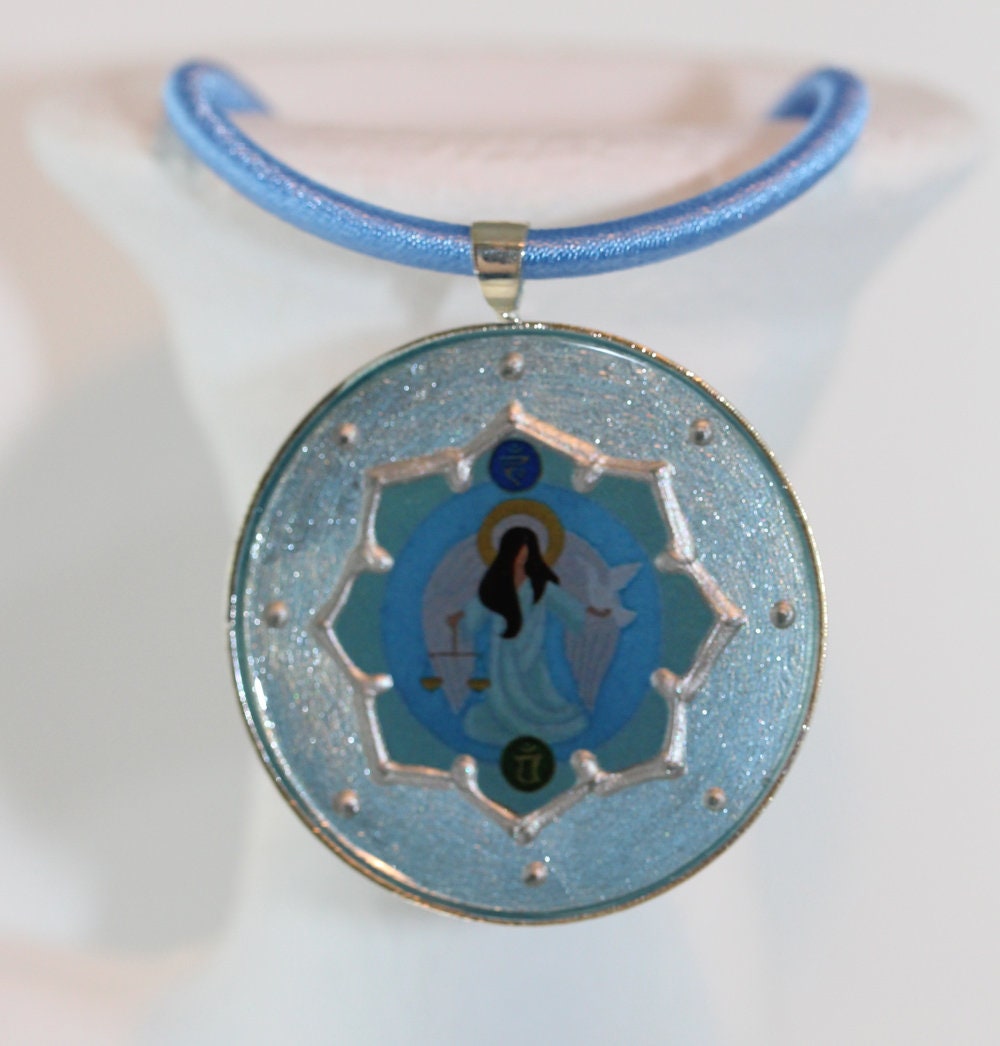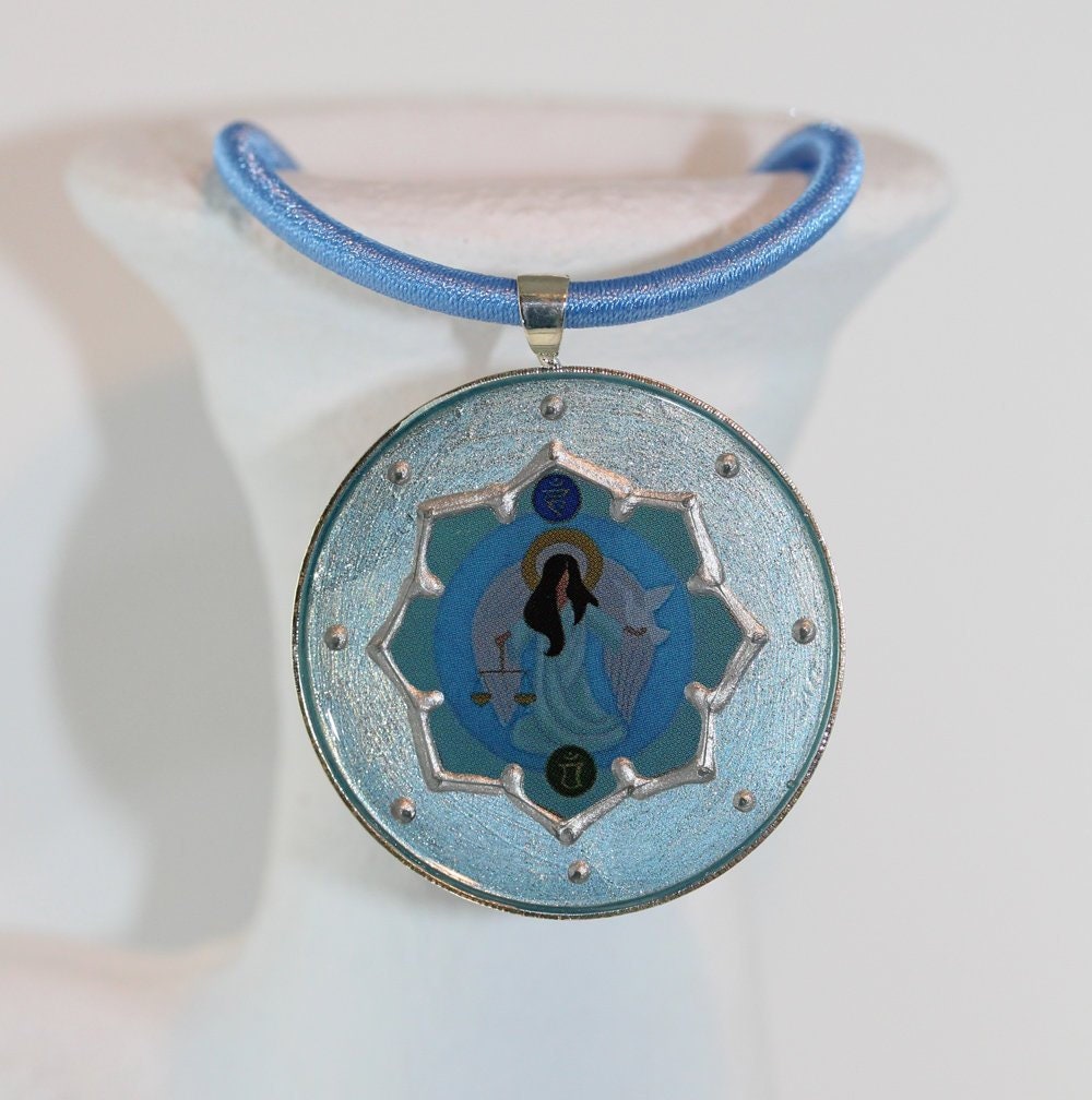 Das ausdruckvolle Motiv des Erzengels Raguel in einer Lotusblume auf schimmerndem Hintergrund ist von Hand eingegossen in einen dekorativen runden Anhänger an einer edlen Seidenkordel.