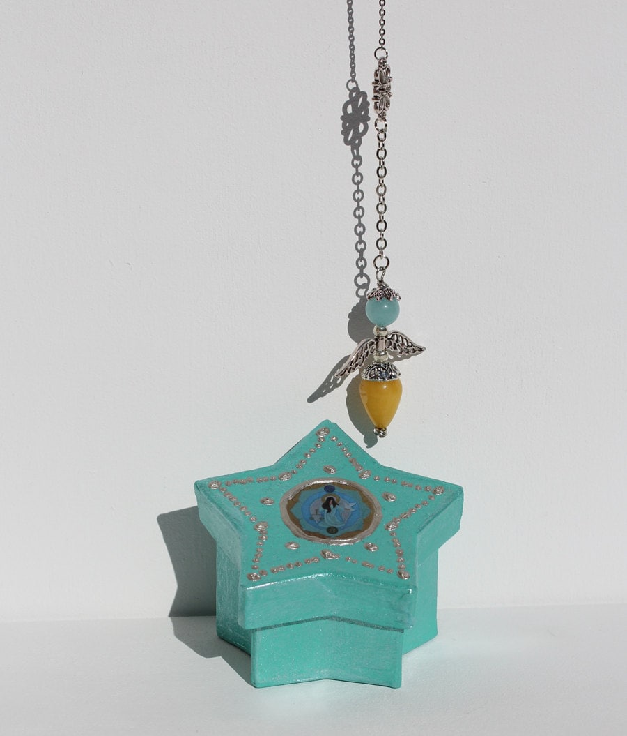 Das Engel-Pendel ist 4 cm lang, die Halskette hat eine Lönge von 48 cm plus 5 cm Verlängerung zum Pendel, der Durchmesser des Engel-Gegenpol-Talers ist 3,5 cm, und die Maße des sternförmigen Kästchens sind 6 x 3 cm. Die Materialien sind Jadestein, Edelstahlkette und altsilberfarbenes Metall, Kästchen aus Pappmachee, verschiedene Künstlerfarben.