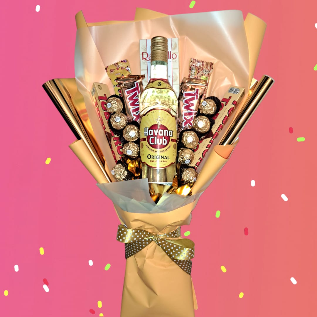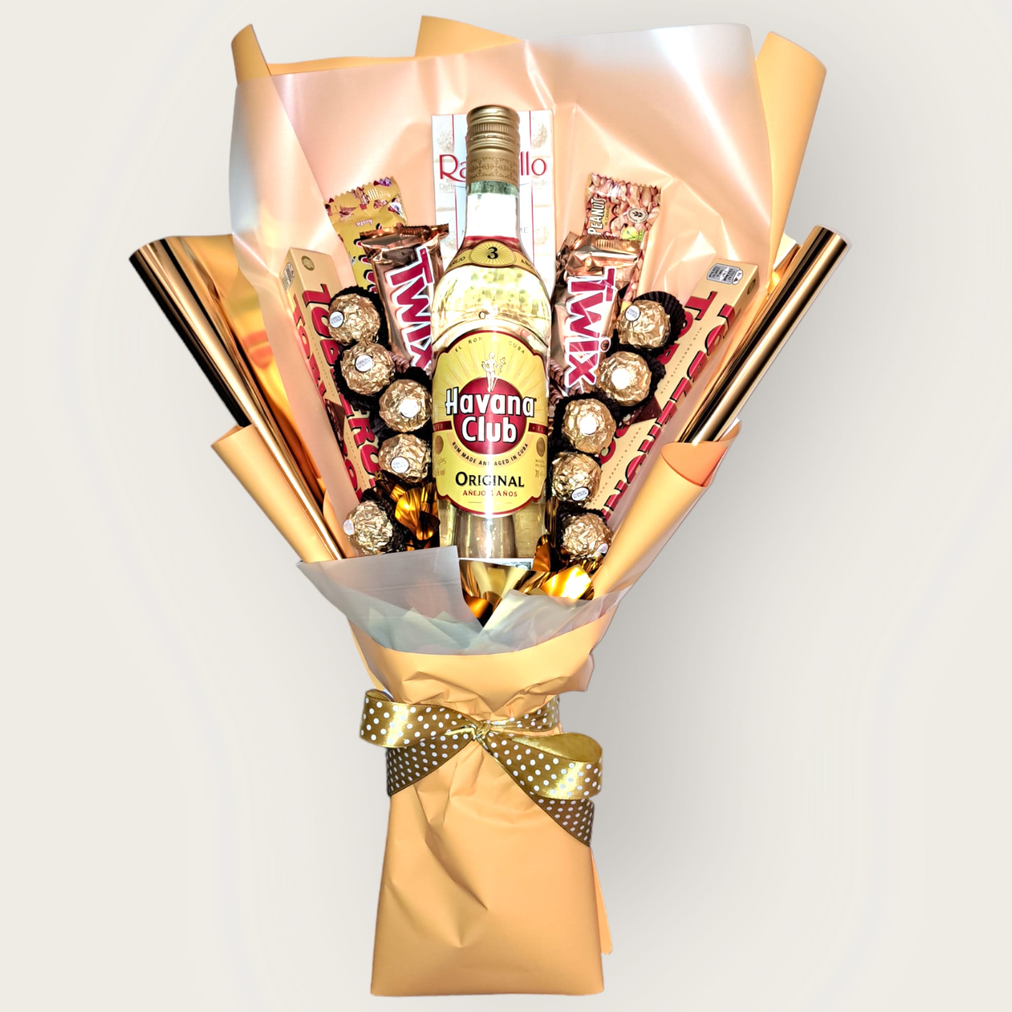 Genussstrauß mit Havana Club Rum, Toblerone, Ferrero Rocher, Twix und Mr.Tom Riegeln