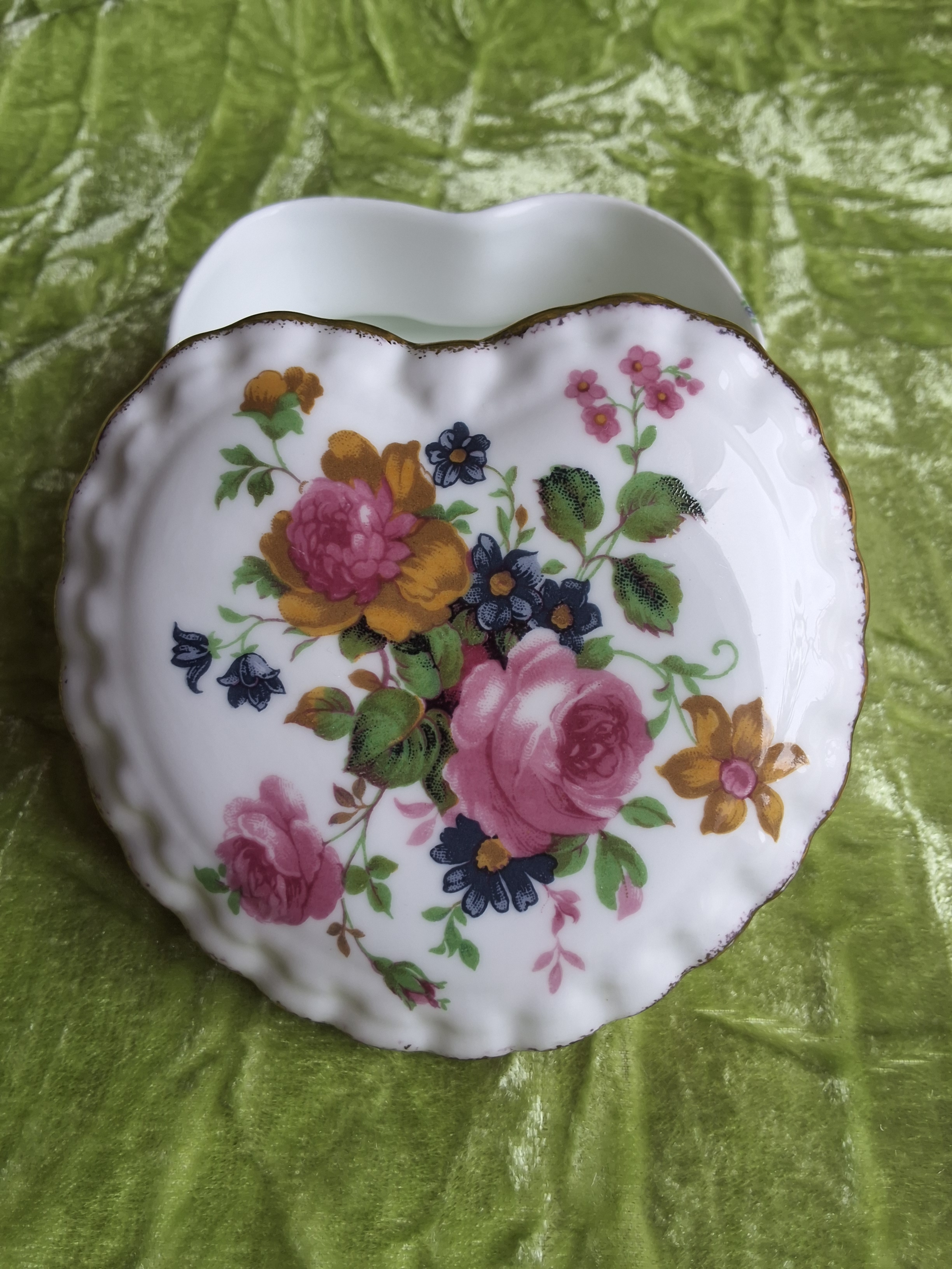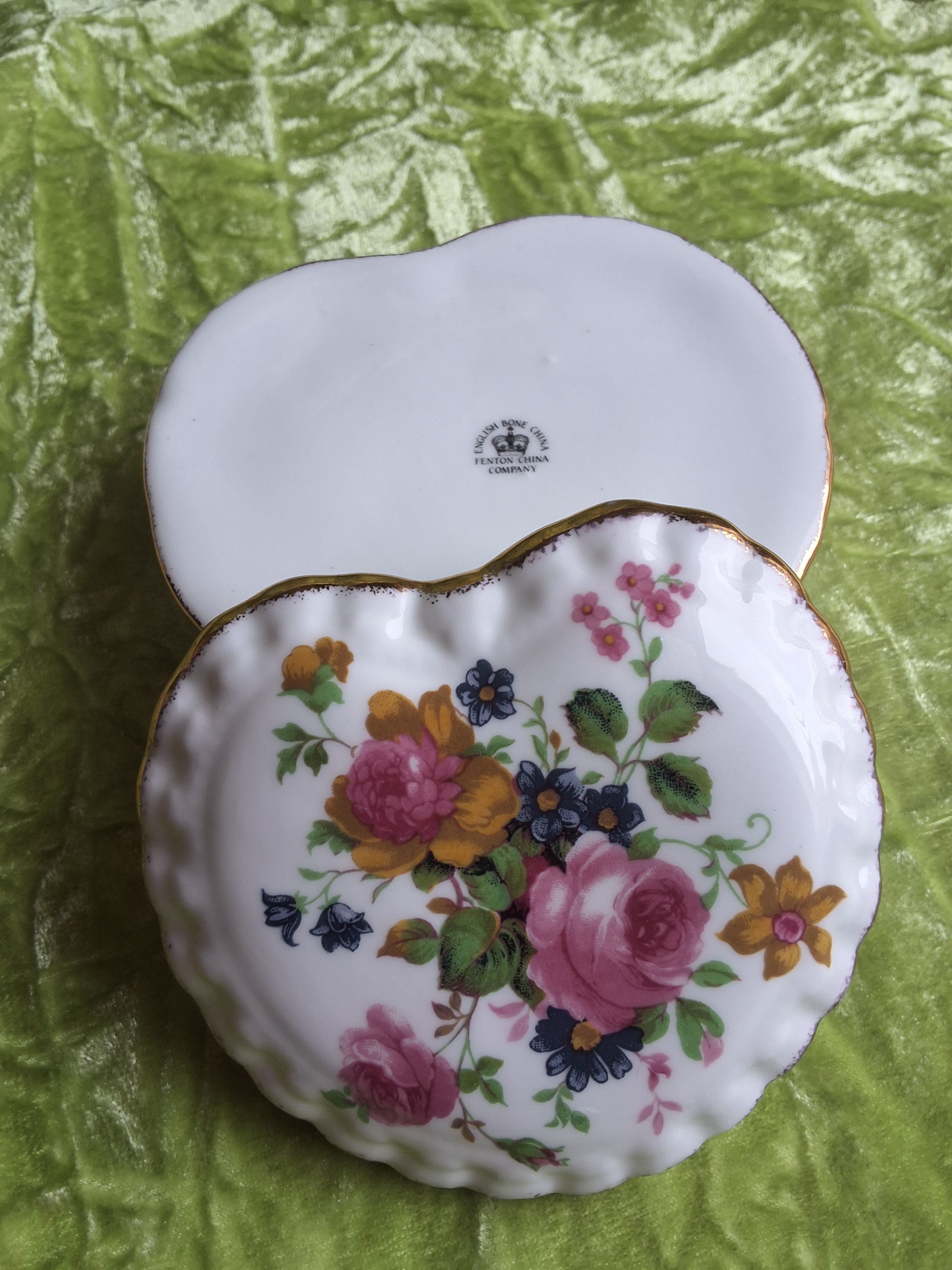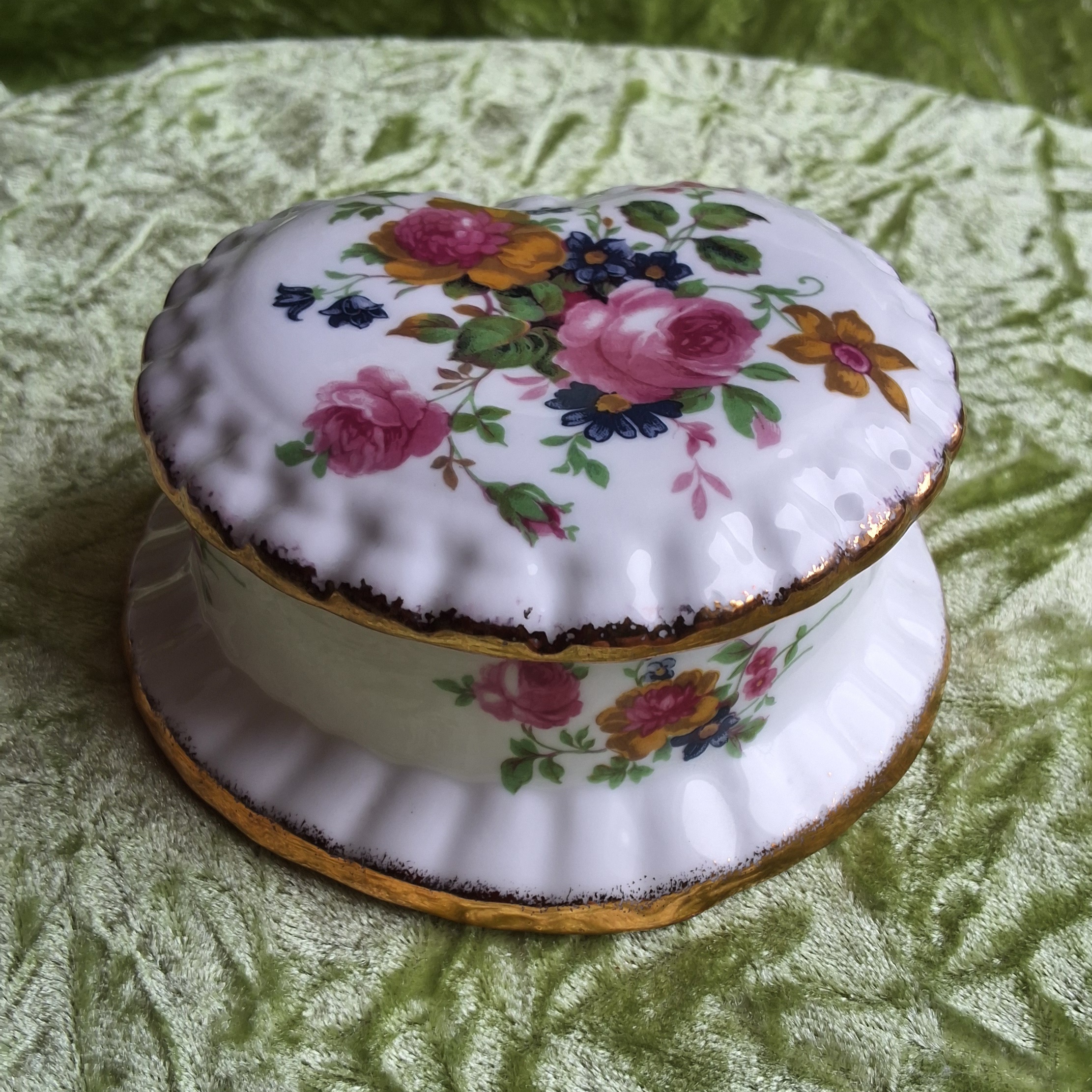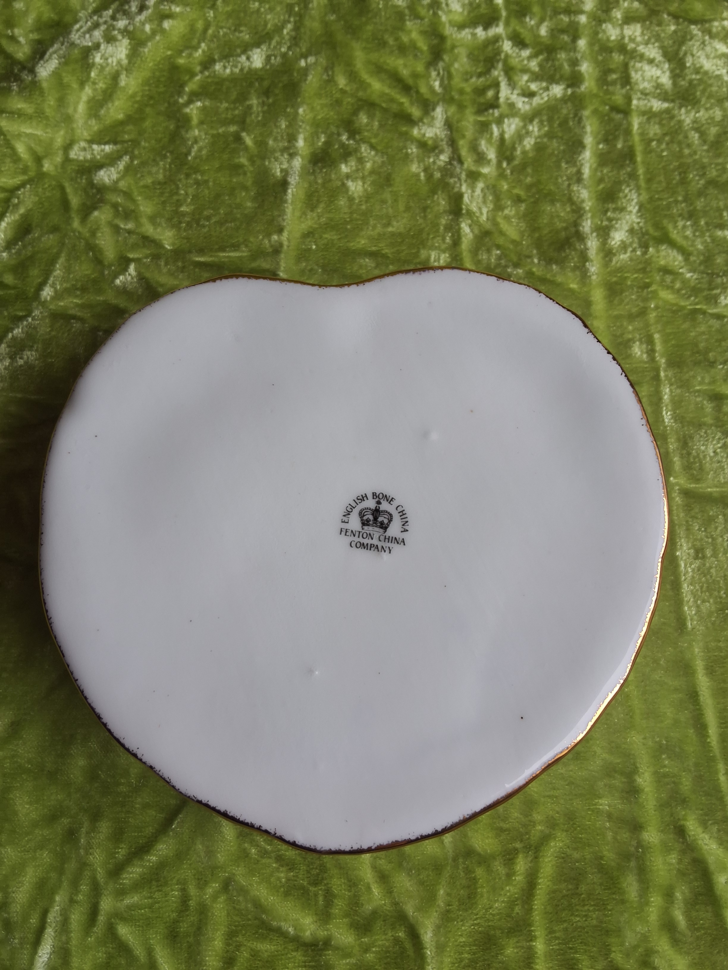 Diese Herzförmige Bone-China-Dose mit Goldrand ist ein Original aus den 1970er/ 80er Jahren aus Staffordshire, England. Der Original-Markenstempel auf dem Porzellanboden bestätigt die Echtheit des Kleinods.