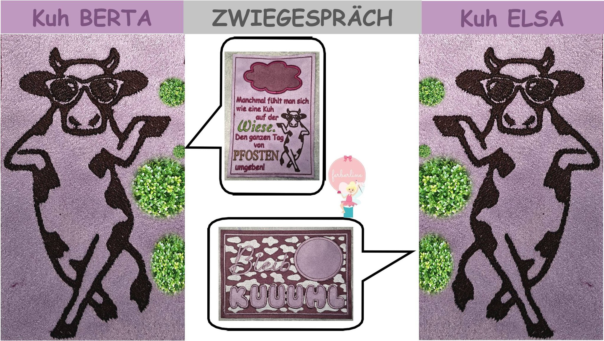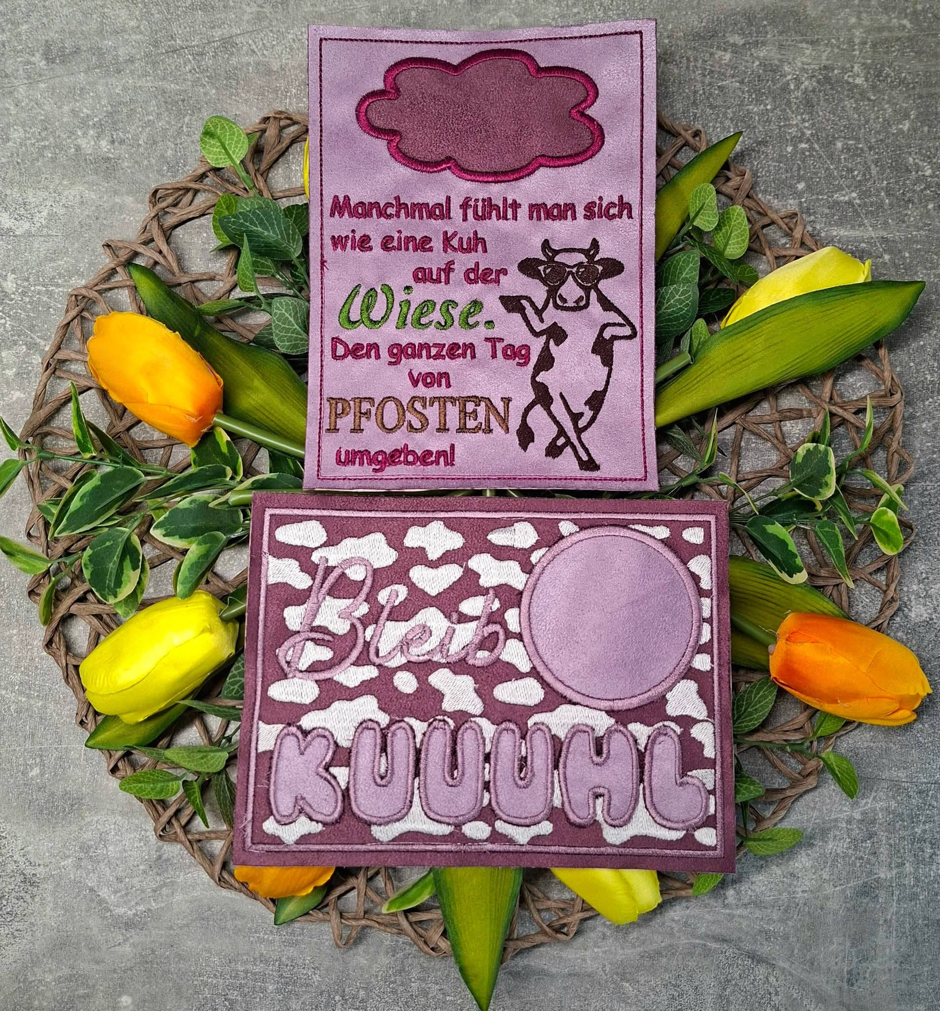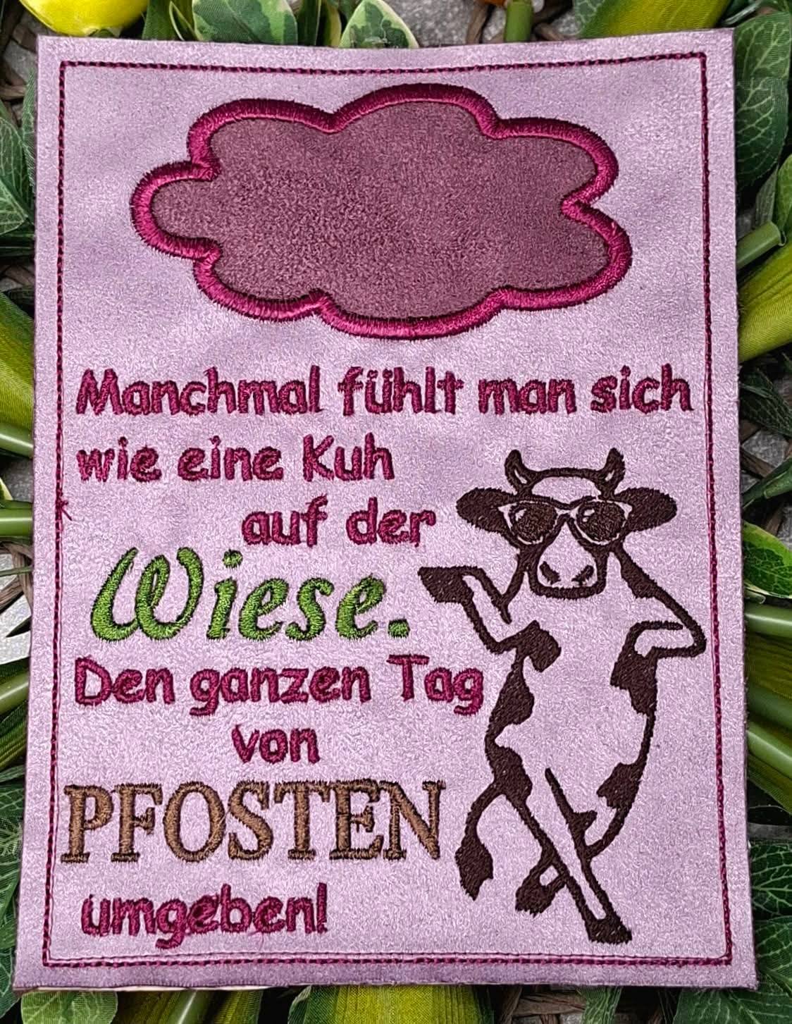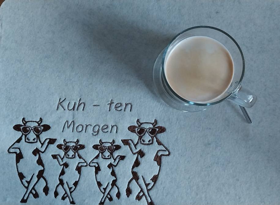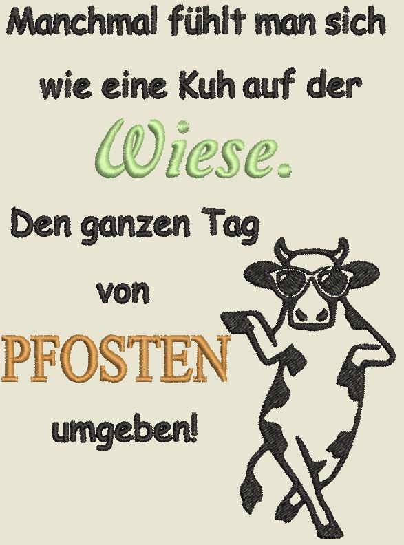 Im Set bekommt ihr 1 Stickdatei zur Fertigung des Mug Rugs mit dem tollen Spruch in der Größe 13x18cm in den Dateiformaten DST, PES, JEF, EXP, HUS, VP3, XXX und VIP, als Bonus den Spruch in der Größe 13x18cm und die Kuh einzeln in den Größen 6x10cm, 8x13cm und 10x18cm in den oben genannten Dateiformaten.
