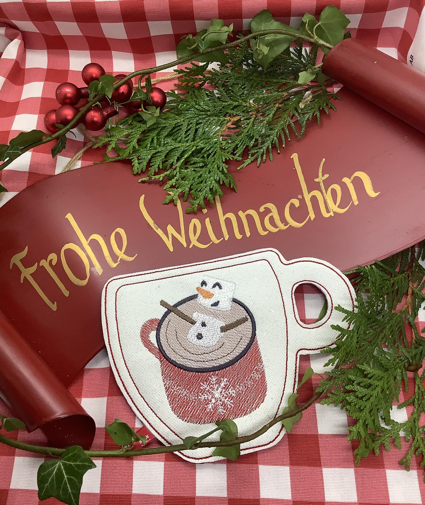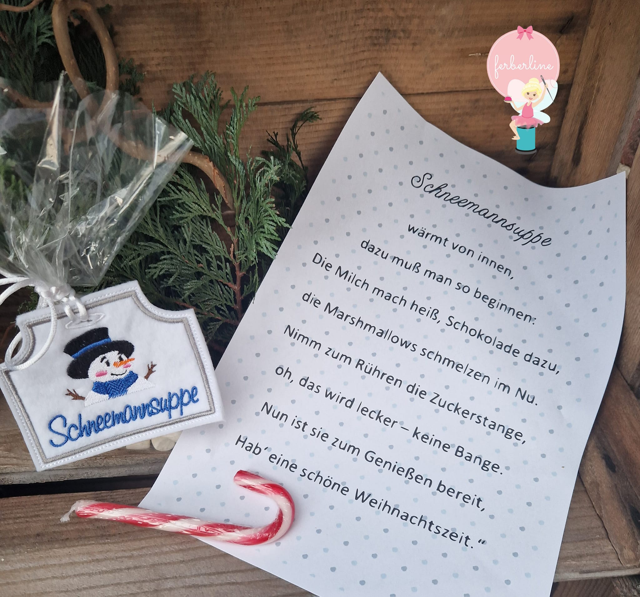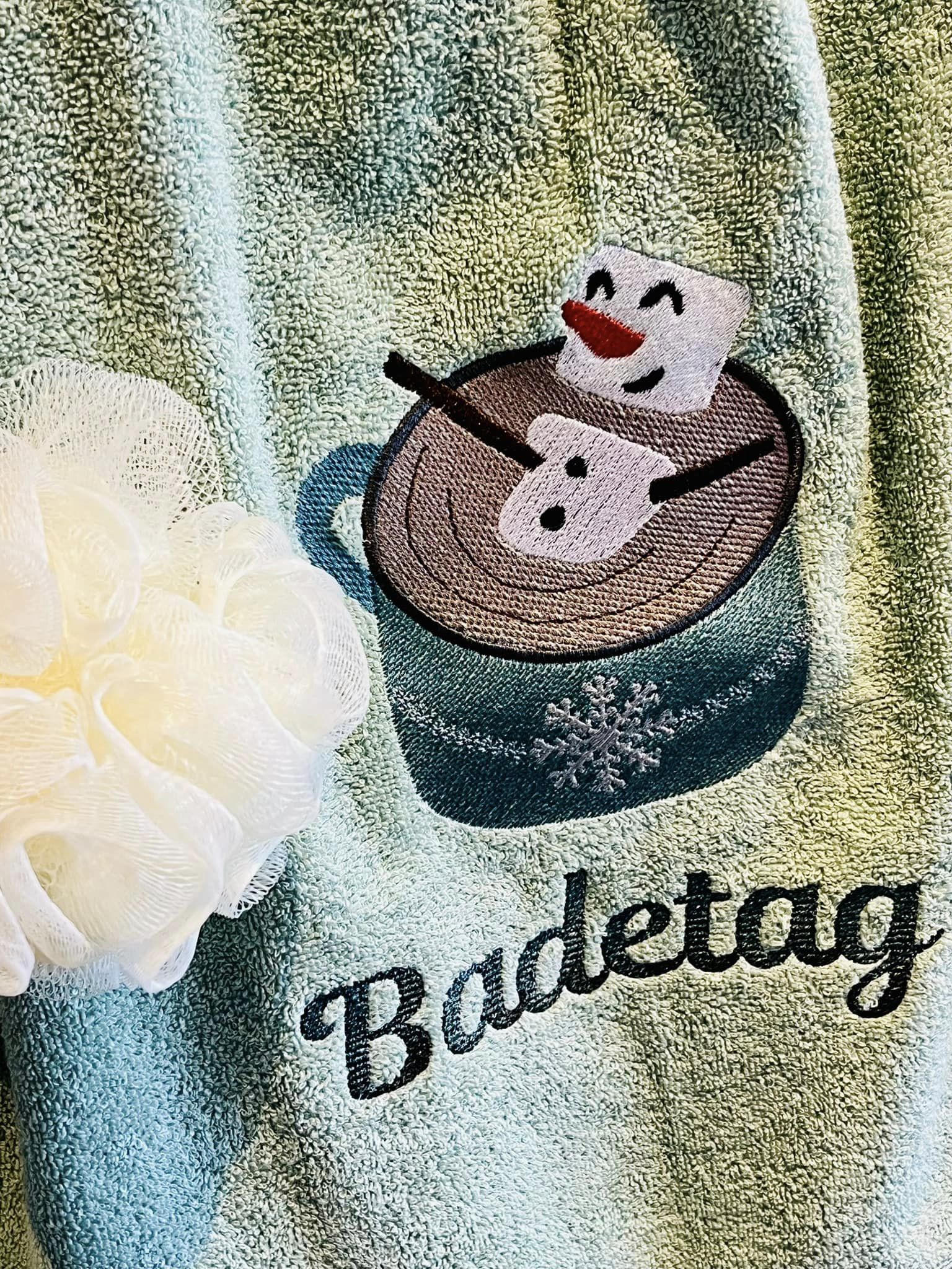 Im ZIP bekommt ihr je 1 Stickdatei für das kleine Schild in der Größe 8x10cm und je 1 Datei für die Tasse mit dem badenden Schneemann in den Größen 8x10cm und 13x16cm in den Dateiformaten DST, PES, JEF, EXP, HUS, VP3, XXX und VIP.