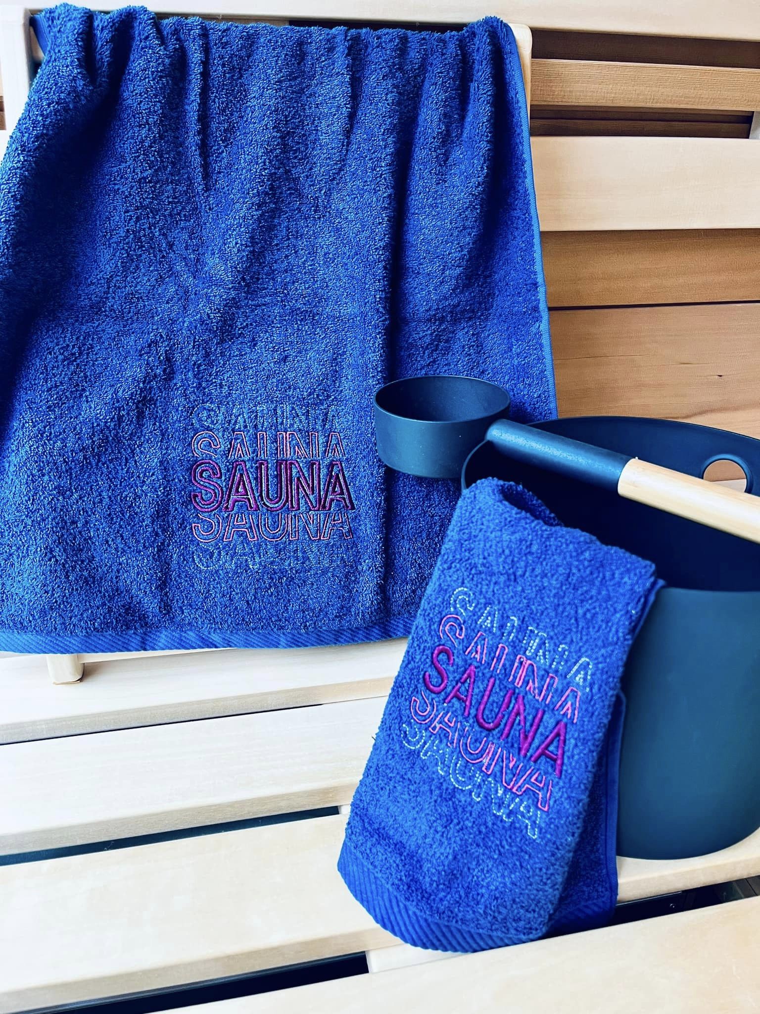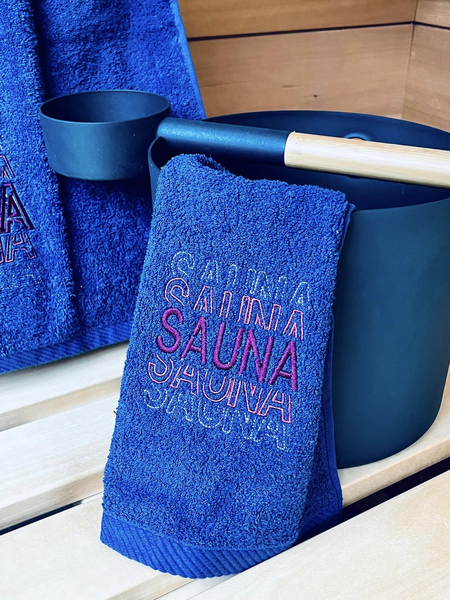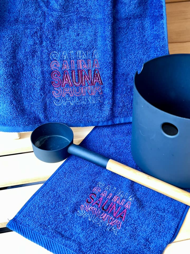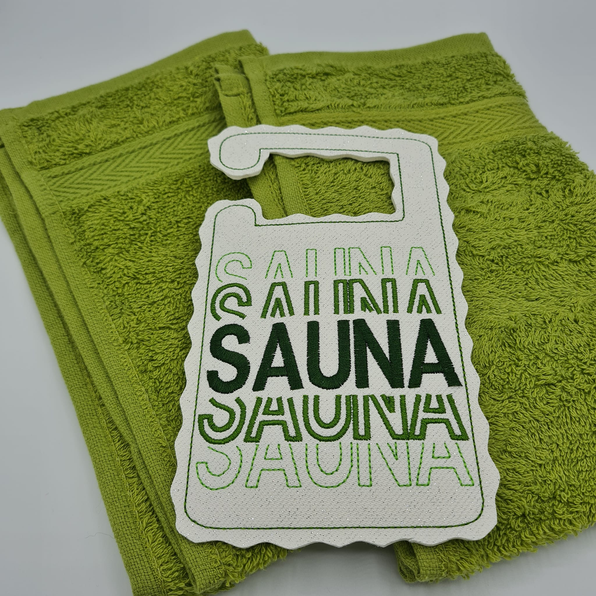 SAUNA ist als Appli erstellt, ihr könnt den Stoff aber auch weglassen und nur den Satinrand sticken.