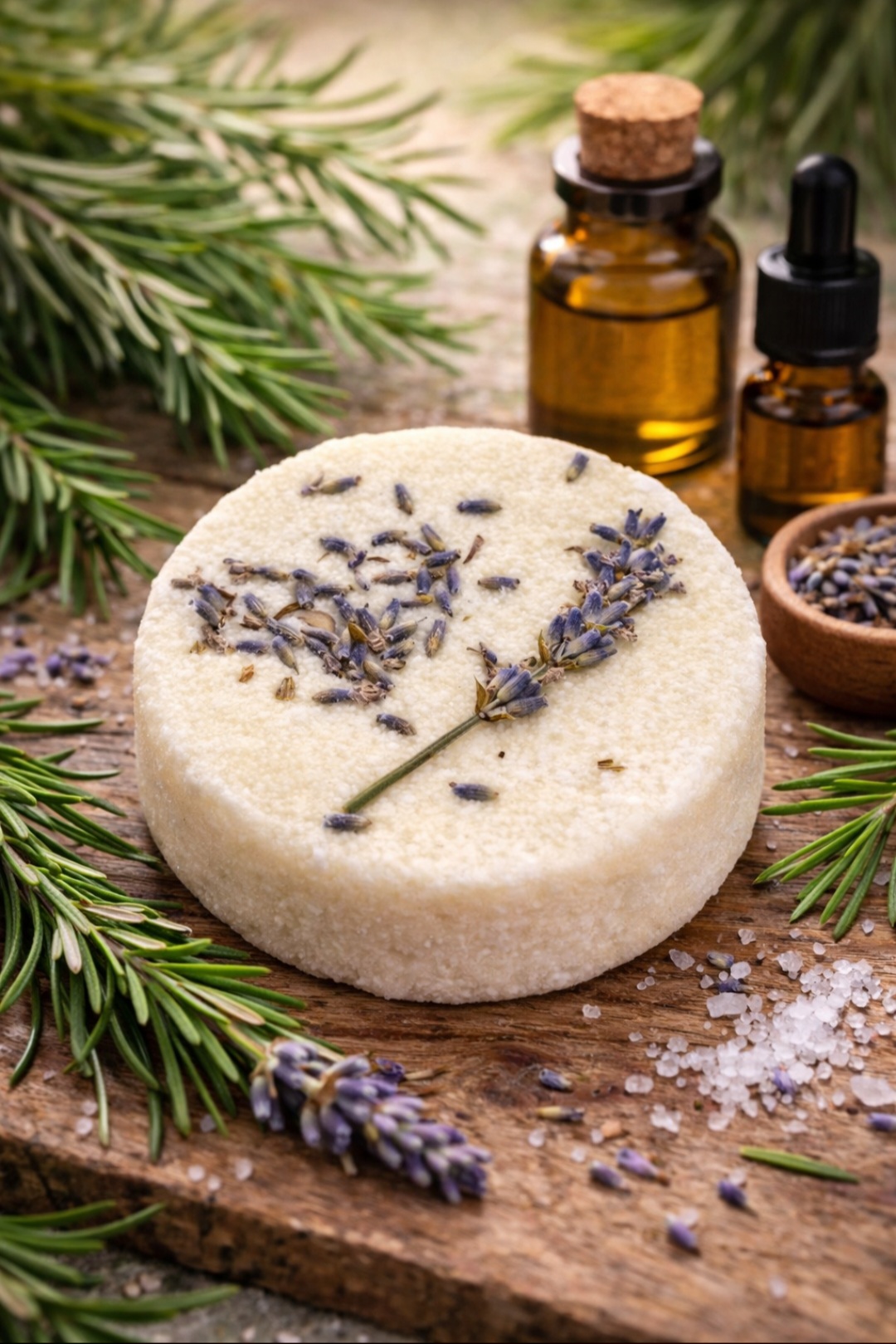 Veganes und pflegendes festes Shampoo Lavendel- Teebaumöl, verleiht deinem Haar Glanz und Geschmeidigkeit. Keine Spülung nötig da das Shampoostück mit pflegender Bio Sheabutter ist.