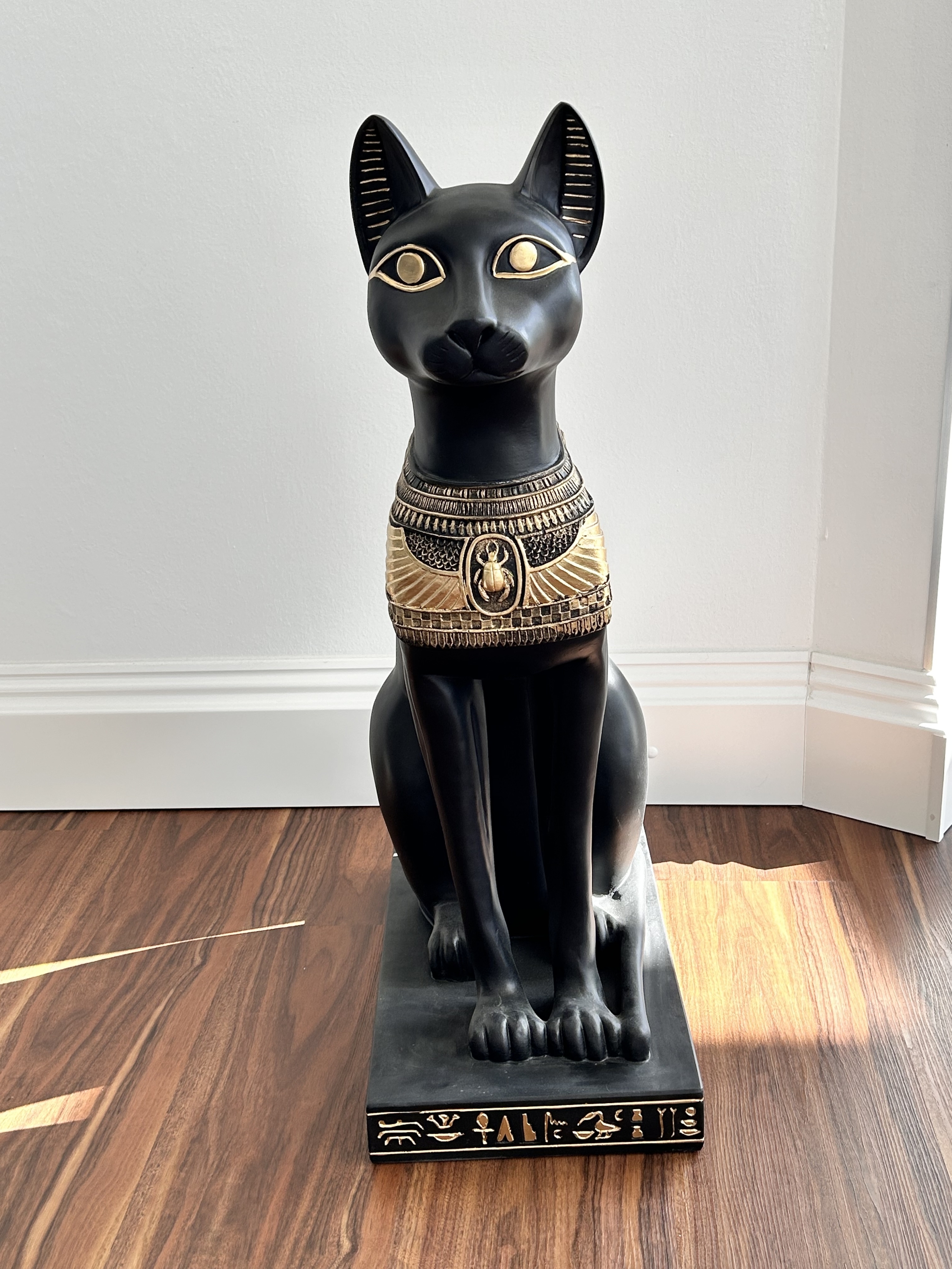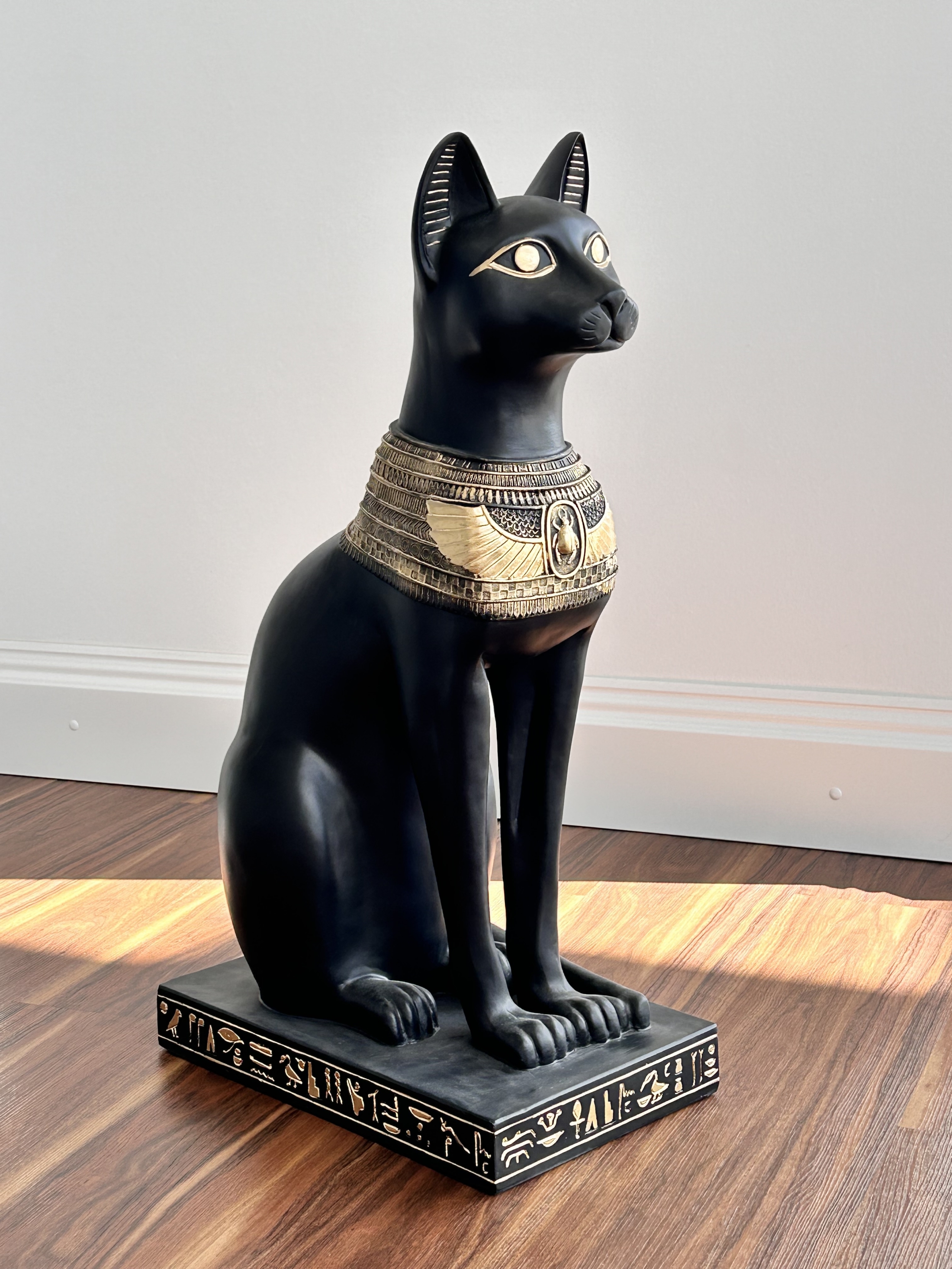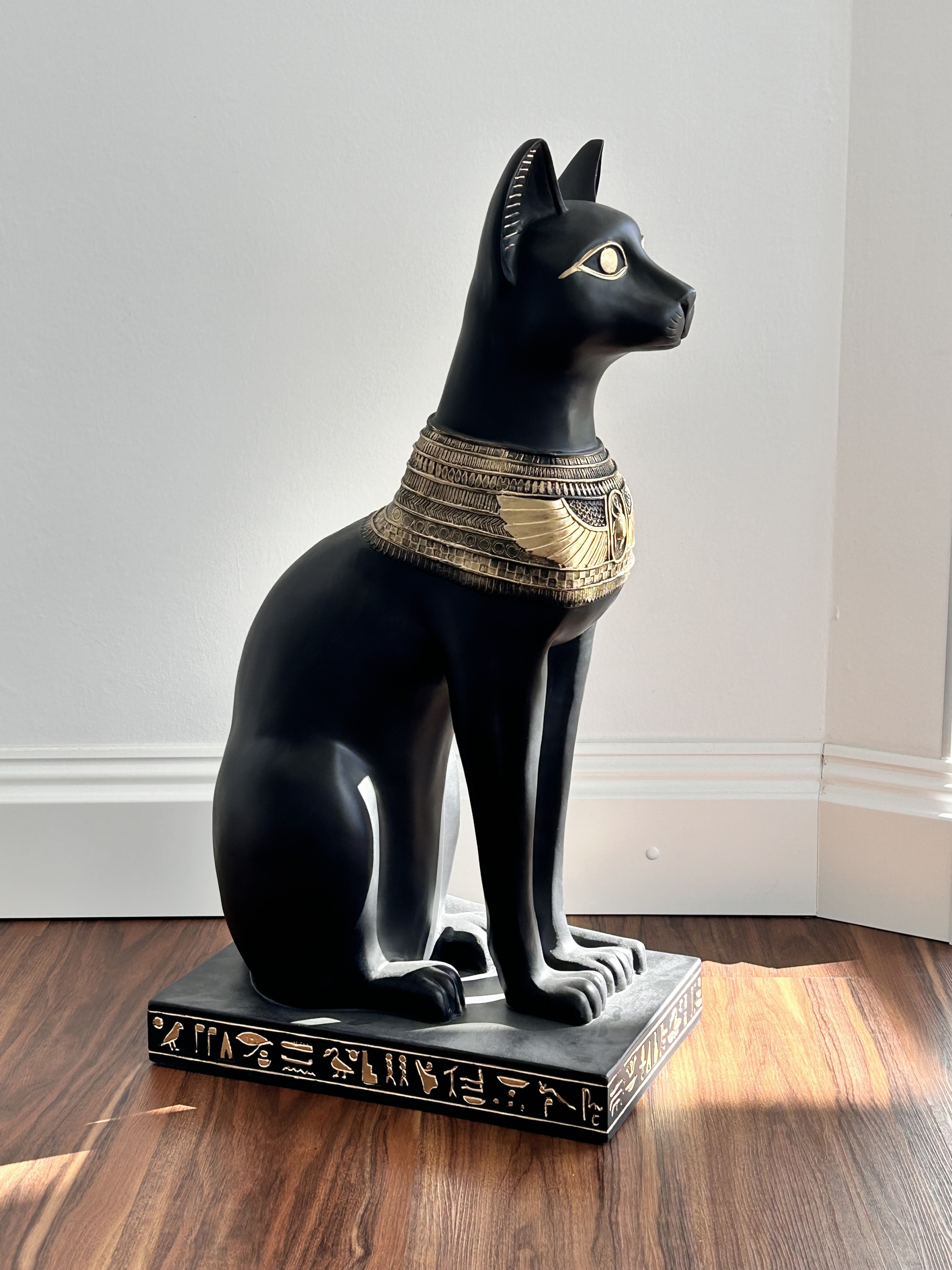 Figur einer ägyptischen Katze mit Skarabäus. 39 cm.