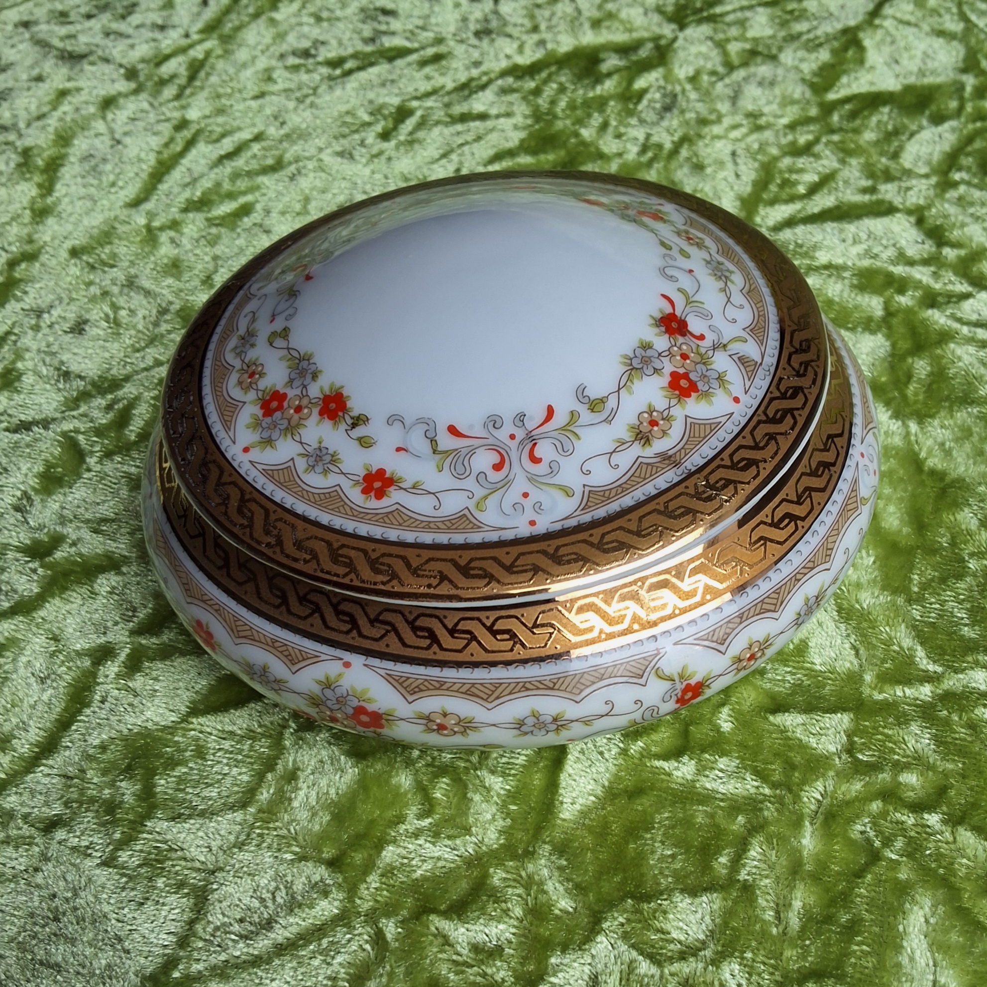 Dieses Porzellandöschen ist vintage. Es hatte ein "früheres Leben". Bitte beachten Sie, dass kleinere Unregelmäßigkeiten und Mängel vorhanden sein können. Leichter, auf dem Foto kaum darstellbarer Abrieb an der Goldbordüre des Deckels (siehe Bilder).