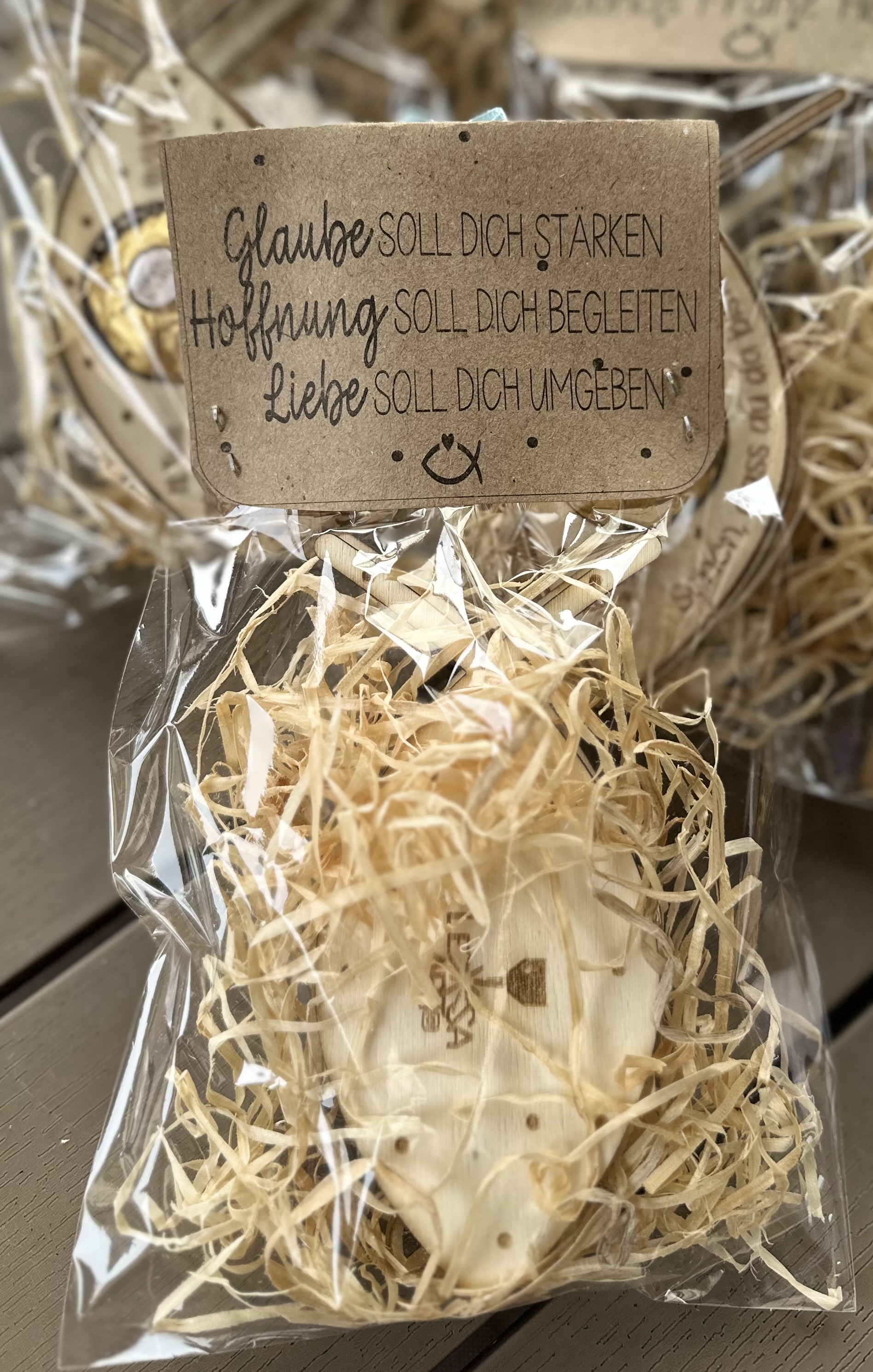 Unser liebevoll gelaserter Holz-Fisch wird mit einem Ferrero Rocher gefüllt und ist ein wunderschönes Erinnerungsstück.