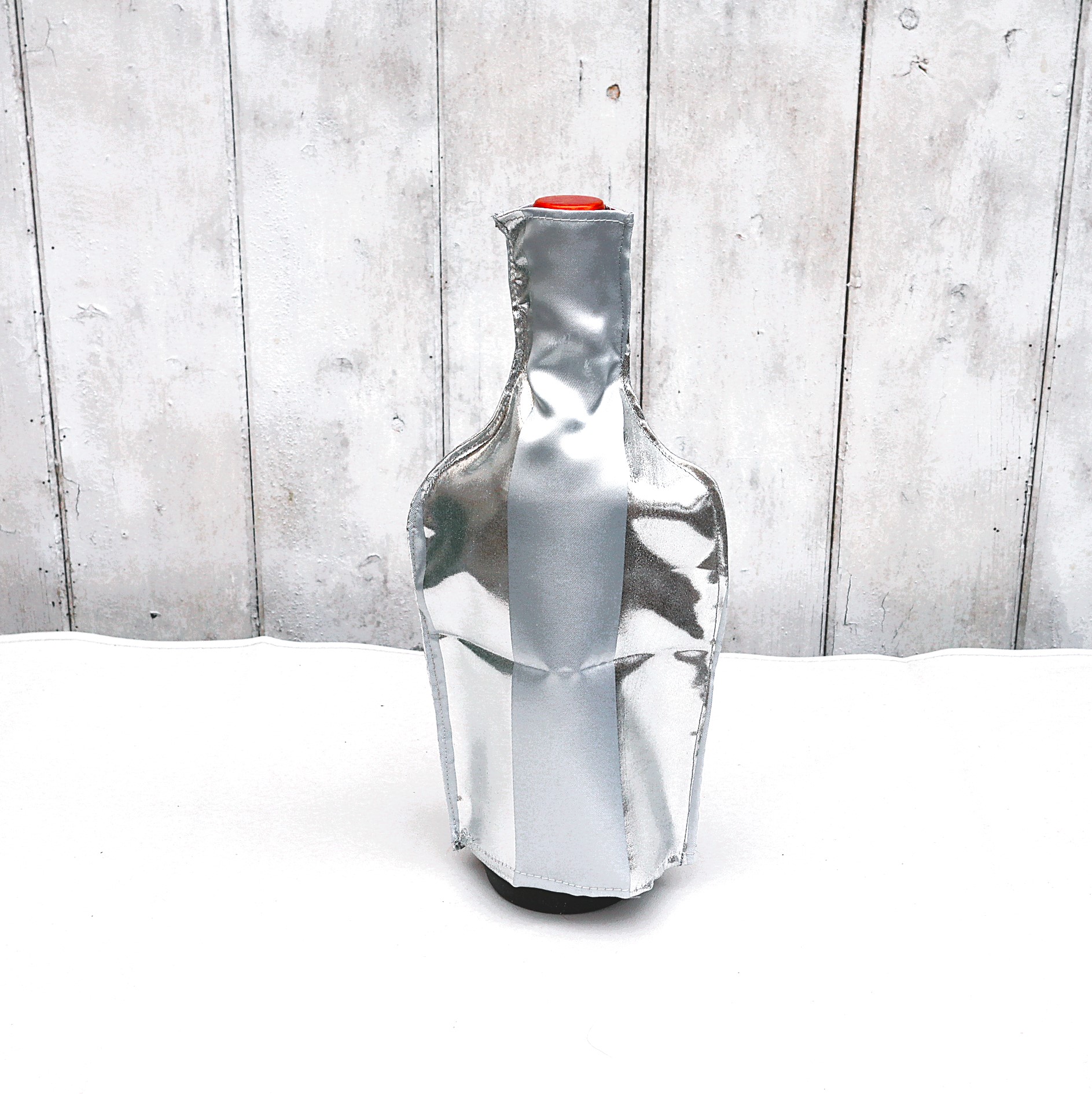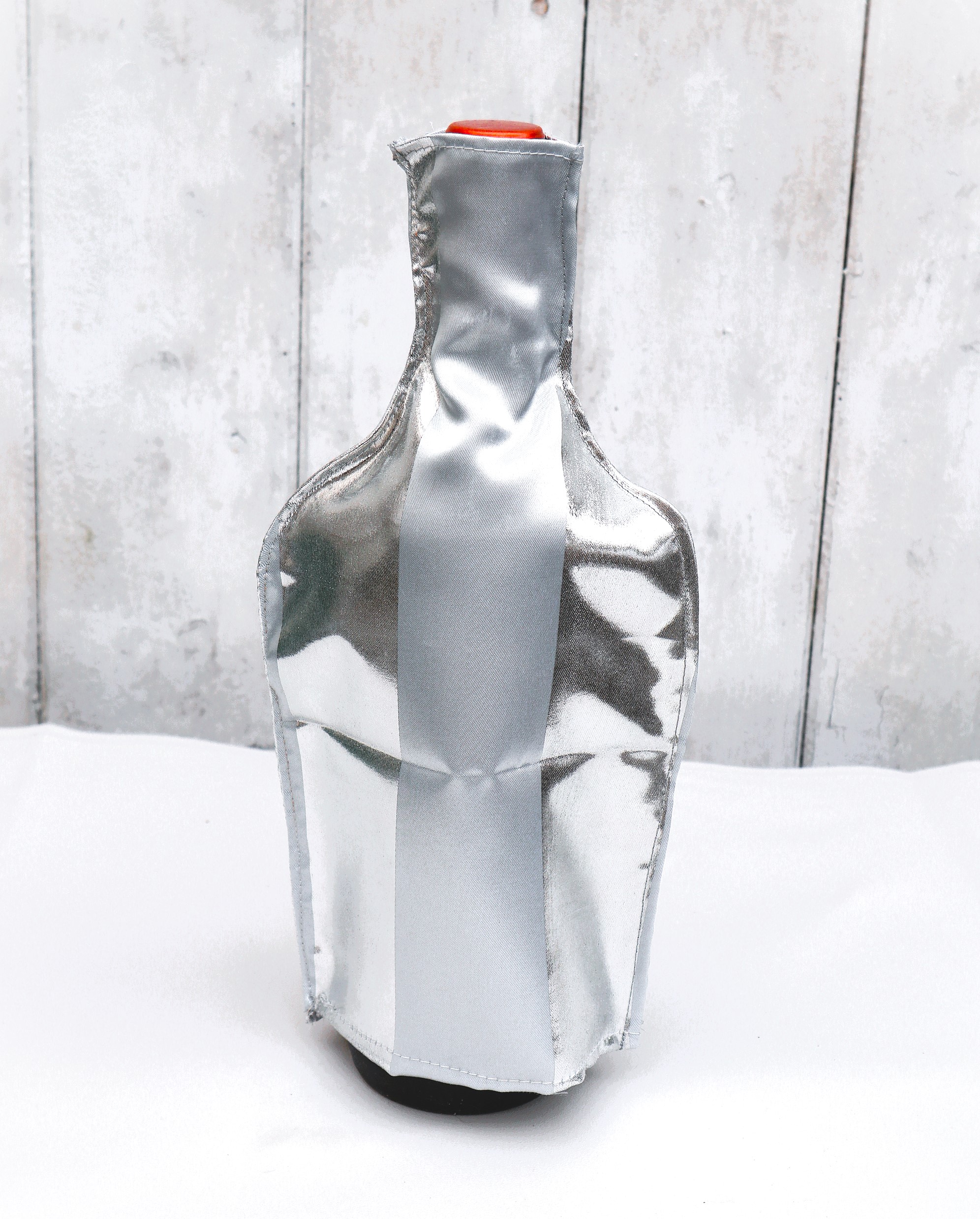 Flaschenhusse, handgefertigt aus einem edlen Stoff mit grauen und silberfarbigen Streifen.