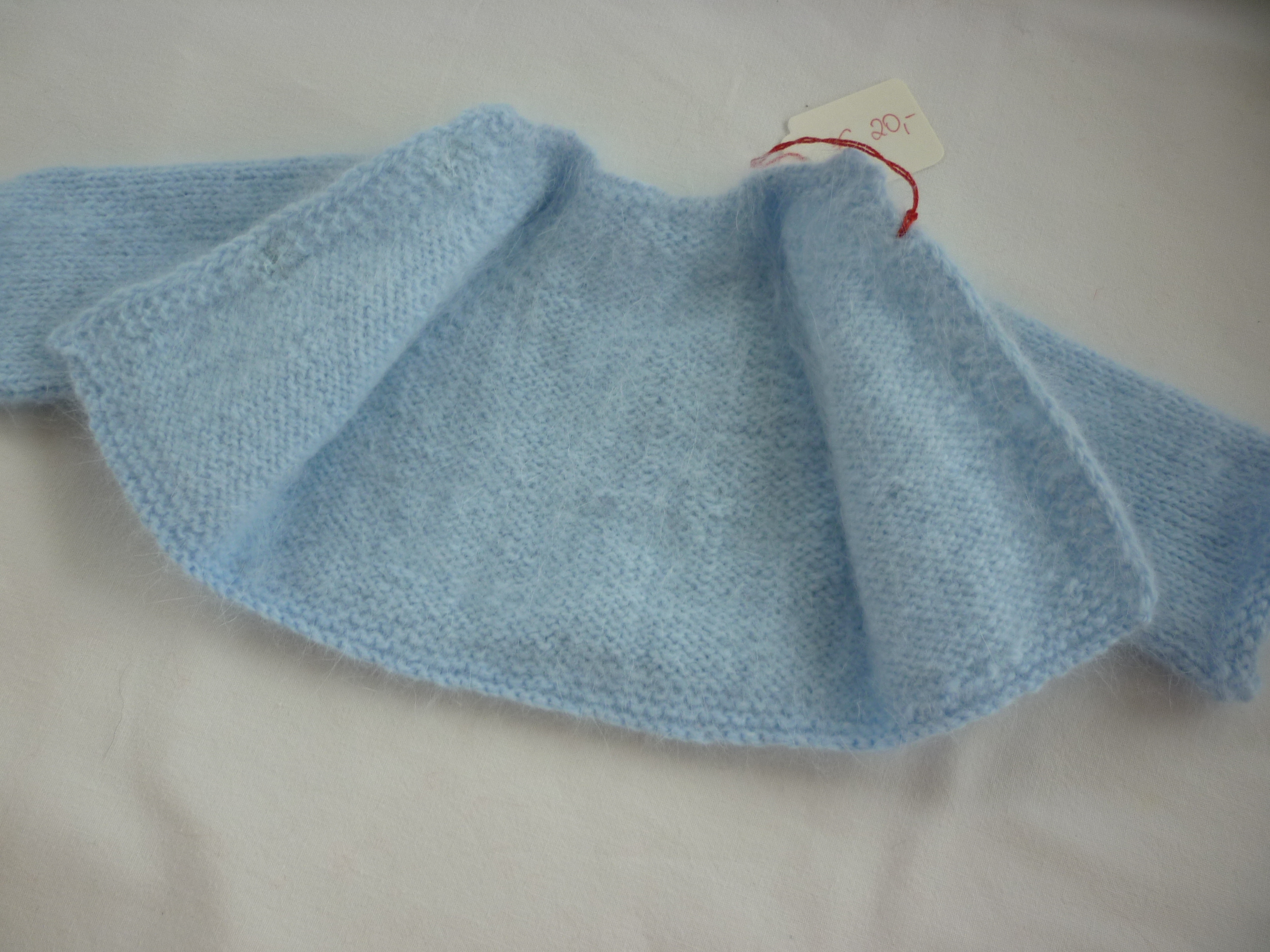 Diese flauschige, zarte Strickjacke passt farblich perfekt zu dem blauen Kleid im nachfolgenden Angebot und ist für die kleinere Puppengröße (39 - 40 cm) gestrickt.