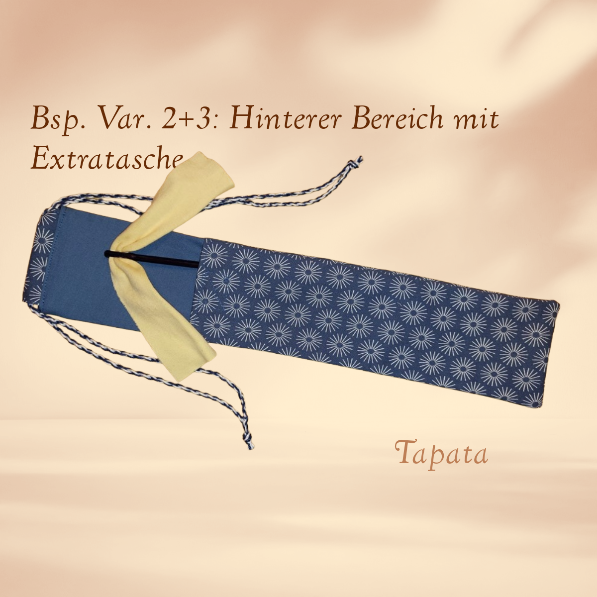 * Variante 2: Einlagige Flötentasche mit 1 Zubehörfach, Größe: Länge ca. 38 cm, Breite ca. 7 cm. Auf der Rückseite bietet ein zusätzliches Fach (ca. 24 cm lang) Platz für Zubehör wie Wischerstab, Mikrofaserwischer oder Zapfenfett.