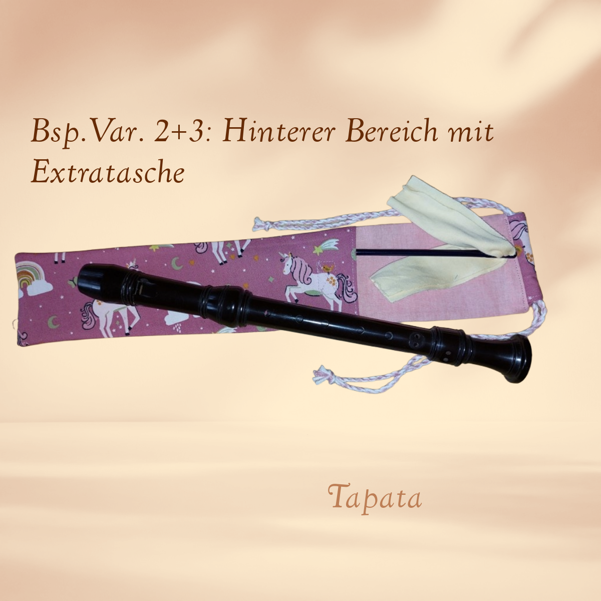 * Variante 2: Einlagige Flötentasche mit 1 Zubehörfach, Größe: Länge ca. 38 cm, Breite ca. 7 cm. Auf der Rückseite bietet ein zusätzliches Fach (ca. 24 cm lang) Platz für Zubehör wie Wischerstab, Mikrofaserwischer oder Zapfenfett.
