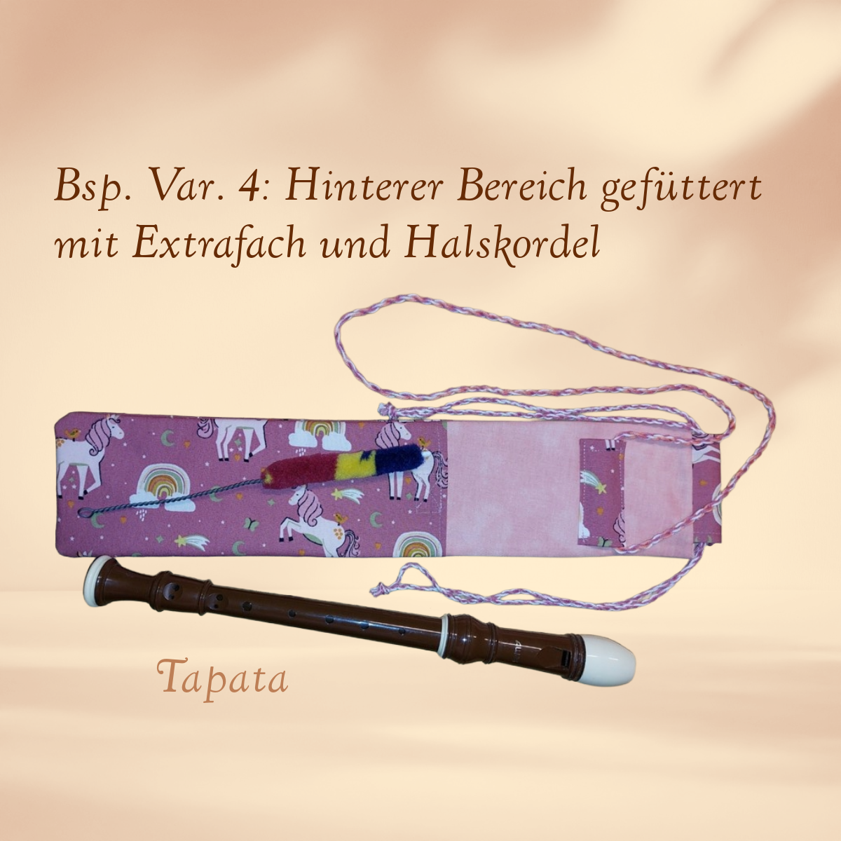 * Variante 4: Doppellagige Flötentasche mit Halskordel und 1 Zubehörfach, Größe: Länge ca. 42 cm, Breite ca. 8 cm. Zusätzlich zur Variante 3 ist eine Halskordel angebracht, damit man die Flöte bequem um den Hals tragen kann.