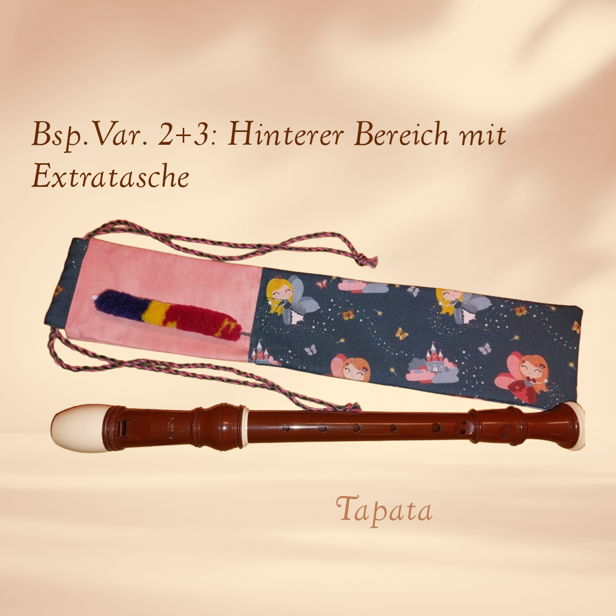 * Variante 2: Einlagige Flötentasche mit 1 Zubehörfach, Größe: Länge ca. 38 cm, Breite ca. 7 cm. Auf der Rückseite bietet ein zusätzliches Fach (ca. 24 cm lang) Platz für Zubehör wie Wischerstab, Mikrofaserwischer oder Zapfenfett.