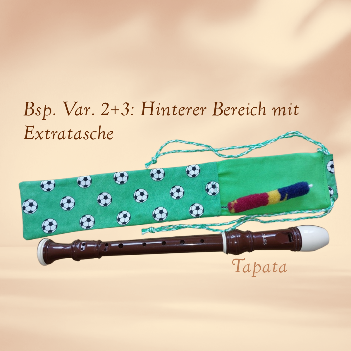 * Variante 2: Einlagige Flötentasche mit 1 Zubehörfach, Größe: Länge ca. 38 cm, Breite ca. 7 cm. Auf der Rückseite bietet ein zusätzliches Fach (ca. 24 cm lang) Platz für Zubehör wie Wischerstab, Mikrofaserwischer oder Zapfenfett.