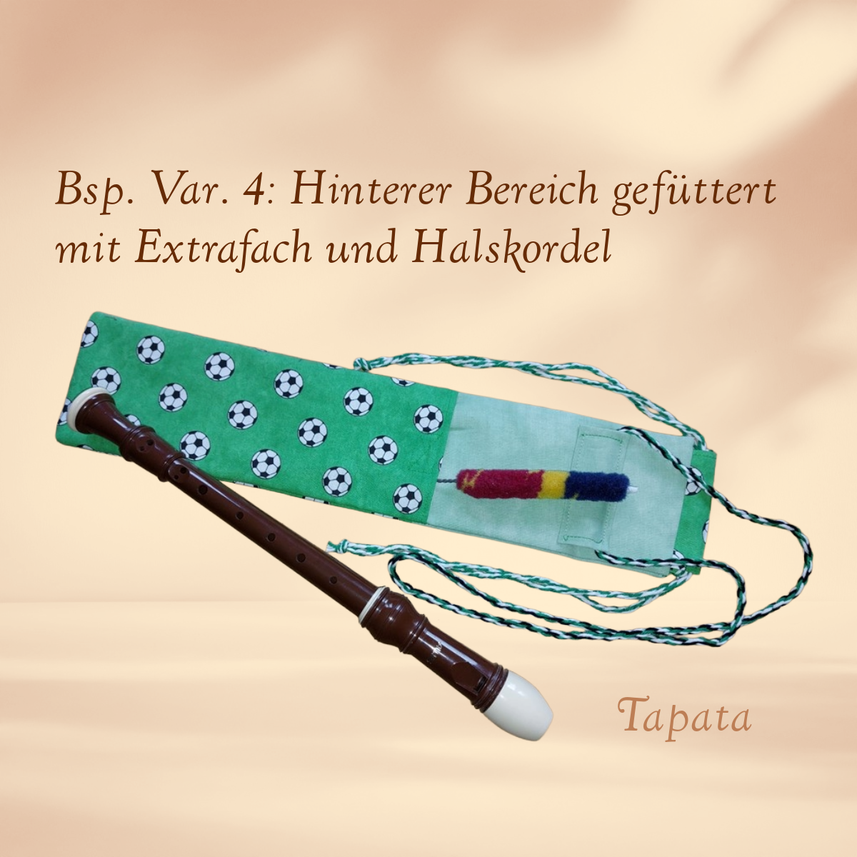 * Variante 4: Doppellagige Flötentasche mit Halskordel und 1 Zubehörfach, Größe: Länge ca. 42 cm, Breite ca. 8 cm. Zusätzlich zur Variante 3 ist eine Halskordel angebracht, damit man die Flöte bequem um den Hals tragen kann.