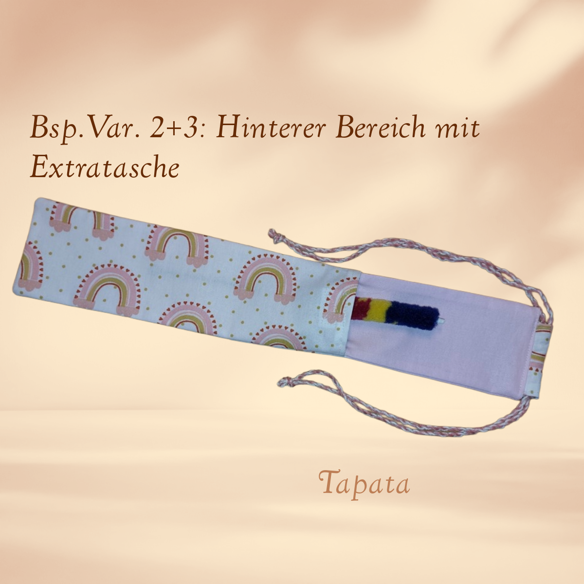 * Variante 1: Einlagige Flötentasche ohne Zubehörfach, Größe: Länge ca. 38 cm, Breite ca. 7 cm. Die Vorderseite zeigt Name und Farbmotiv, die Rückseite komplett das Farbmuster.