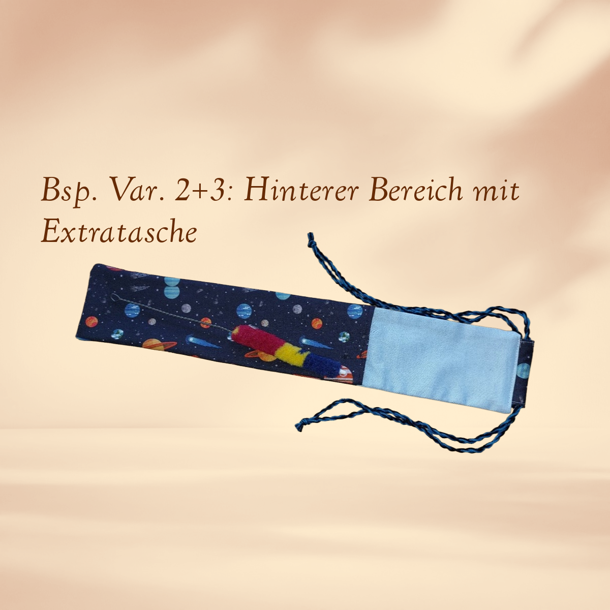 * Variante 1: Einlagige Flötentasche ohne Zubehörfach, Größe: Länge ca. 38 cm, Breite ca. 7 cm. Die Vorderseite zeigt Name und Farbmotiv, die Rückseite komplett das Farbmuster.