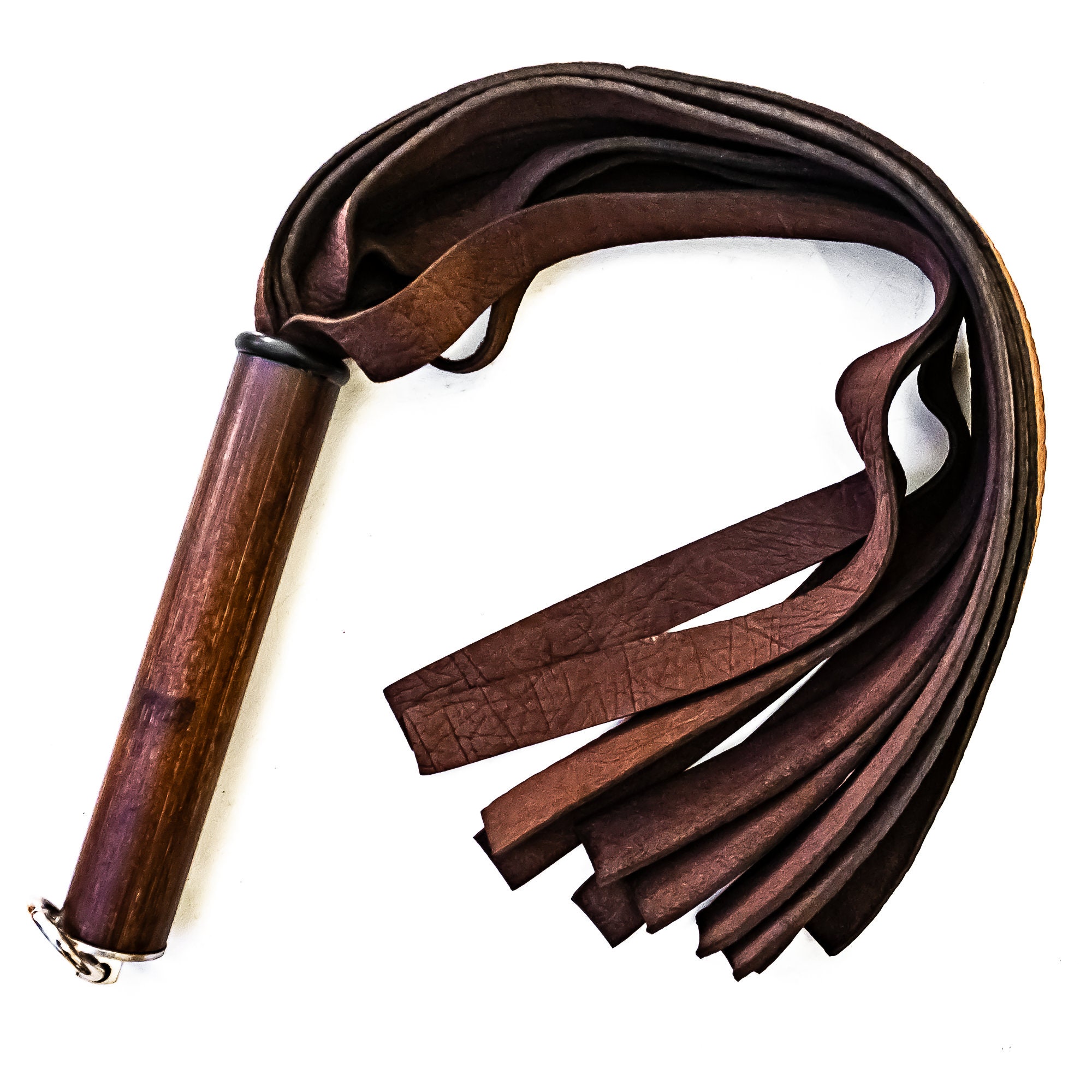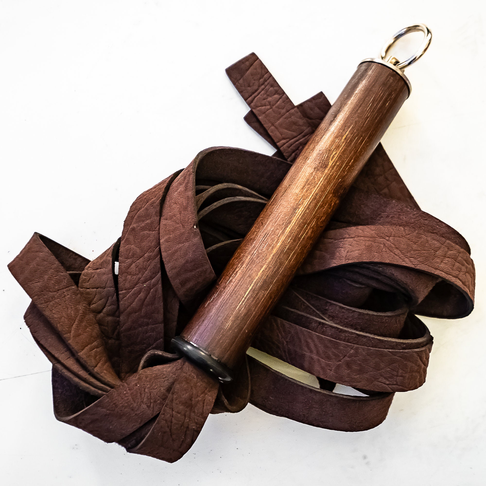 Flogger mit 12 Strängen aus 20mm x 2mm weichem Lamm-Veloursleder mit Bisonhaut-Prägung, ca. 61cm/24", davon ca. 17cm/7" Griff aus individuell gefärbtem Bambusholz, veredelt und poliert mit feinstem Lack und mit dem neuen großen Abschluss aus V2A Edelstahl.