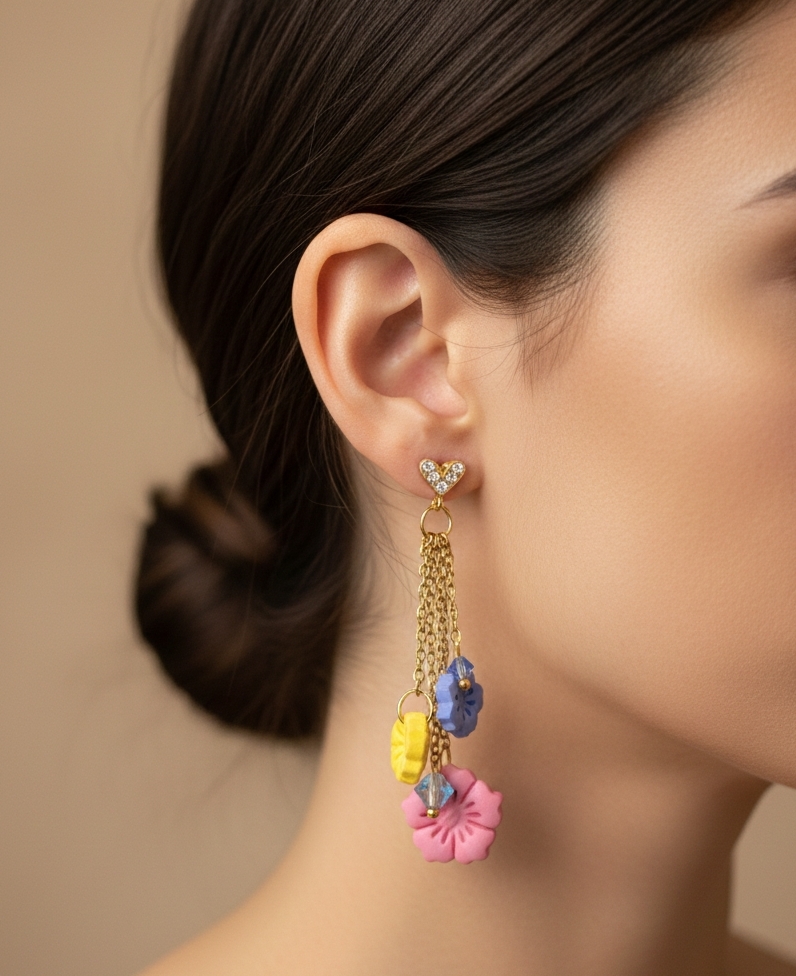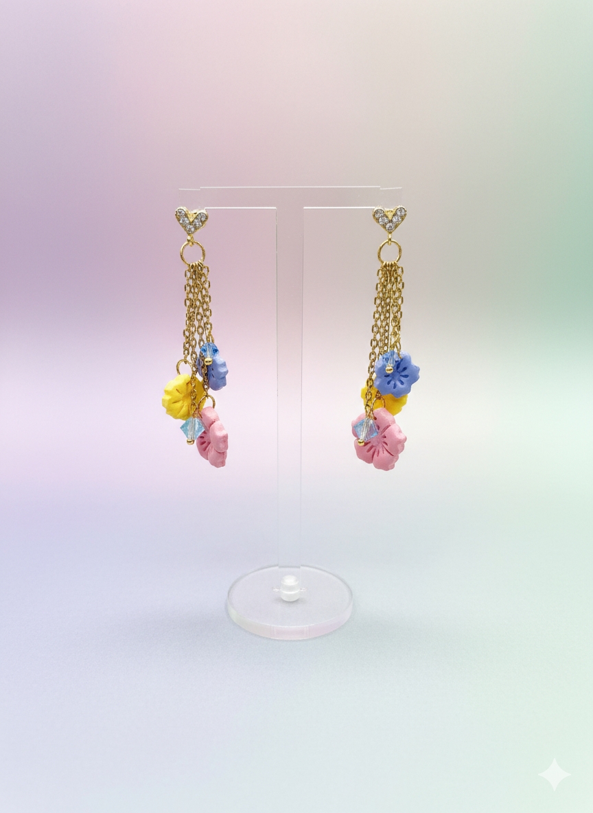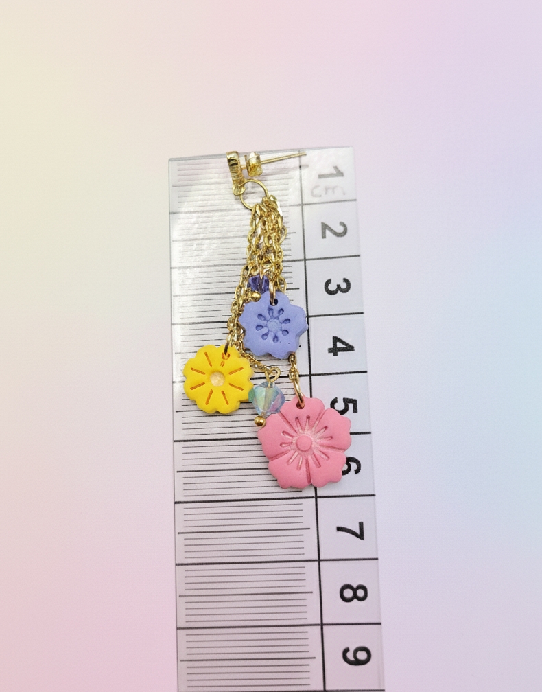 Drei Blüten: Jeder Ohrring trägt drei filigrane Blüten in den sanften Pastelltönen Gelb, Rosa und Blau.