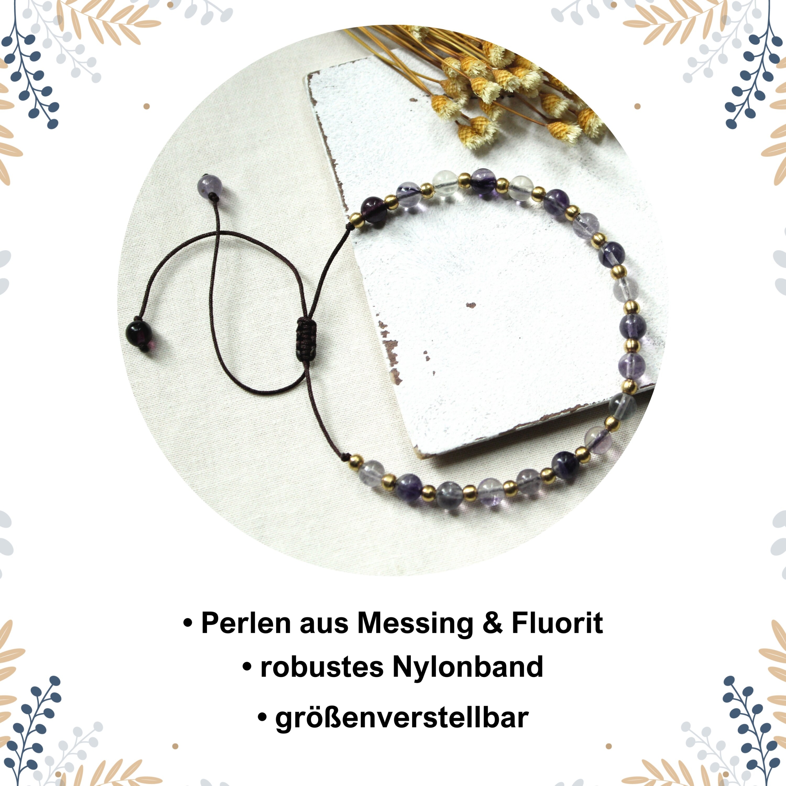 Die zarten Perlen aus Fluorit verleihen dem Fußkettchen eine elegante Note. Kombiniert mit dem warmes Glanz des Messings entsteht eine harmonische Verbindung. Die Fußkette wurde auf robustem Nylonband in dunkelbraun aufgefädelt, was sie nicht nur langlebig und strapazierfähig macht, sondern auch eine bequeme Passform gewährleistet.