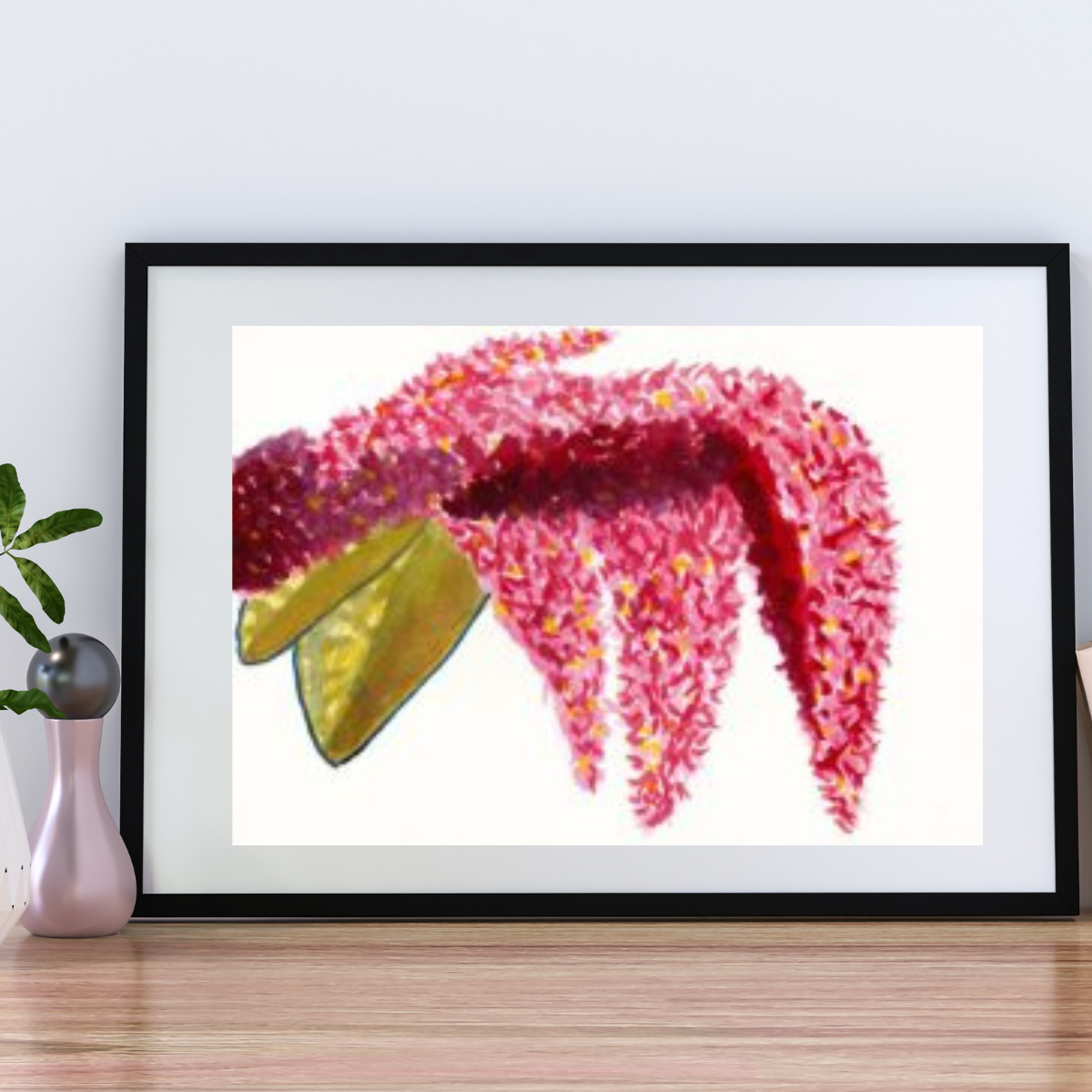 Mit höchster Präzision und Liebe zum Detail wurden lichtechte Aquarellfarben verwendet, die selbst nach Jahren nichts von ihrer Brillanz verlieren. Das Spiel zwischen den kräftigen Pinktönen der Blüten und dem sanften Grün der Blätter macht dieses Bild zu einem zeitlosen Blickfang.