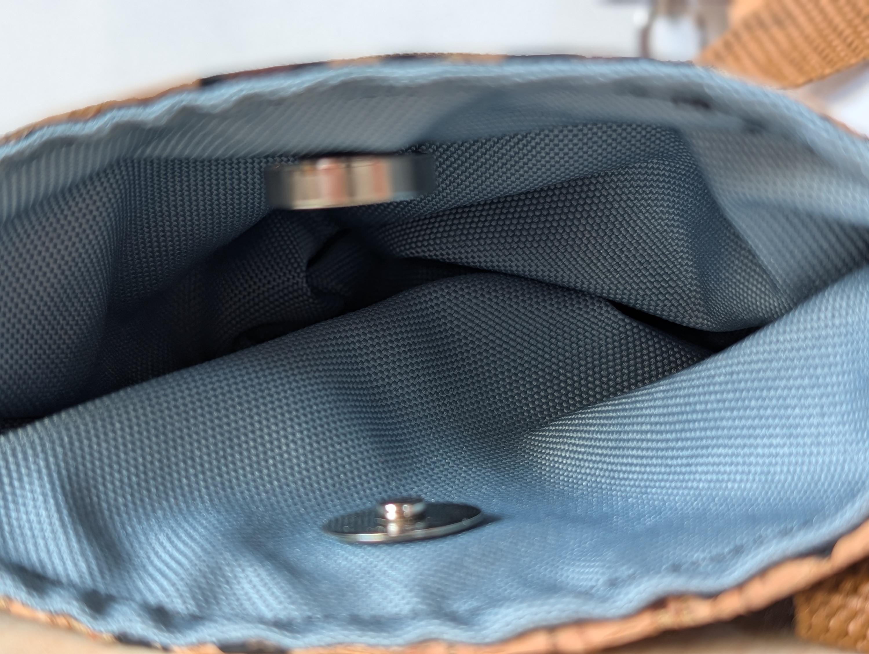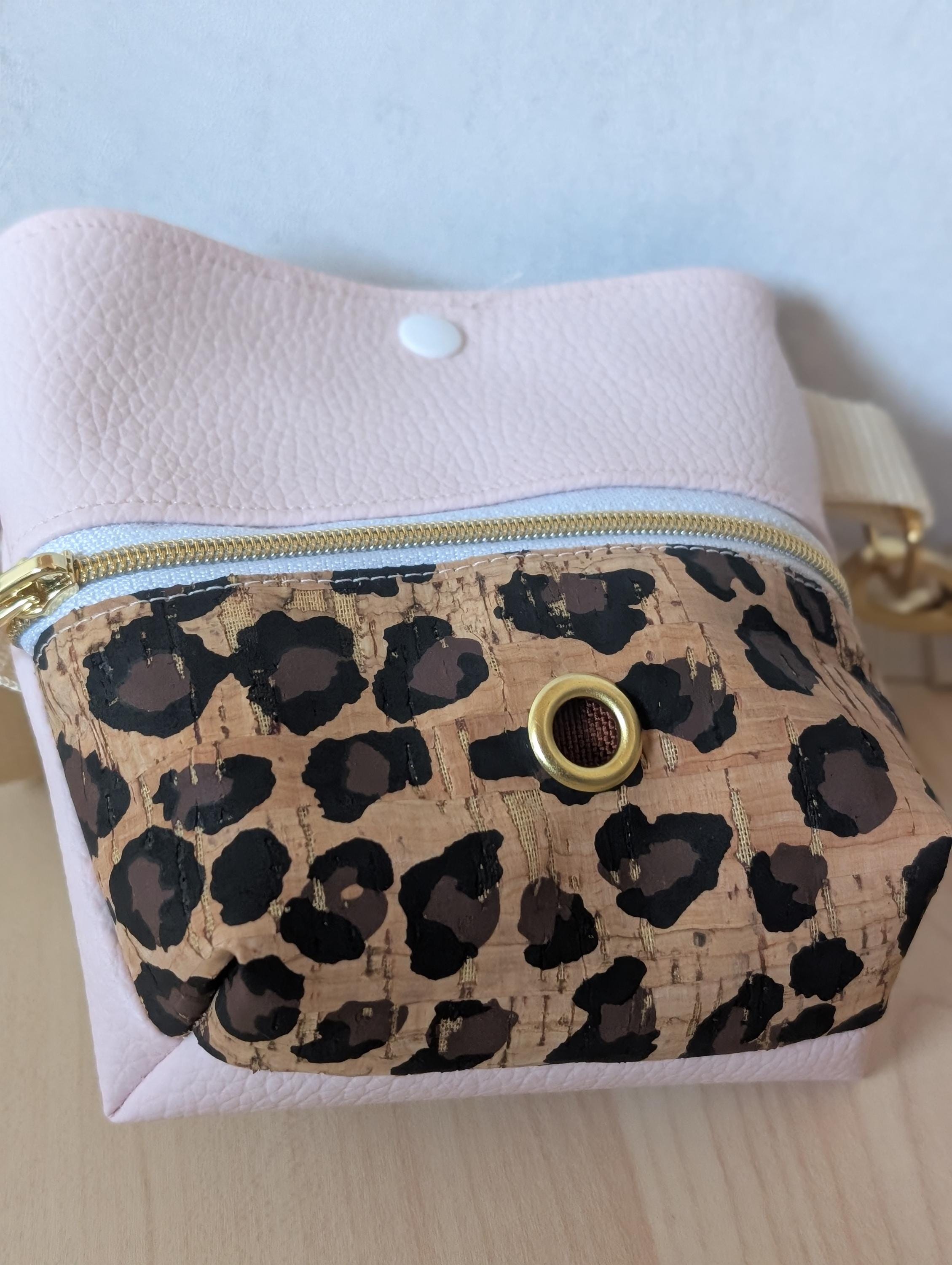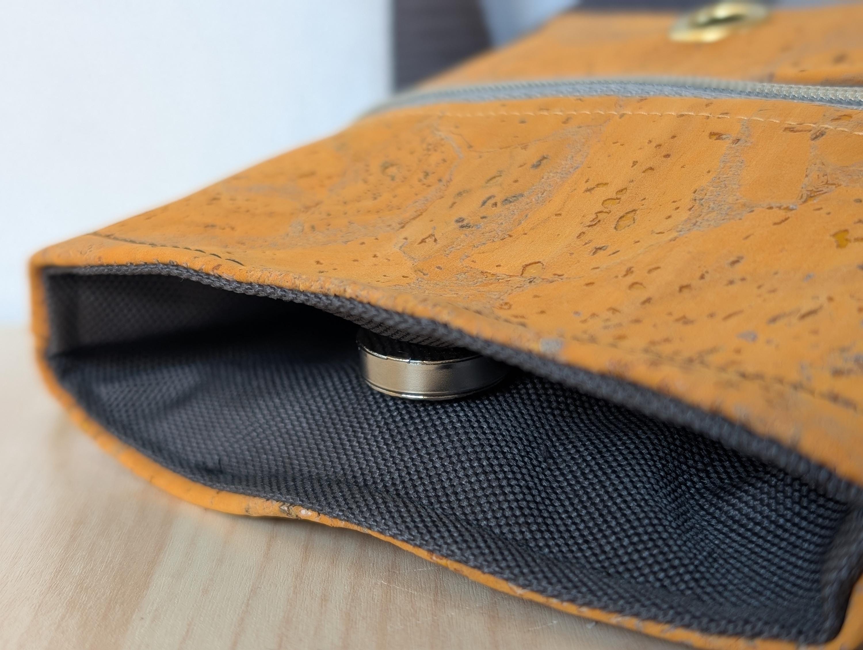 - Korkstoff oder veganes Leder, Ösen, Taschenkarabiner, Gurtband