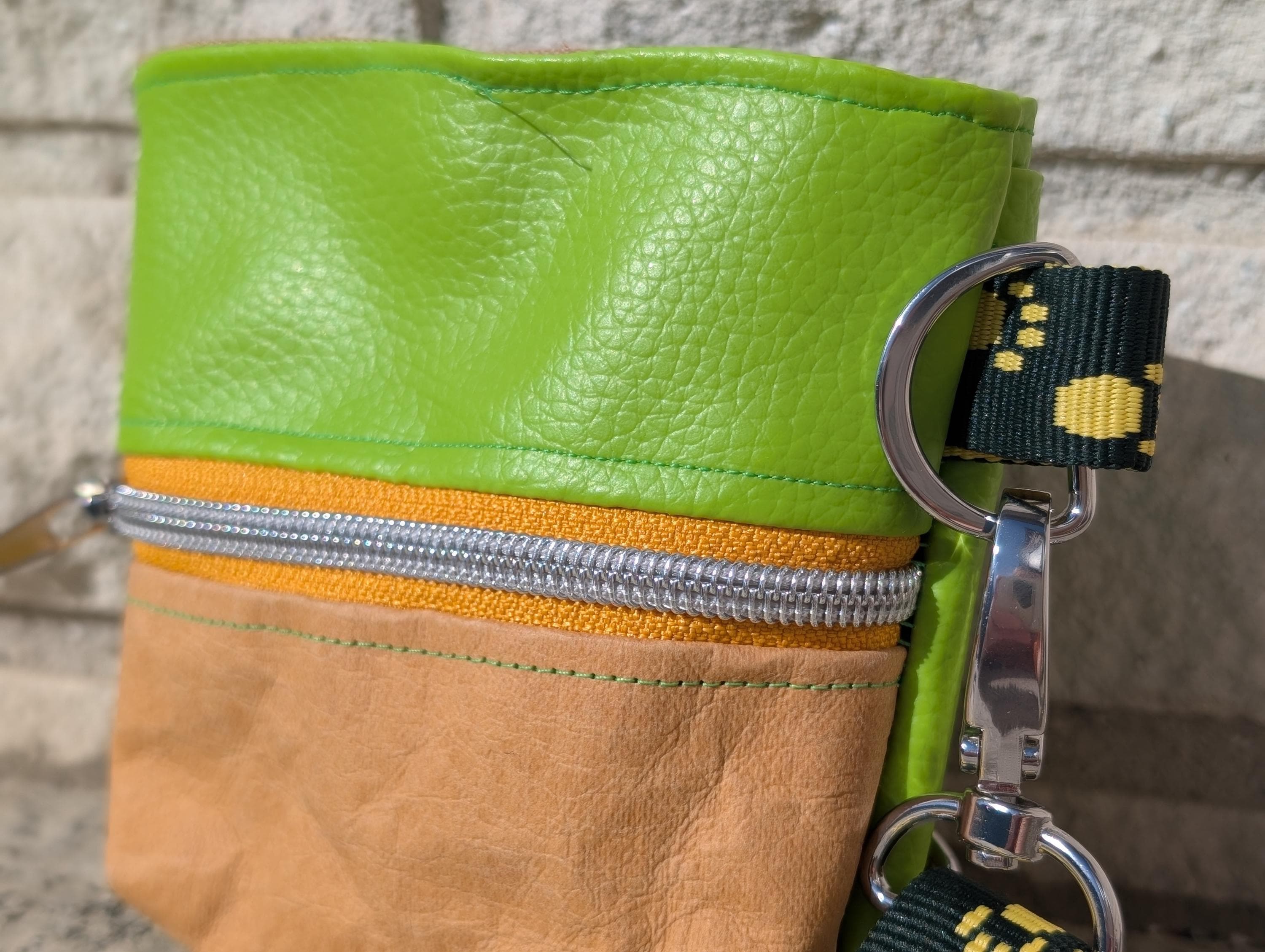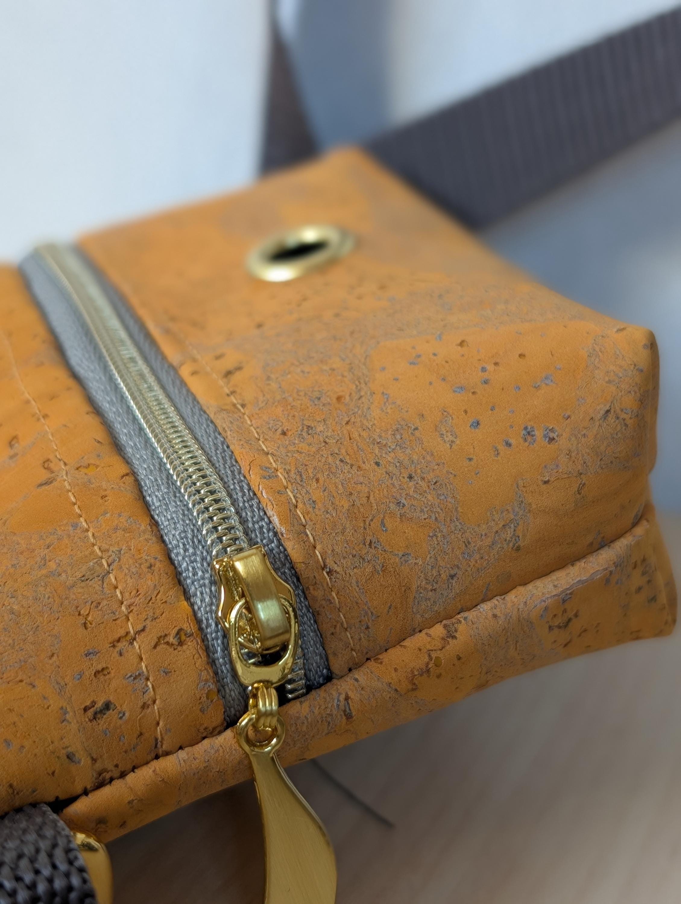 Du hast die Wahl zwischen Korkstoff oder veganem Leder beim Außenstoff. Das Reißverschlussfach kannst du nach Wahl auch aus Papierleder erhalten. Den Innenstoff wähle ich für dich passend aus.