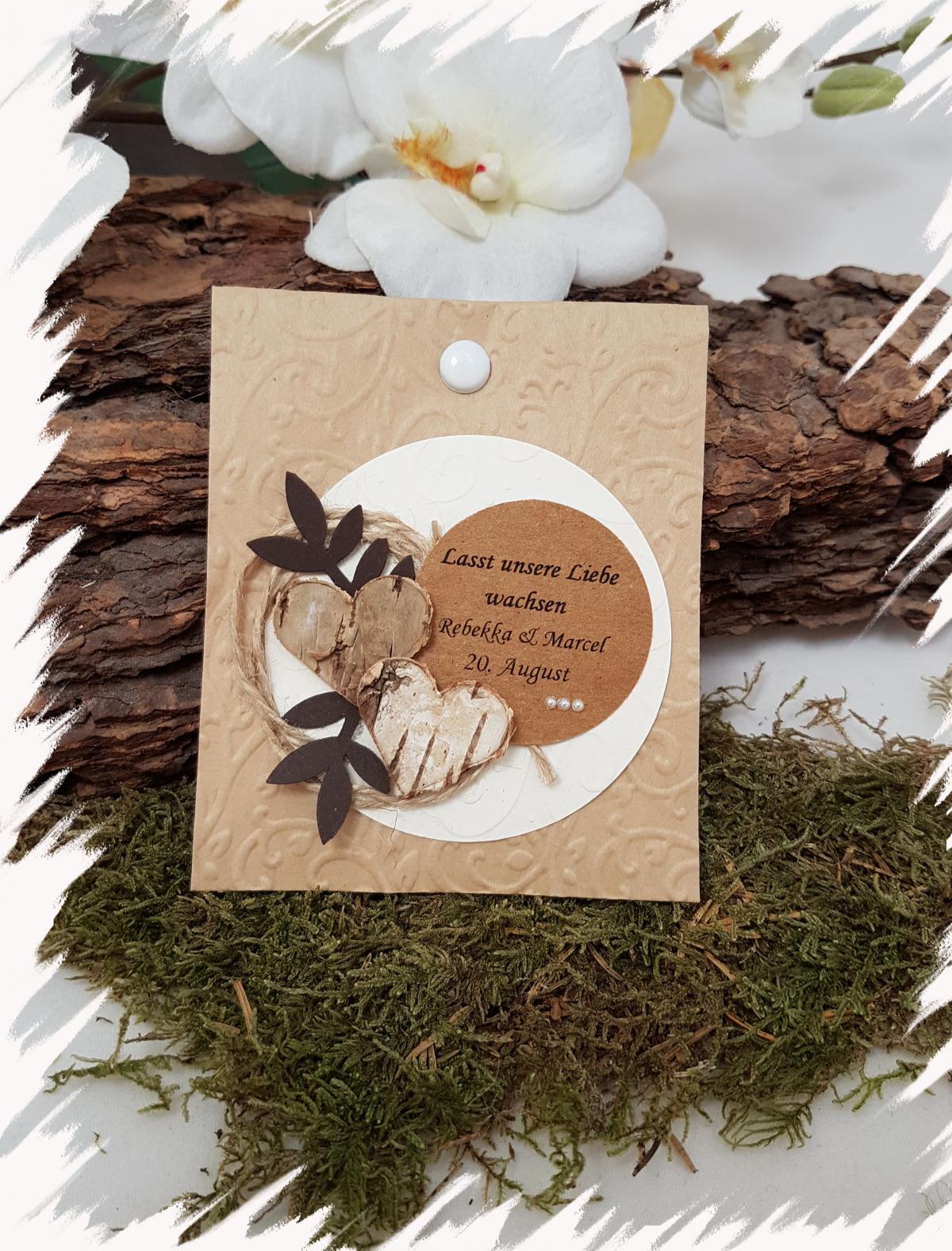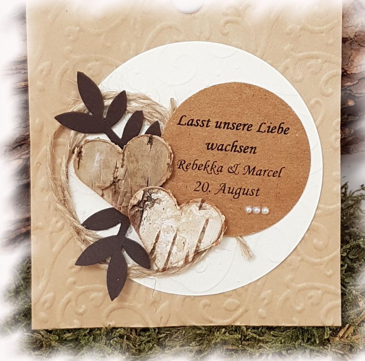 ♥ Ich habe ein Tütchen aus Kraftpapier geprägt, es mit einem Teelöffel (ca.4gr.) Wildblumensamen gefüllt, verziert ist es mit Ranken, zwei Birkenherzen, einem Rupfenband, Perlen und auf den Kreis habe ich "Lasst unsere Liebe wachsen" und die Namen mit Datum gedruckt ... verschlossen wird es mit einem Brad.
