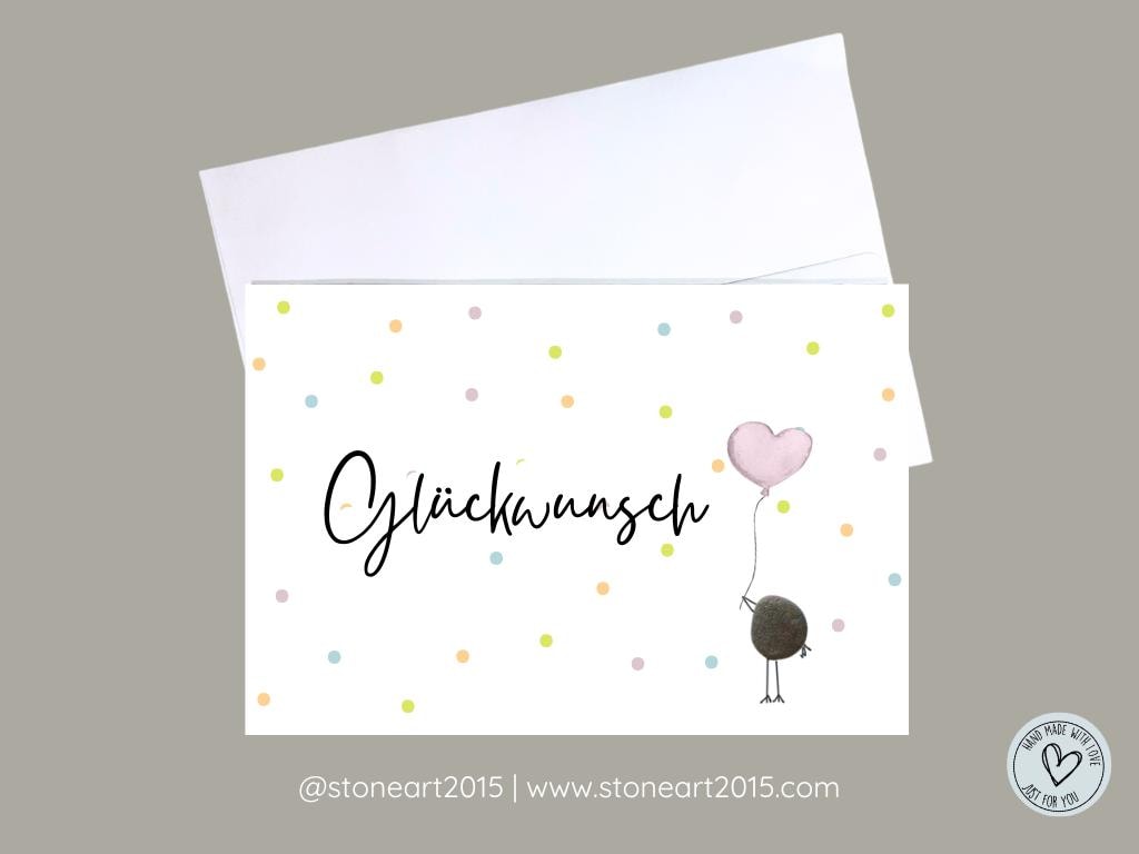 Allgemeine Informationen zur Grusskarte & Versand Ein echtes Unikat - handgefertigt nach deiner Bestellung. Echte Kieselsteine werden von Hand auf die Karte aufgebracht und bilden das Herzstueck des Motivs. Der restliche Hintergrund ist gedruckt und einzelne Details sind von Hand gezeichnet. Bei einigen Motiven ergaenzen getrocknete Blumen das Bild. Personalisierung: Teile mir deine Wuensche - z. B. Namen, Daten oder einen persoenlichen Text - beim Checkout im Nachrichtenfeld oder per Nachricht mit. Ich setze deine Vorstellungen gerne um, soweit es machbar ist.