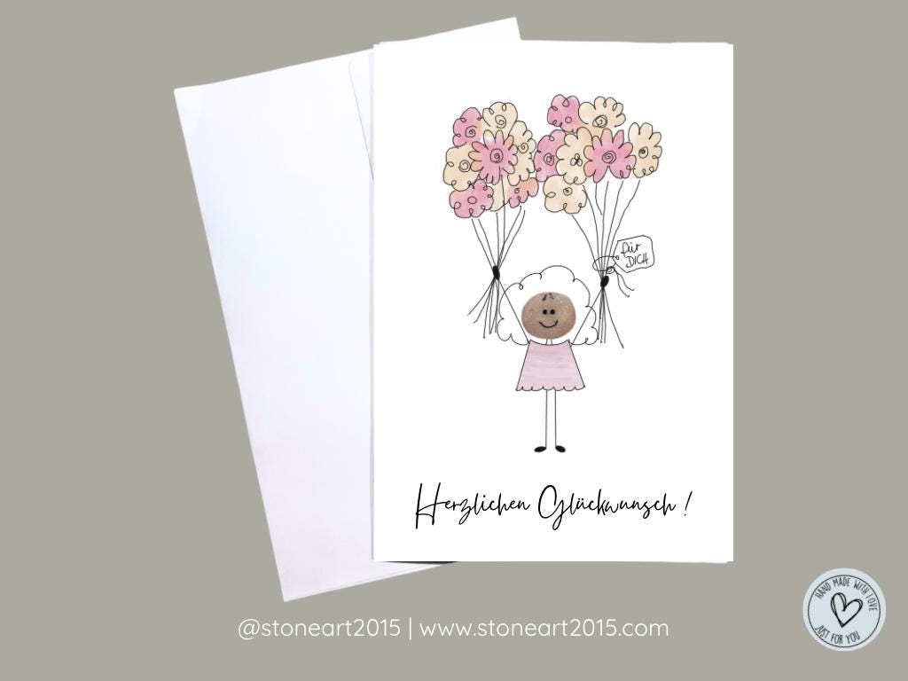 Geburtstage kommen und gehen - aber ein wirklich besonderes Geschenk bleibt im Gedaechtnis. Diese handgefertigte Grusskarte - ein persoenliches Praesent, das von Herzen kommt. Allgemeine Informationen zur Grusskarte & Versand Ein echtes Unikat - handgefertigt nach deiner Bestellung. Echte Kieselsteine werden von Hand auf die Karte aufgebracht und bilden das Herzstueck des Motivs. Der restliche Hintergrund ist gedruckt und einzelne Details sind von Hand gezeichnet. Bei einigen Motiven ergaenzen getrocknete Blumen das Bild. Personalisierung: Teile mir deine Wuensche - z. B. Namen, Daten oder einen persoenlichen Text - beim Checkout im Nachrichtenfeld oder per Nachricht mit. Ich setze deine Vorstellungen gerne um, soweit es machbar ist.
